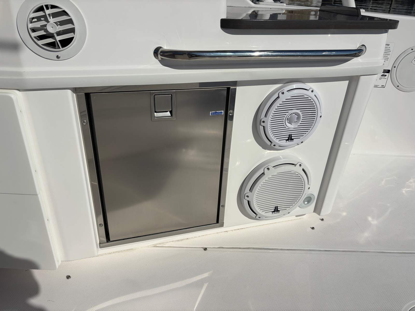 •Fiberglass hardtop with powder-coated aft legs, includes LED lights, spreader lights, radio box and speakers