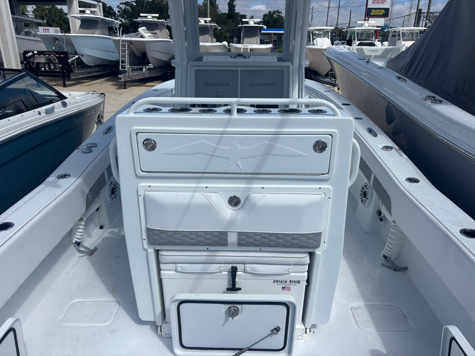 This center console boat is packed with features designed to enhance your time on the water. The Mercury VesselView 502 Display puts vital engine information and system controls at your fingertips, ensuring you stay informed and in command at all times. The White Motor Upgrade adds a touch of style and sophistication, complementing the boat’s sleek lines and modern aesthetic.For anglers, the Gem Bluewater Outrigger Bases and Gem 18' External Black Poles provide the ultimate setup for trolling and offshore fishing. Five rod holders mounted on the back of the hardtop keep your gear organized and within easy reach, while the hardtop itself offers shade and protection from the elements. Three LED spreader lights illuminate the deck for early morning launches or late-night returns, ensuring you can fish safely and comfortably at any hour.