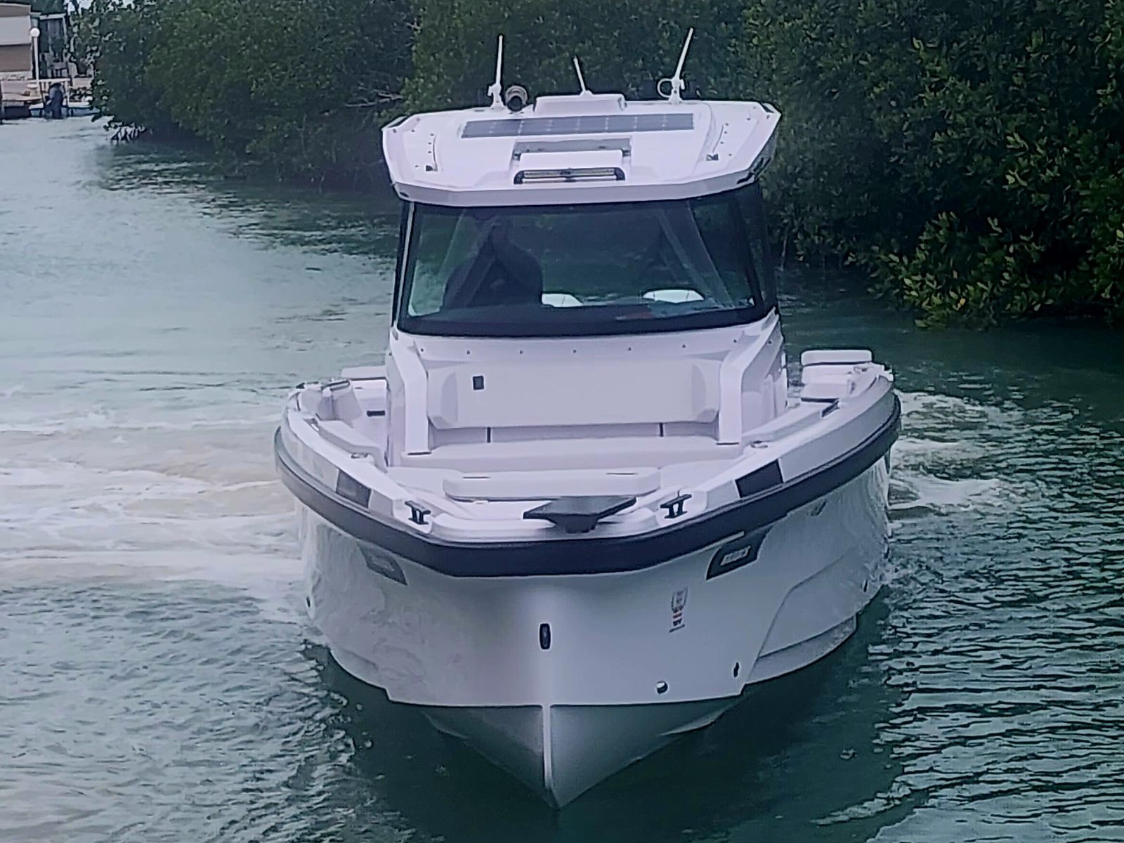 The Axopar 29 CCX is packed with premium features and thoughtful details that set it apart from other center console boats for sale. Onboard fittings include multicabin openable portlights, allowing for excellent ventilation and natural light throughout the interior spaces. The navigation experience is elevated with the twin chart plotter Simrad NSX 12″ option, providing advanced navigation capabilities and intuitive controls for safe and efficient journeys.For those who appreciate style and exclusivity, the BRABUS line trim package - CCX adds a touch of luxury and distinctive flair, while the black rub rail enhances both aesthetics and protection. The fore deck setup is designed for ultimate comfort and versatility, featuring a front U-sofa package in a sophisticated chalk color, a bow table, and a bow U-sofa, creating an inviting space for socializing, dining, or simply soaking up the sun.Optional equipment such as underwater lights add a dramatic effect for evening cruises, while the wash down pump ensures easy cleaning and maintenance after a day of fun on the water. The Axopar 29 US version is tailored for the needs of American boaters, ensuring compatibility and convenience for a wide range of uses.