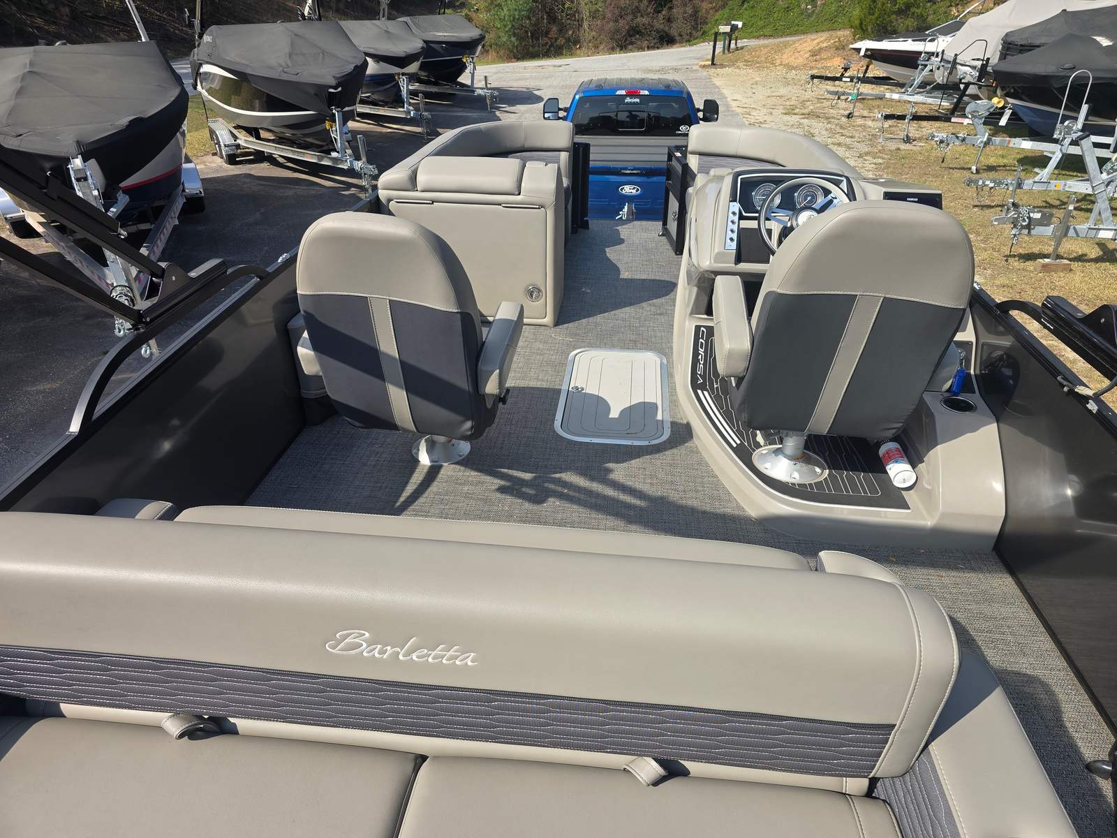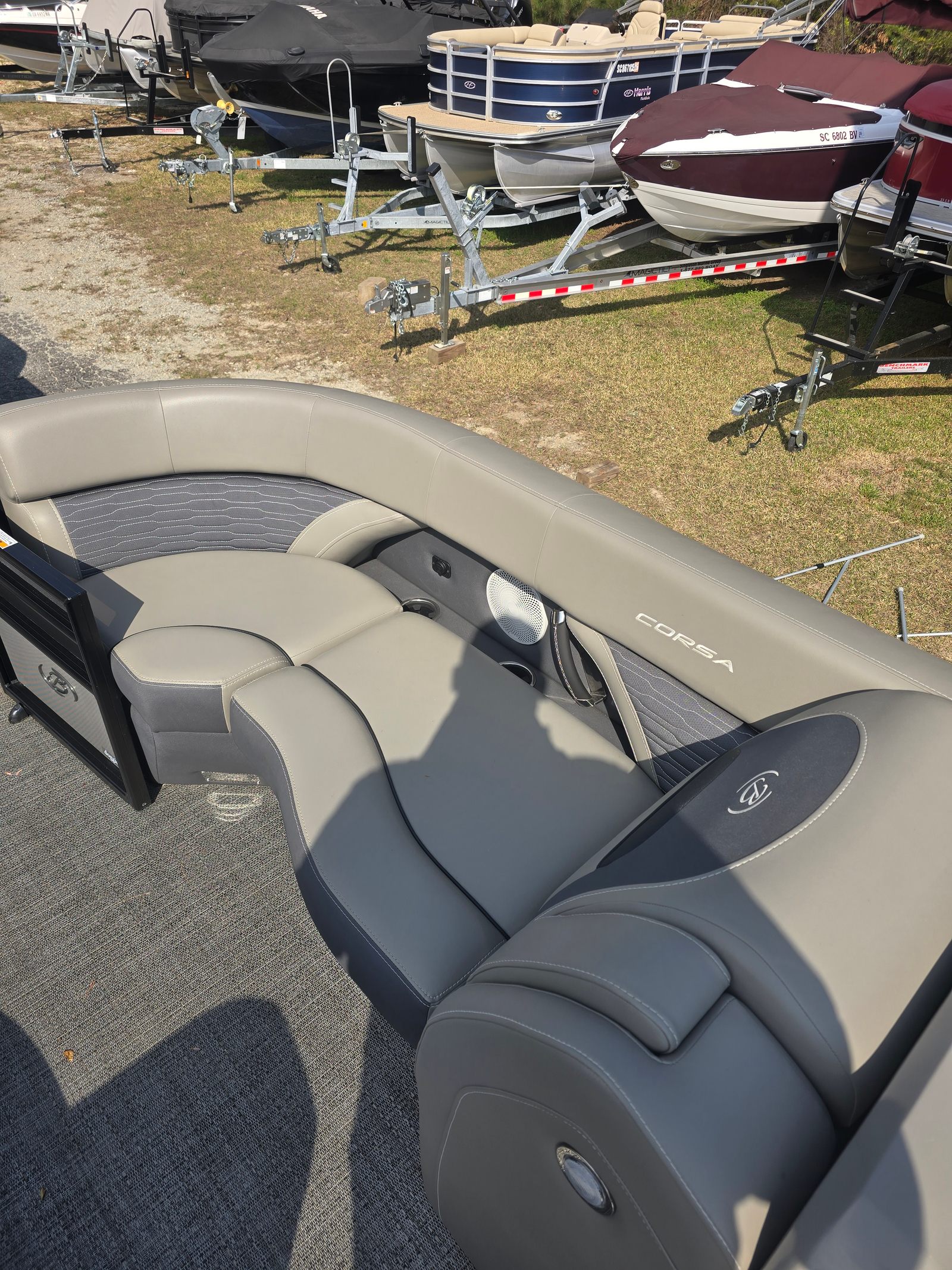 The 2024 Barletta Corsa 23UC pontoon boat is packed with features that enhance comfort, convenience, and enjoyment on the water. Its 25-foot length provides ample space for guests to relax, socialize, and soak up the sun. The thoughtfully designed seating arrangements ensure everyone has a comfortable spot, whether you’re hosting a lively gathering or enjoying a peaceful day with loved ones.Special features on the Barletta Corsa 23UC include a modern helm station with intuitive controls, premium upholstery, and a versatile layout that adapts to your needs. The pontoon’s innovative design maximizes usable space, allowing for easy movement throughout the deck. The Corsa 23UC’s attention to detail is evident in every aspect, from the stylish exterior to the high-quality finishes inside.