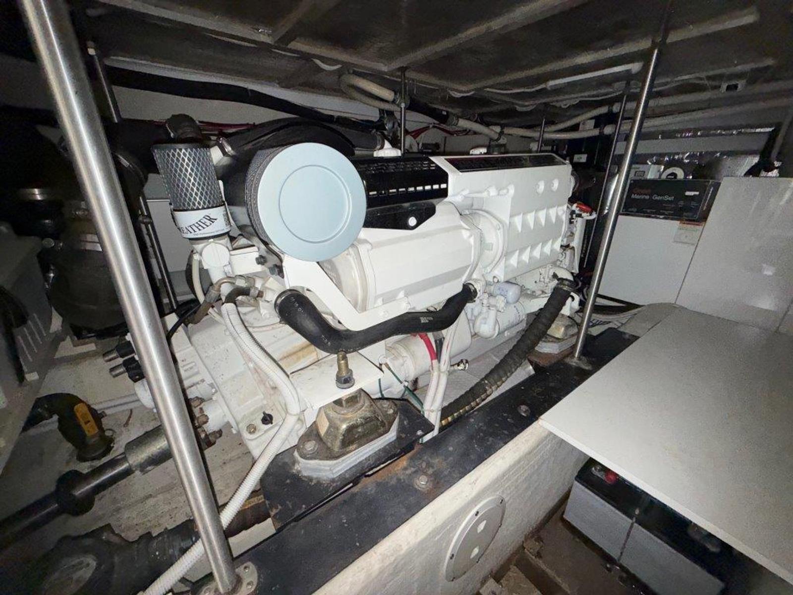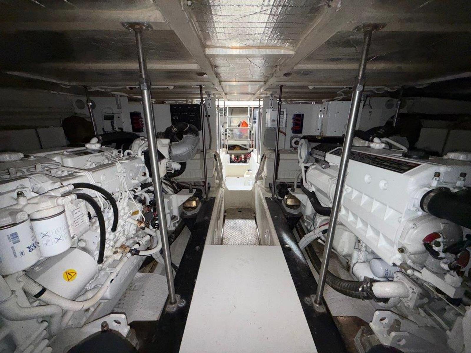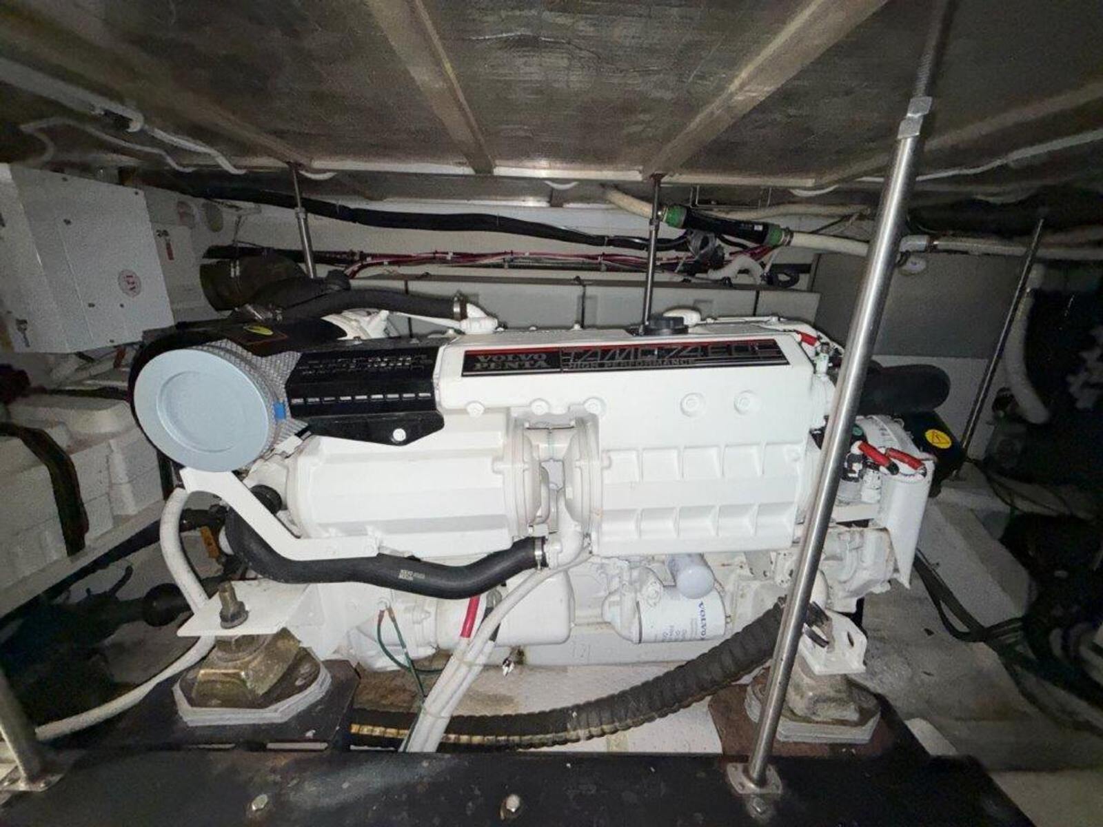 Powered by twin Volvo TAMD74P-D diesel engines (480 HP each) with just over 600 hours, “Ricky Bobby” has been fully serviced by a local mechanic, with service records available. The Onan 12.5kW generator shows 740 hours and runs smoothly. The engine room is exceptionally clean and offers easy access to all systems.