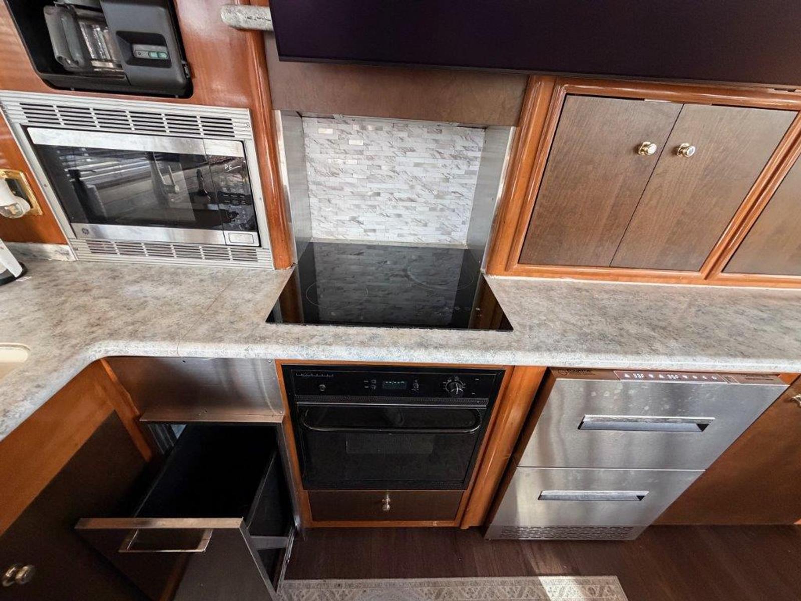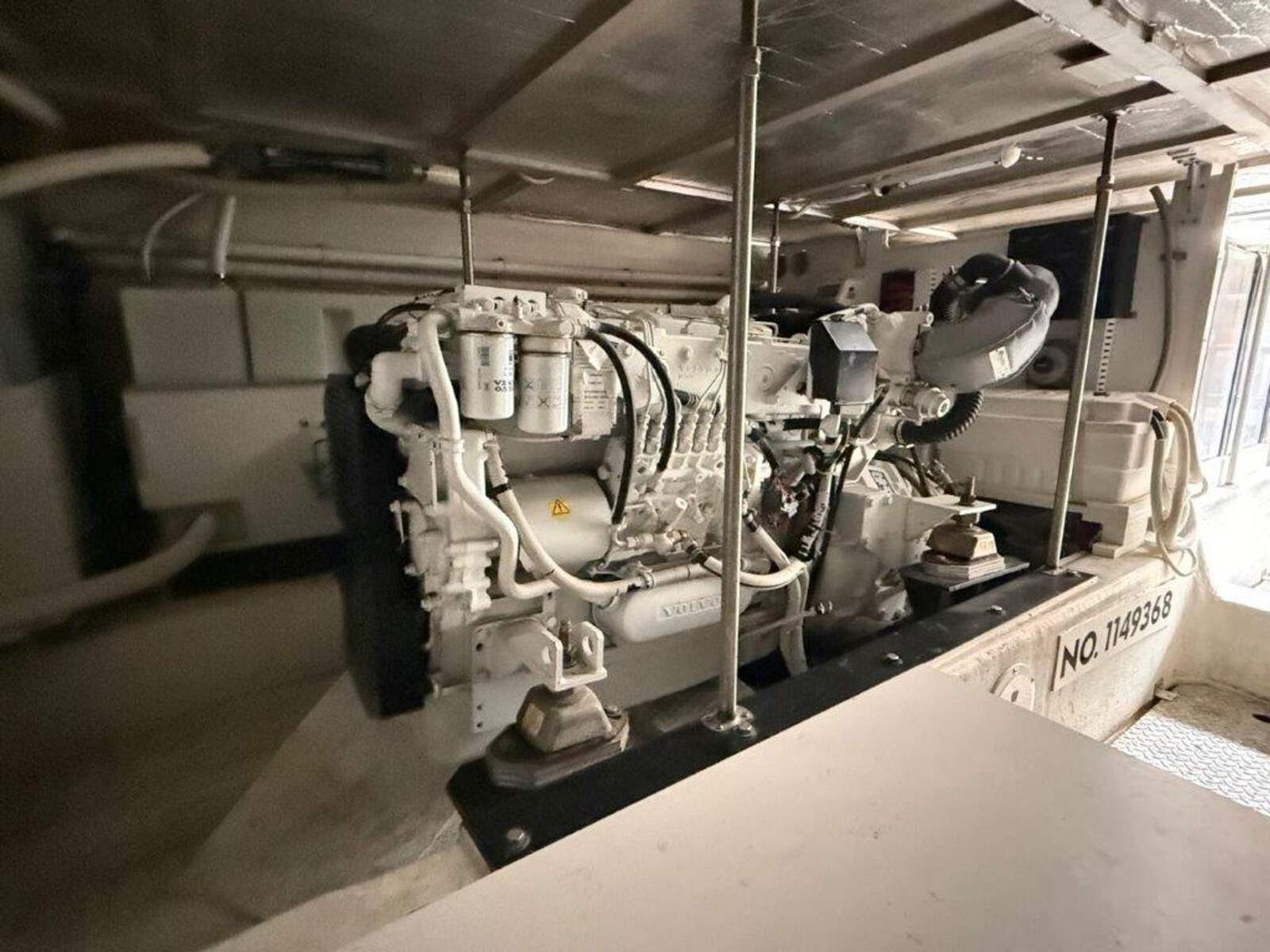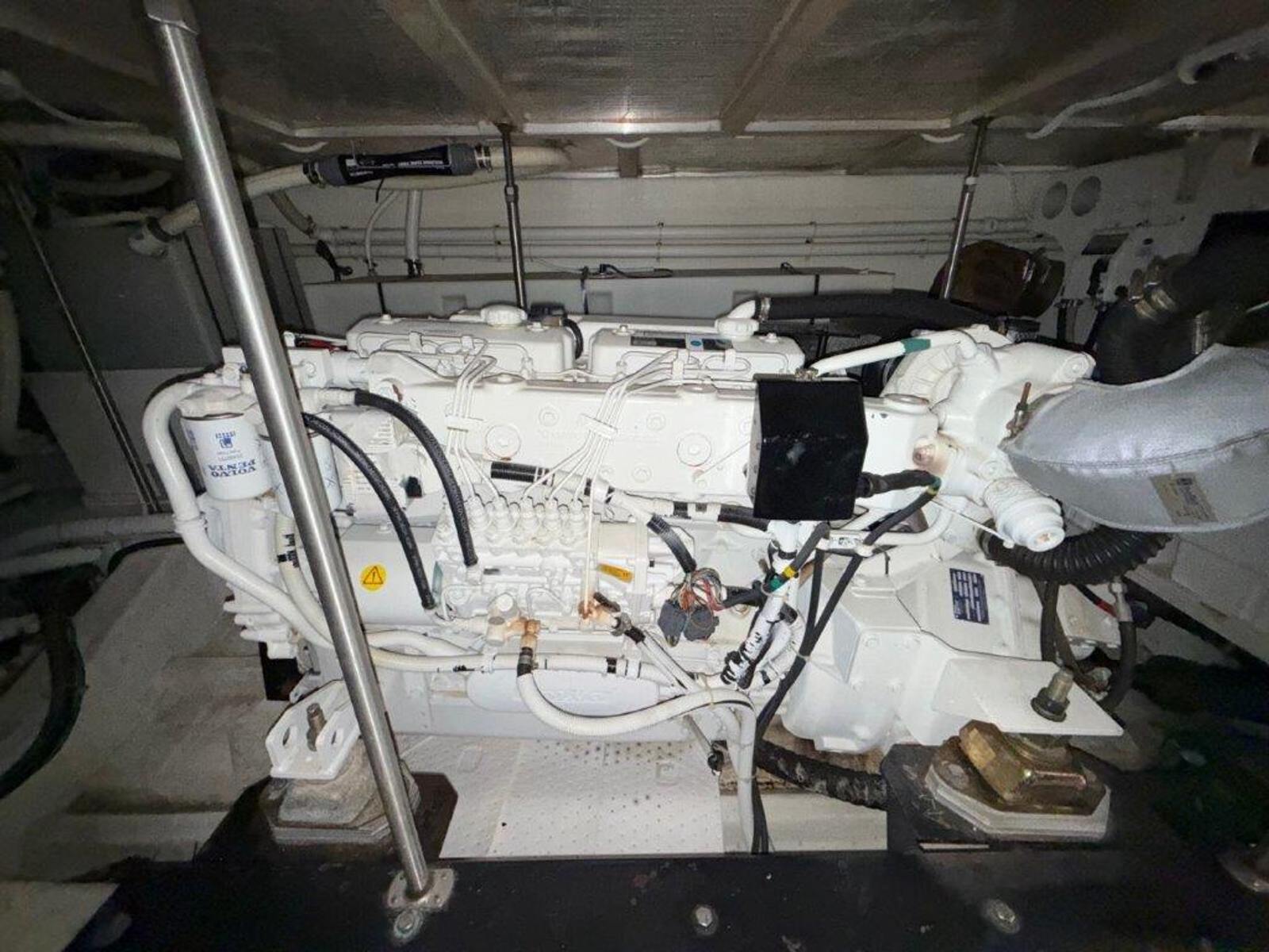 Powered by twin Volvo TAMD74P-D diesel engines (480 HP each) with just over 600 hours, “Ricky Bobby” has been fully serviced by a local mechanic, with service records available. The Onan 12.5kW generator shows 740 hours and runs smoothly. The engine room is exceptionally clean and offers easy access to all systems.