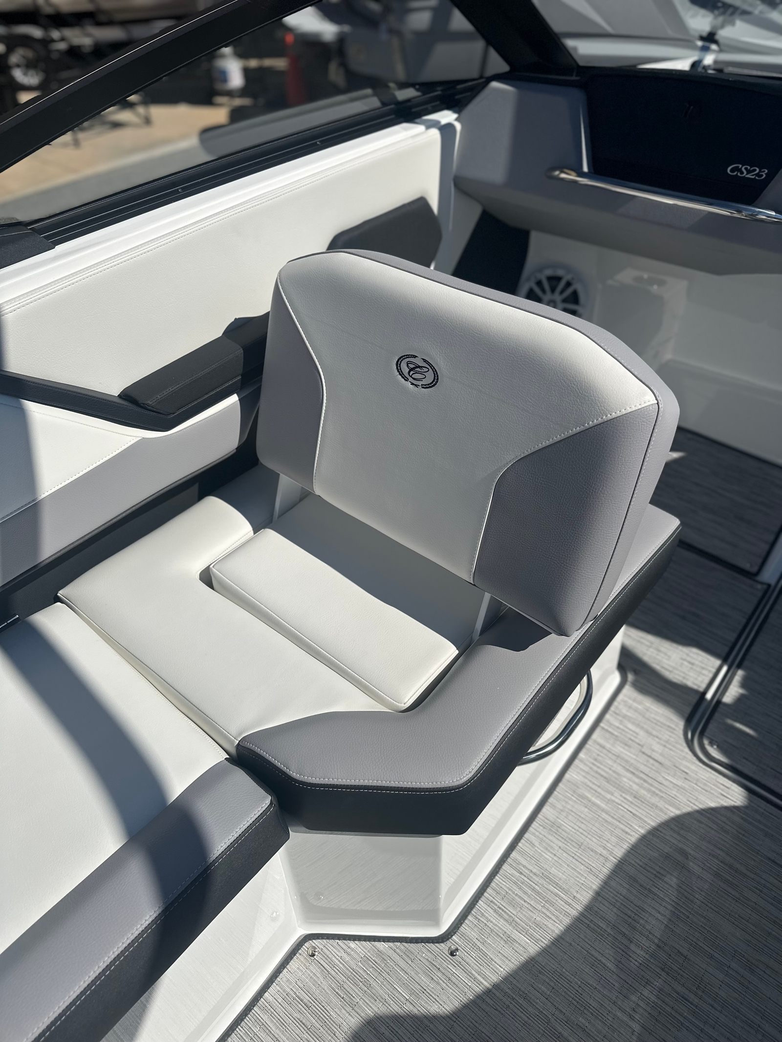 The Cobalt CS23 is designed with practicality in mind, making ownership as enjoyable as the time spent on the water. The battery maintainer and dual battery switch system ensure your boat is always ready to go, reducing downtime and maintenance concerns. The fender clips with lines simplify the docking process, allowing you to secure your boat quickly and easily, even in busy marinas.The durable seagrass floor covering is easy to clean and maintain, providing a comfortable and stylish surface for all your activities. The versatile seating arrangements, including the aft-facing rumble seat, offer flexibility for lounging, entertaining, or simply enjoying the scenery. With its manageable length of just over 23 feet, the CS23 is easy to trailer, launch, and store, making it a practical choice for both new and experienced boaters.