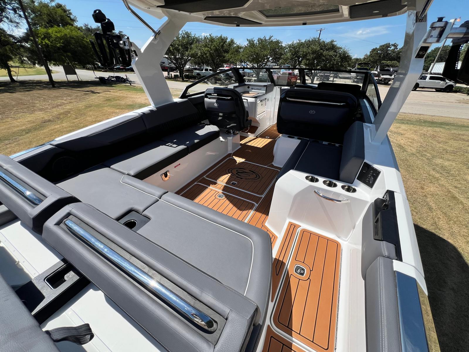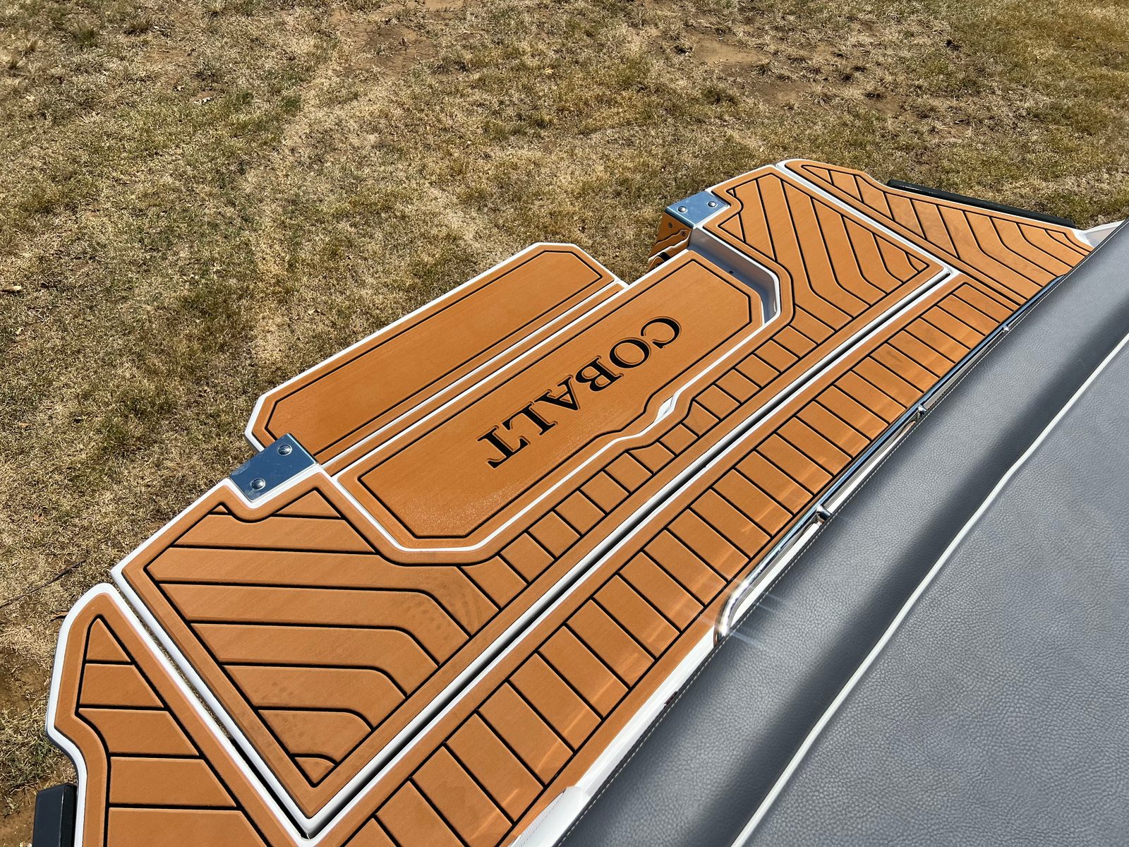 The Cobalt R31 Surf is packed with premium features designed to enhance your boating experience. The striking black arch with a hardtop and electric awning offers shade and protection, while adding a bold visual statement to the boat’s silhouette. The battery maintainer/charger ensures your vessel is always ready for action, keeping your systems powered and reliable.A rear-facing camera provides added safety and convenience, making docking and watersports activities easier than ever. The interior is a masterpiece of design, featuring a luxurious blend of caramel, carbon, and ebony tones that create a warm and inviting atmosphere. The closet-watersports storage keeps your gear organized and accessible, while the white dinette table with bow and cockpit receptacles offers a perfect spot for snacks, drinks, or socializing.Comfort is paramount in the R31 Surf, with an electric adjustable seat that allows you to find your ideal position for cruising or relaxing. Fender clips with line and a storage tub make managing your boat’s protection simple and efficient. The flagpole with flag adds a touch of classic nautical charm, completing the boat’s sophisticated look.
