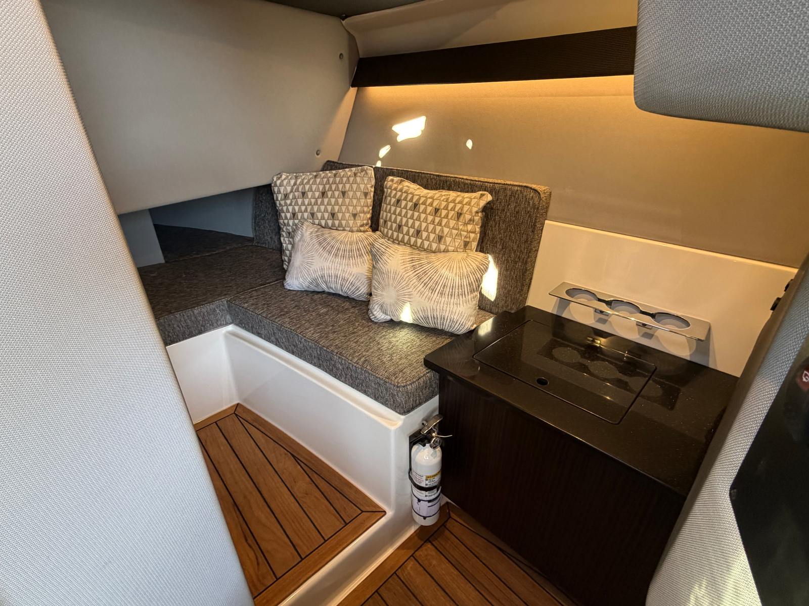 The Cobalt R33 Surf is designed with practicality in mind, offering solutions that make ownership both enjoyable and convenient. The spacious layout provides ample storage for gear, water toys, and personal items, keeping the deck clutter-free and organized. The easy-access boarding door simplifies docking and boarding, while the dual engines offer reliable power and maneuverability for navigating marinas and tight spaces.Fuel efficiency is a hallmark of Cobalt engineering, ensuring that you can spend more time enjoying the water and less time refueling. The battery maintainer/charger supports hassle-free maintenance, so you’re always ready for your next outing. The dinette table with multiple receptacles transforms the cockpit and bow into versatile spaces for dining, games, or socializing, adapting to your needs throughout the day.