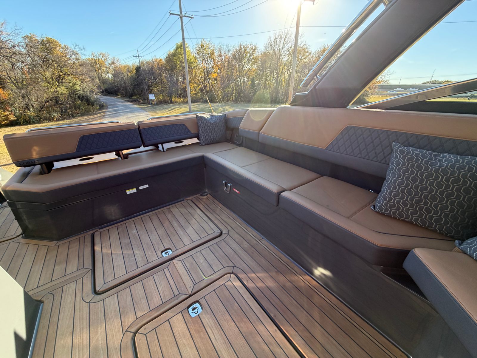 Powering the Cobalt R33 Surf are two robust engines, delivering a combined 860 horsepower for an exhilarating ride. This dual-engine setup ensures smooth acceleration, responsive handling, and the ability to tackle a variety of water conditions with ease. Whether you’re carving through waves, cruising at high speeds, or enjoying a leisurely day on the water, the R33 Surf’s performance capabilities are second to none. The advanced surf technology integrated into this Bowrider allows for customizable wave creation, making it a top choice for watersports enthusiasts who want to master wake surfing, wakeboarding, or simply enjoy the thrill of powerful propulsion.