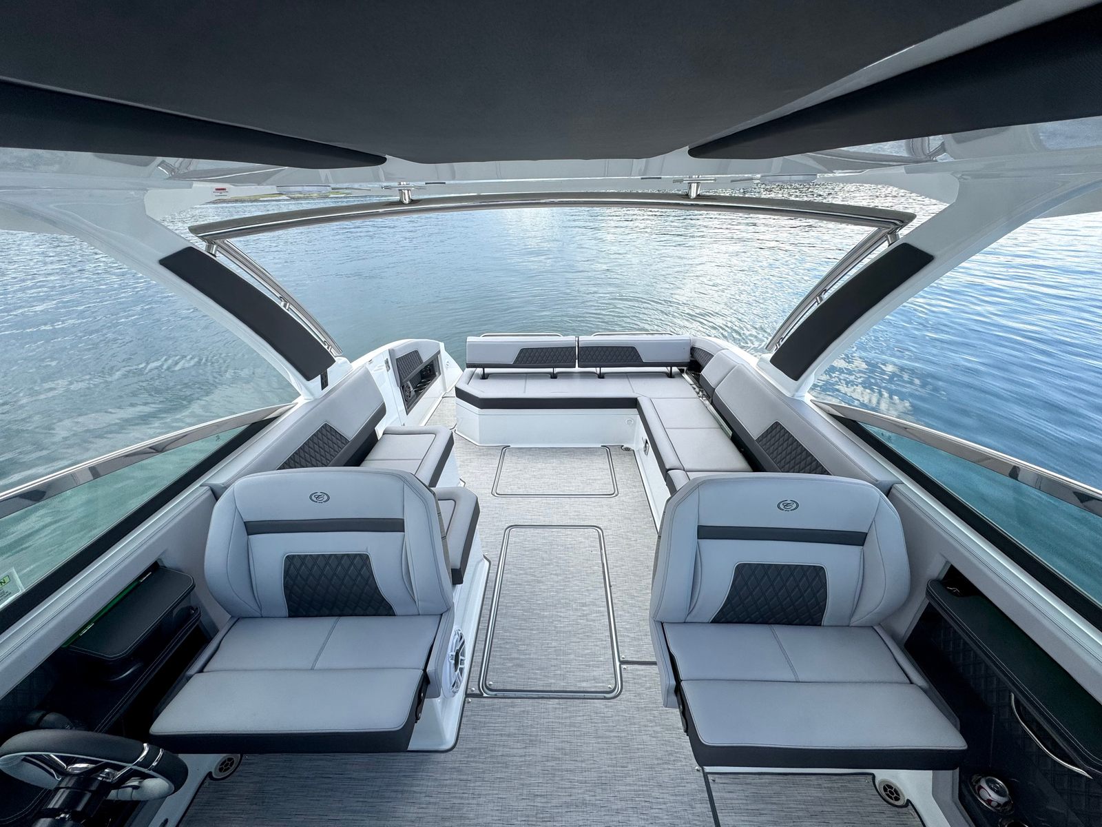 • Seagrass flooring throughout cabin, helm, bow, and cockpit