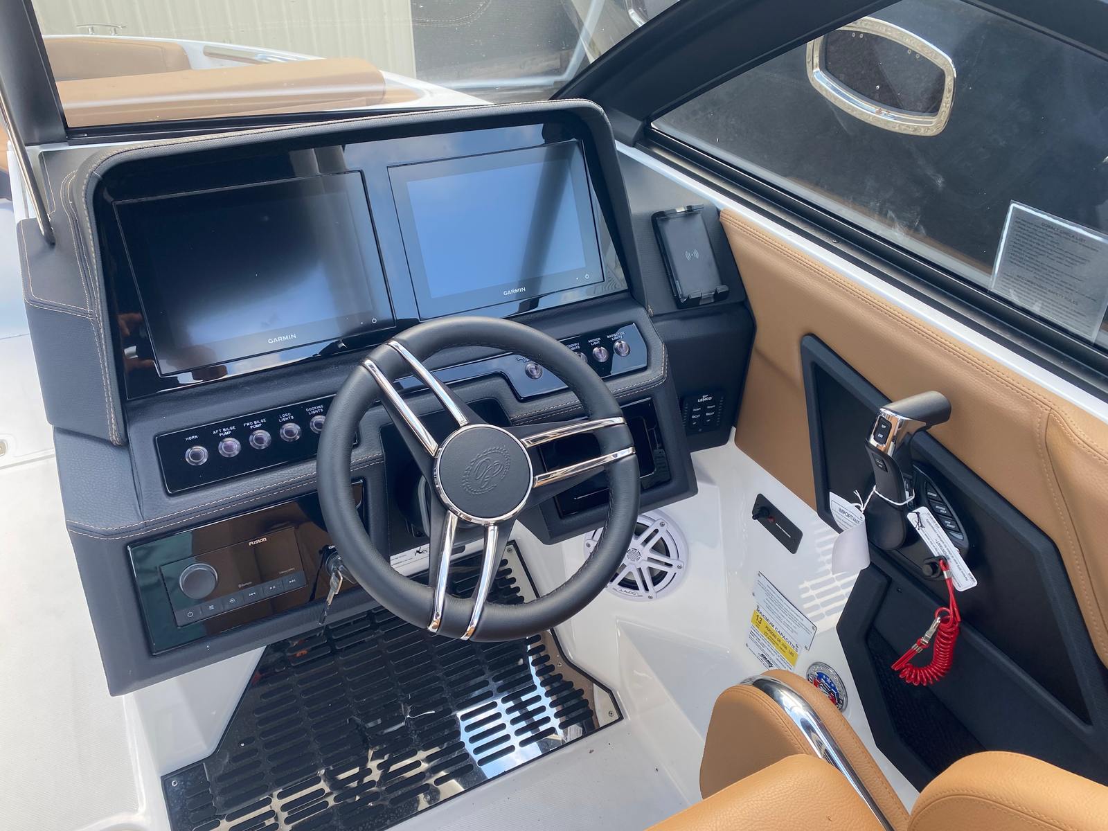 The 2025 Cobalt R4 OB is loaded with special features that enhance both style and functionality. Stainless steel docking lights provide superior visibility and a touch of elegance, making nighttime arrivals and departures safer and more stylish. The black leather and stainless steel steering wheel offers a luxurious feel and precise control, while the battery maintainer/charger ensures your boat is always ready for action.The striking graphite gray accent stripe and white hull bottom create a sophisticated exterior profile, complemented by the ebony bow tonneau cover. Inside, the caramel and carbon interior delivers a warm, inviting atmosphere, perfect for relaxing or entertaining guests. The aft-facing rumble seat is ideal for lounging at anchor or watching the action behind the boat, and the ski tow pylon opens up a world of water sports possibilities. The battery switch with ACR-dual adds an extra layer of convenience and safety, ensuring you have reliable power management on every trip.