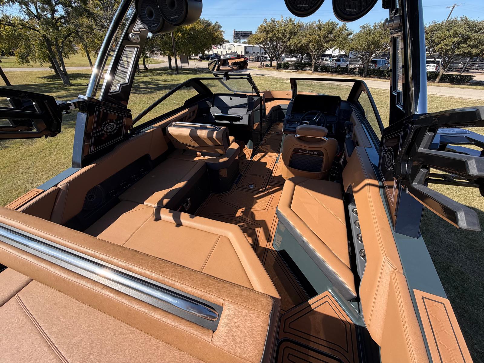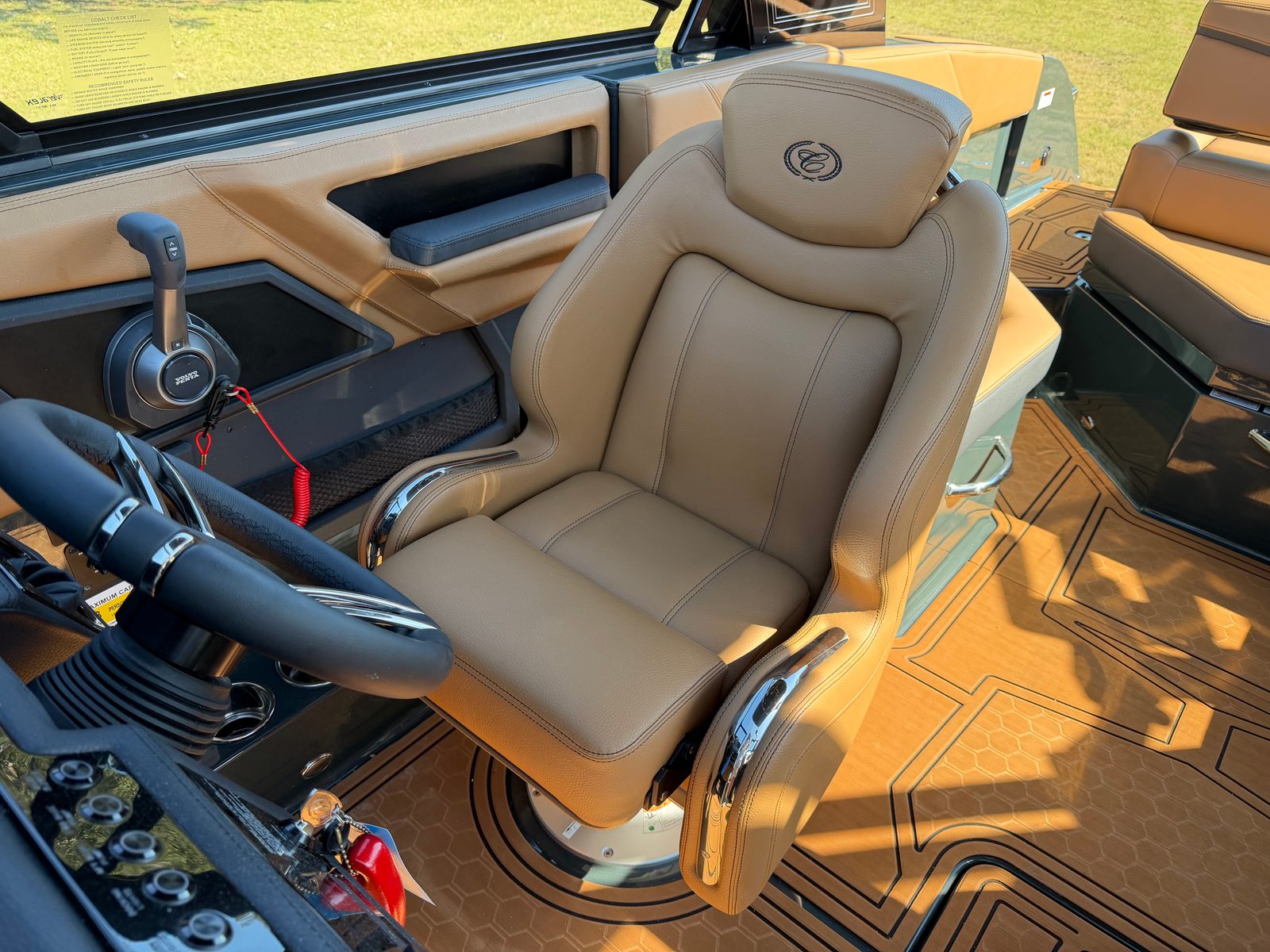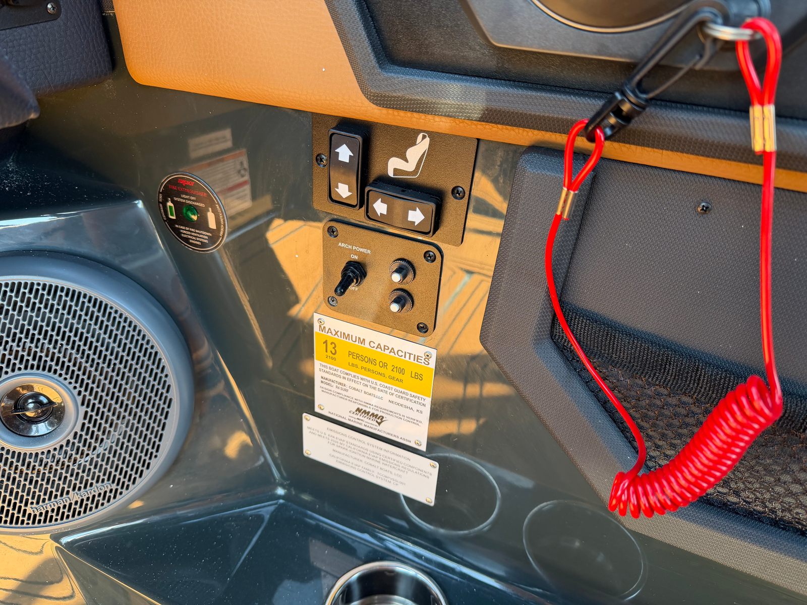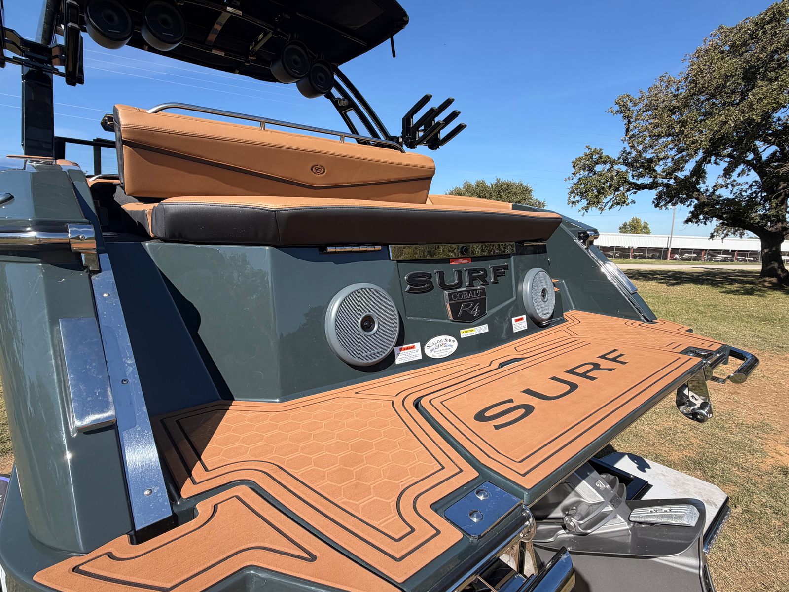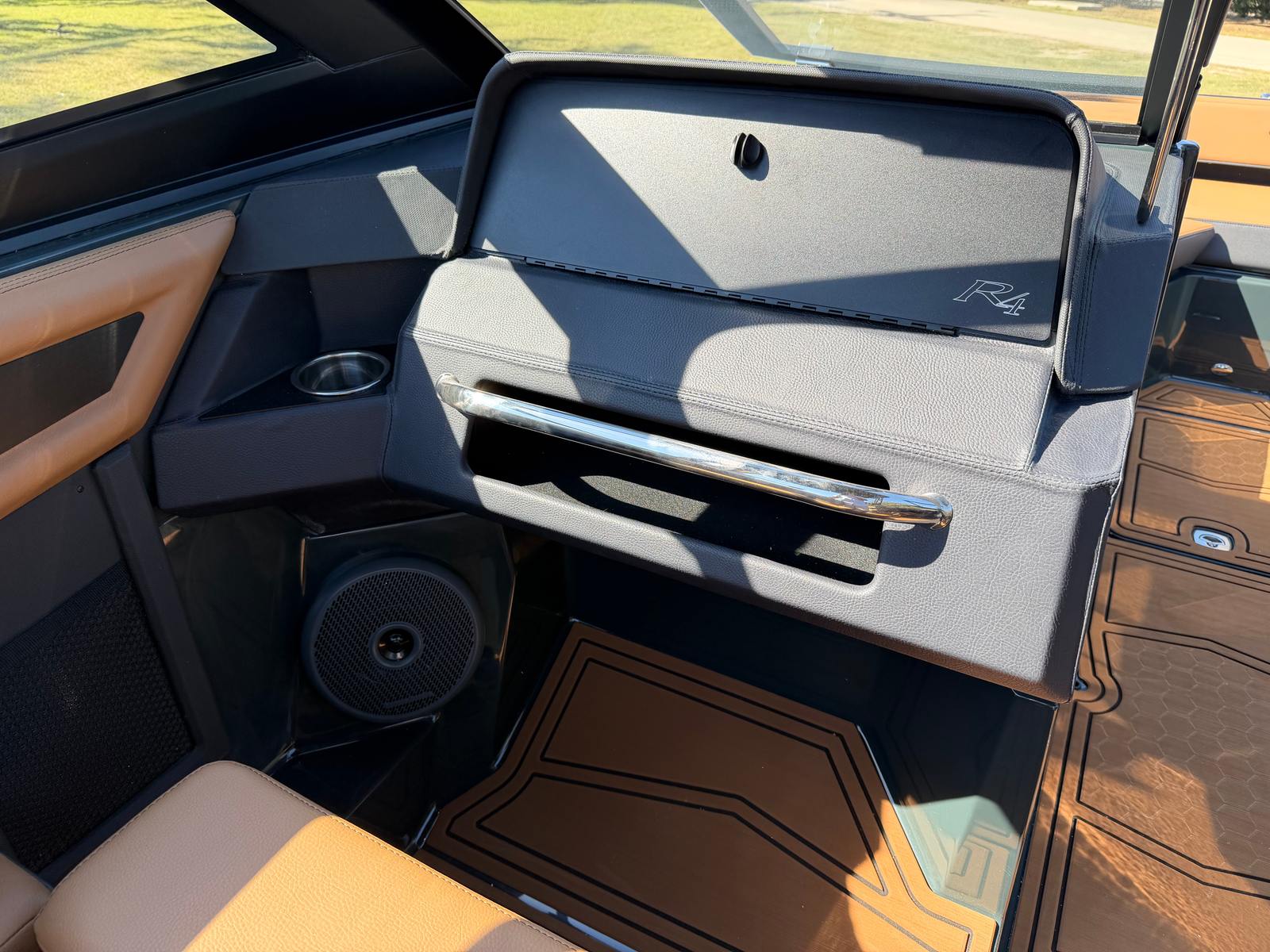 Step aboard the Cobalt R4 Surf and discover a host of premium features designed to enhance every moment on the water. The aft facing rumble seat provides a comfortable spot to relax and take in the scenery, while the aft shade sail in sleek black offers protection from the sun without sacrificing style. The air compressor with holder is perfect for inflating water toys or equipment, adding convenience to your adventures.A battery maintainer/charger (110V) ensures your boat is always ready to go, while bow filler cushions create a versatile lounging area up front. The rear-facing camera adds an extra layer of safety and convenience, making docking and maneuvering a breeze. The caramel, carbon, and ebony interior exudes sophistication, complemented by black satin Cobalt letters for a touch of elegance.Enjoy meals and snacks on the water with the solid teak dinette table, complete with a cockpit receptacle for easy setup. Stainless steel docking lights not only enhance visibility but also add a polished look to the boat’s exterior. Every detail of the R4 Surf is crafted with comfort, style, and functionality in mind, ensuring you get the most out of your time on the water.