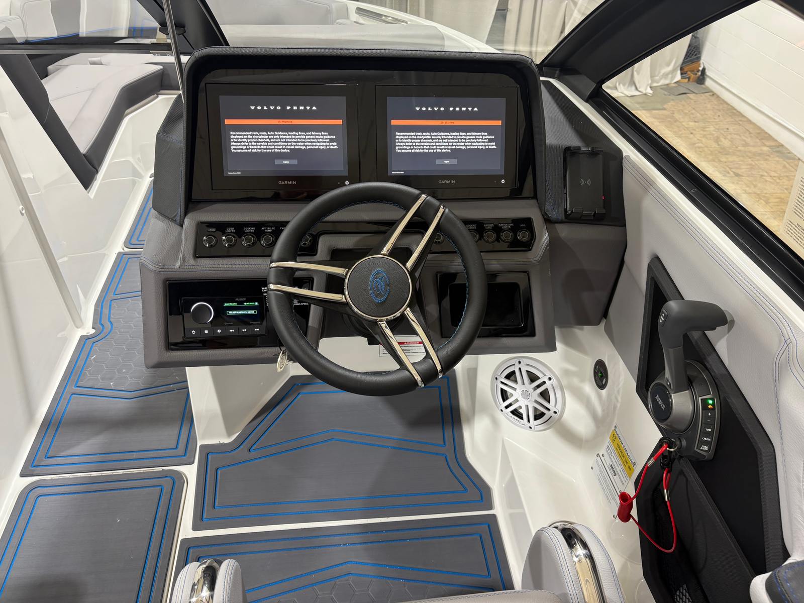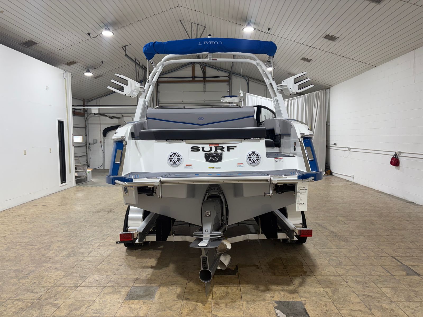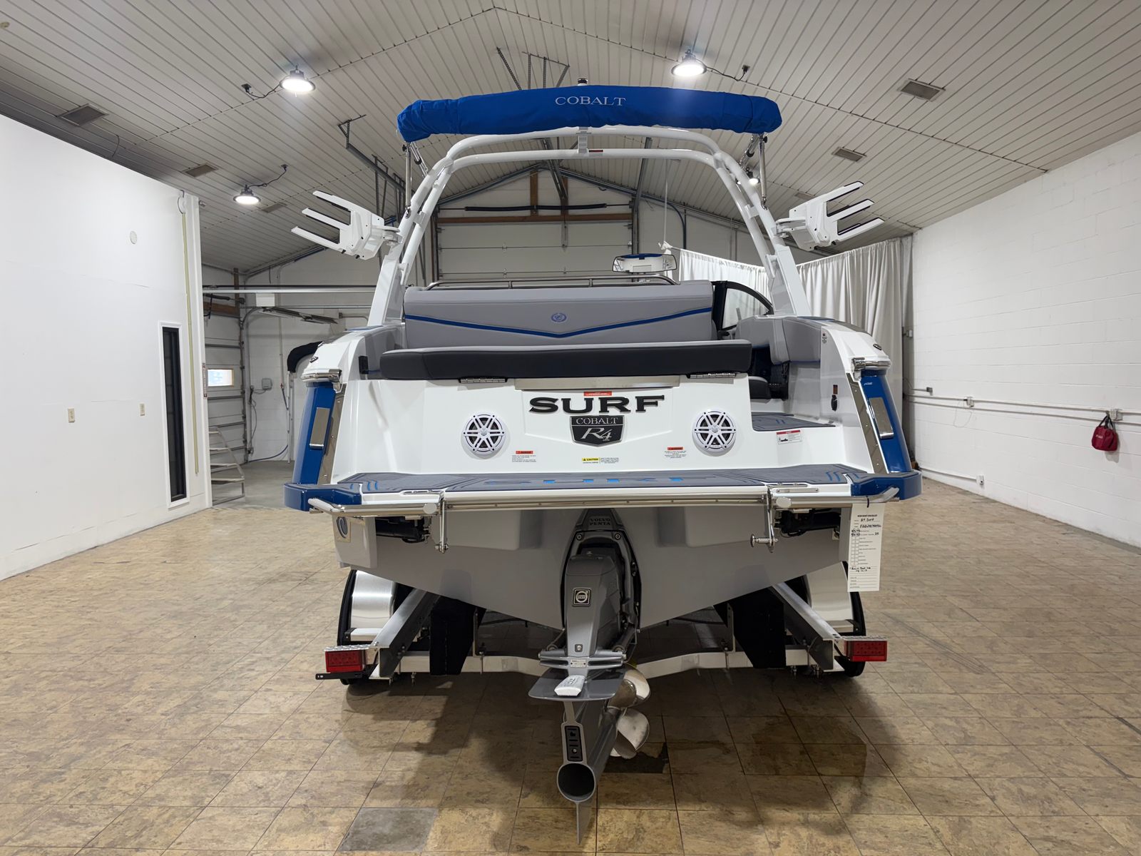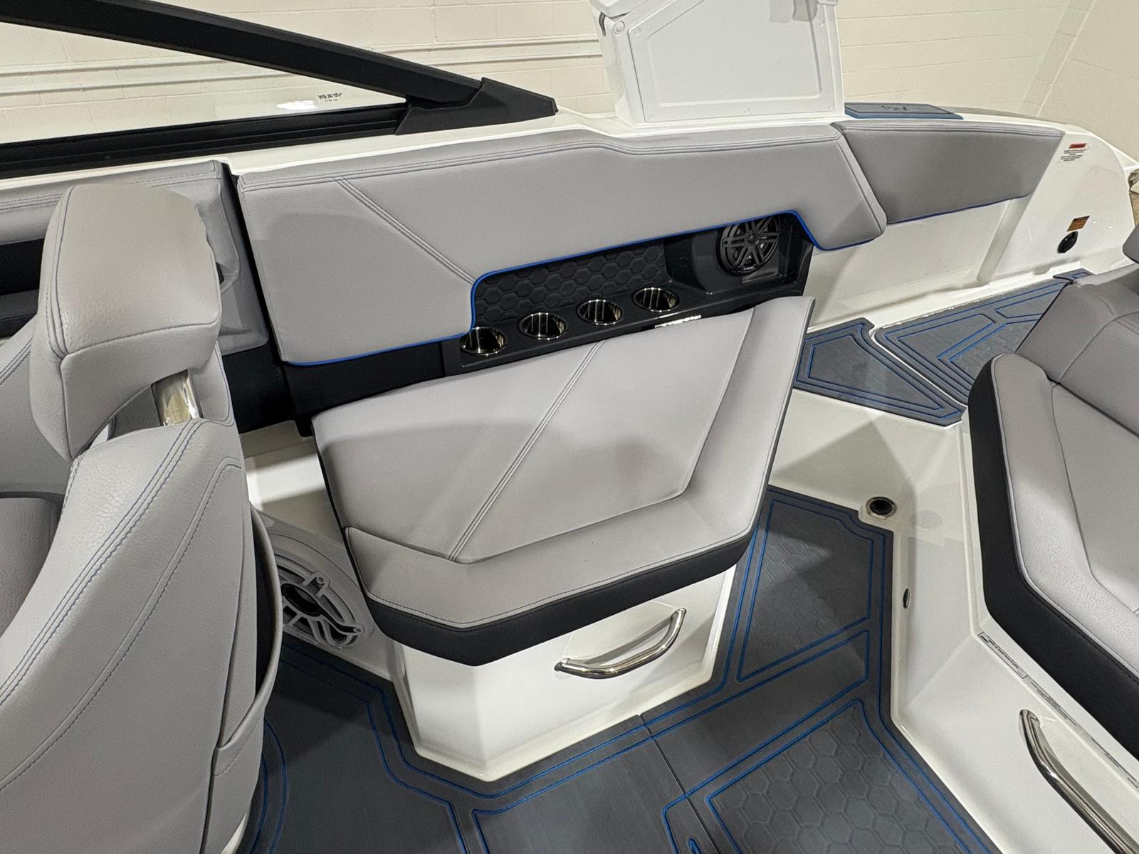 The Cobalt R4 Surf is loaded with special features that enhance both functionality and enjoyment. The aft-facing rumble seat provides a comfortable spot to relax and take in the action behind the boat, making it perfect for socializing or watching water sports. The battery maintainer/charger (110V) ensures your boat is always ready for adventure, while stainless steel docking lights offer both style and safety during evening outings. Fender clips with lines (4) make securing your boat at the dock quick and hassle-free.Inside, the Frost/Slate/Pacific Blue interior is complemented by LED interior accent lighting with customizable R/G/B colors, creating an inviting and vibrant atmosphere for day or night cruising. The glass cockpit, featuring dual Volvo 8610 displays, delivers cutting-edge navigation and system monitoring at your fingertips. The mooring cover with E2 folding arch provides protection and convenience, allowing you to easily cover your boat when not in use.