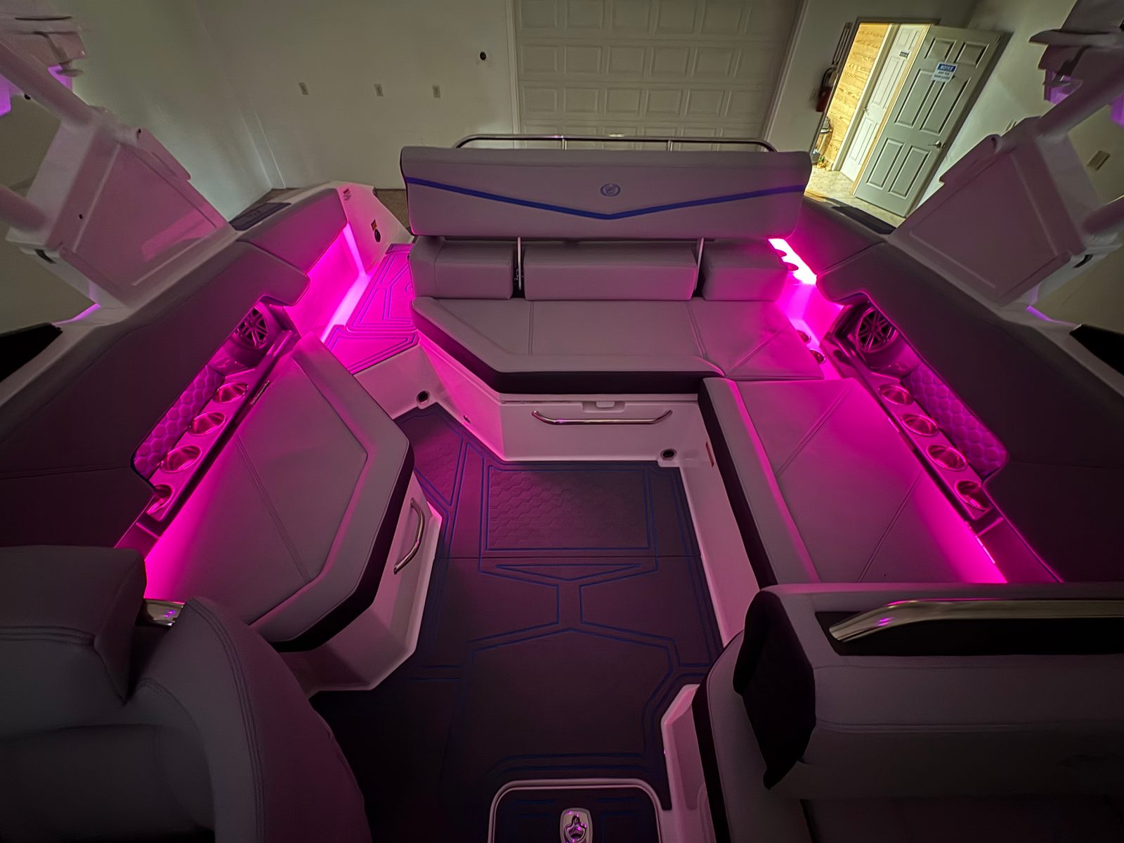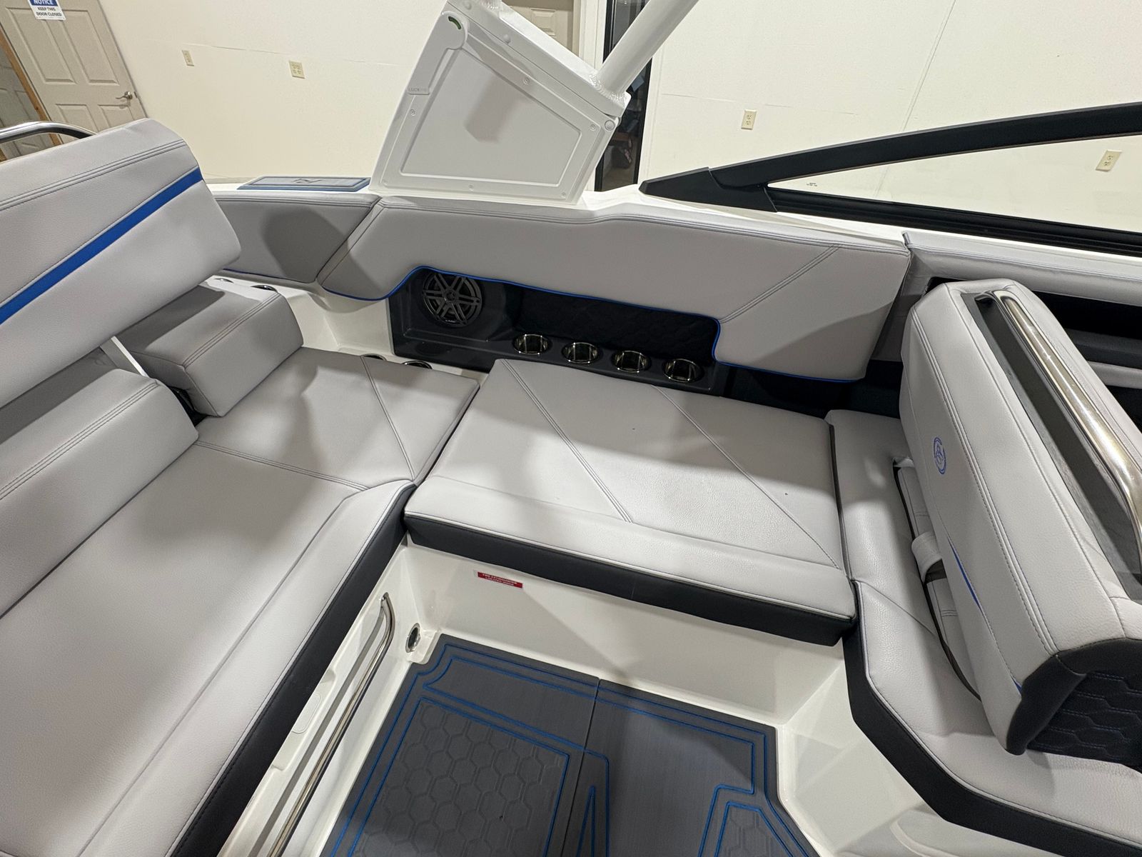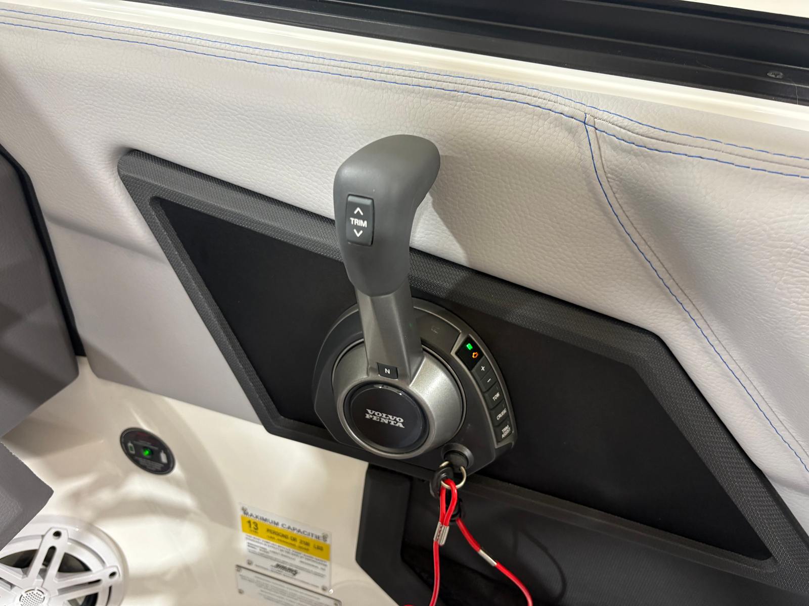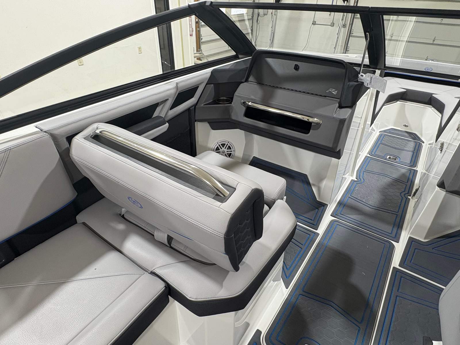 The Cobalt R4 Surf is loaded with special features that enhance both functionality and enjoyment. The aft-facing rumble seat provides a comfortable spot to relax and take in the action behind the boat, making it perfect for socializing or watching water sports. The battery maintainer/charger (110V) ensures your boat is always ready for adventure, while stainless steel docking lights offer both style and safety during evening outings. Fender clips with lines (4) make securing your boat at the dock quick and hassle-free.Inside, the Frost/Slate/Pacific Blue interior is complemented by LED interior accent lighting with customizable R/G/B colors, creating an inviting and vibrant atmosphere for day or night cruising. The glass cockpit, featuring dual Volvo 8610 displays, delivers cutting-edge navigation and system monitoring at your fingertips. The mooring cover with E2 folding arch provides protection and convenience, allowing you to easily cover your boat when not in use.