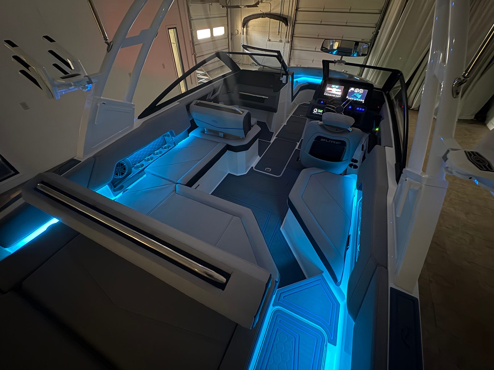 The Cobalt R4 Surf is as practical as it is fun. The battery maintainer/charger keeps your systems powered and ready, reducing maintenance worries and maximizing your time on the water. Stainless steel docking lights and fender clips simplify the docking process, making it easier to secure your boat safely and efficiently. The mooring cover with E2 folding arch offers added protection from the elements, helping to preserve your boat’s pristine condition.The spacious interior provides ample storage for gear, water toys, and personal items, keeping the deck clutter-free and organized. The intuitive glass cockpit with dual Volvo 8610 displays streamlines navigation and system management, allowing you to focus on enjoying your time on the water. Whether you are an experienced boater or new to the lifestyle, the R4 Surf’s user-friendly features make ownership a breeze.