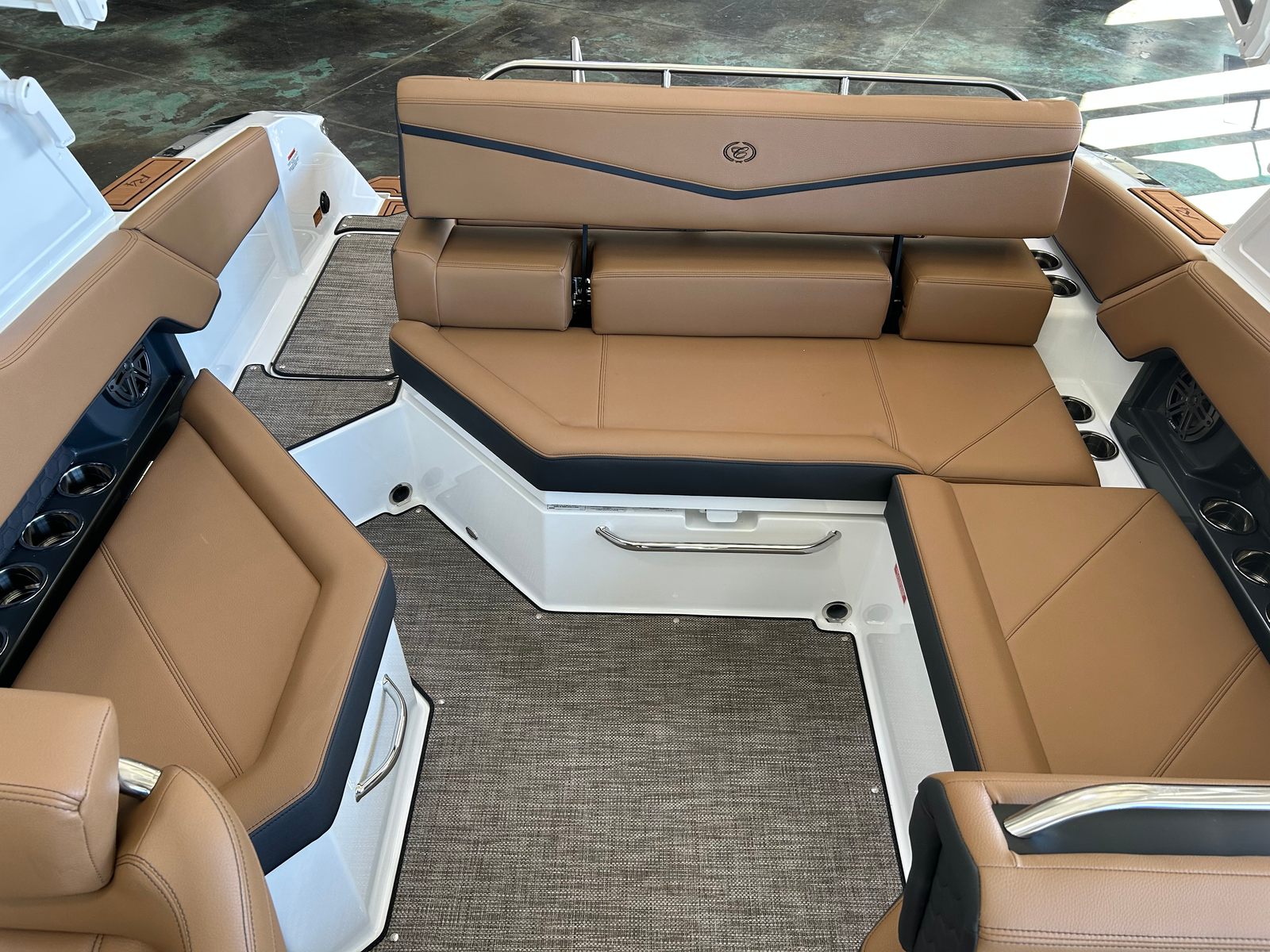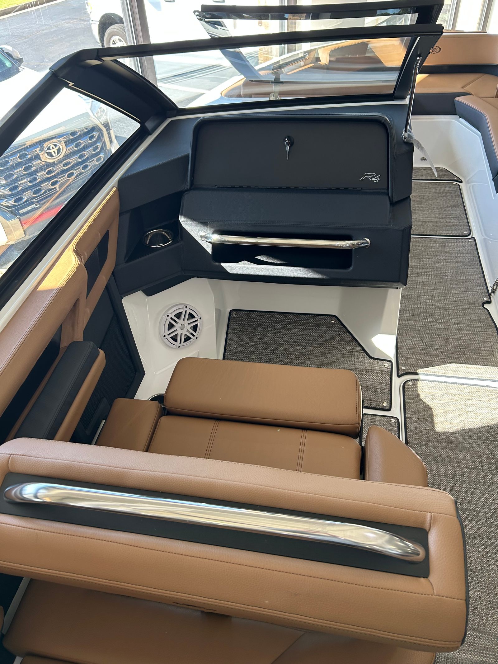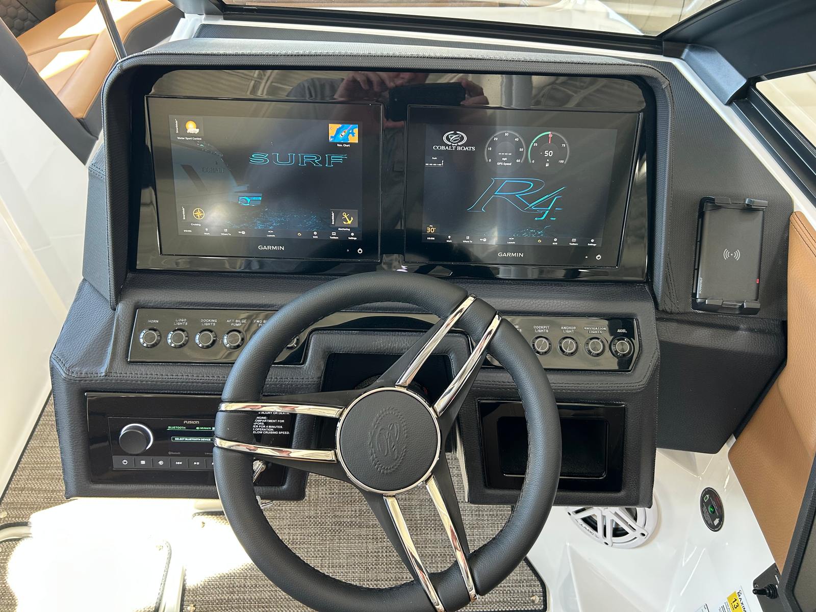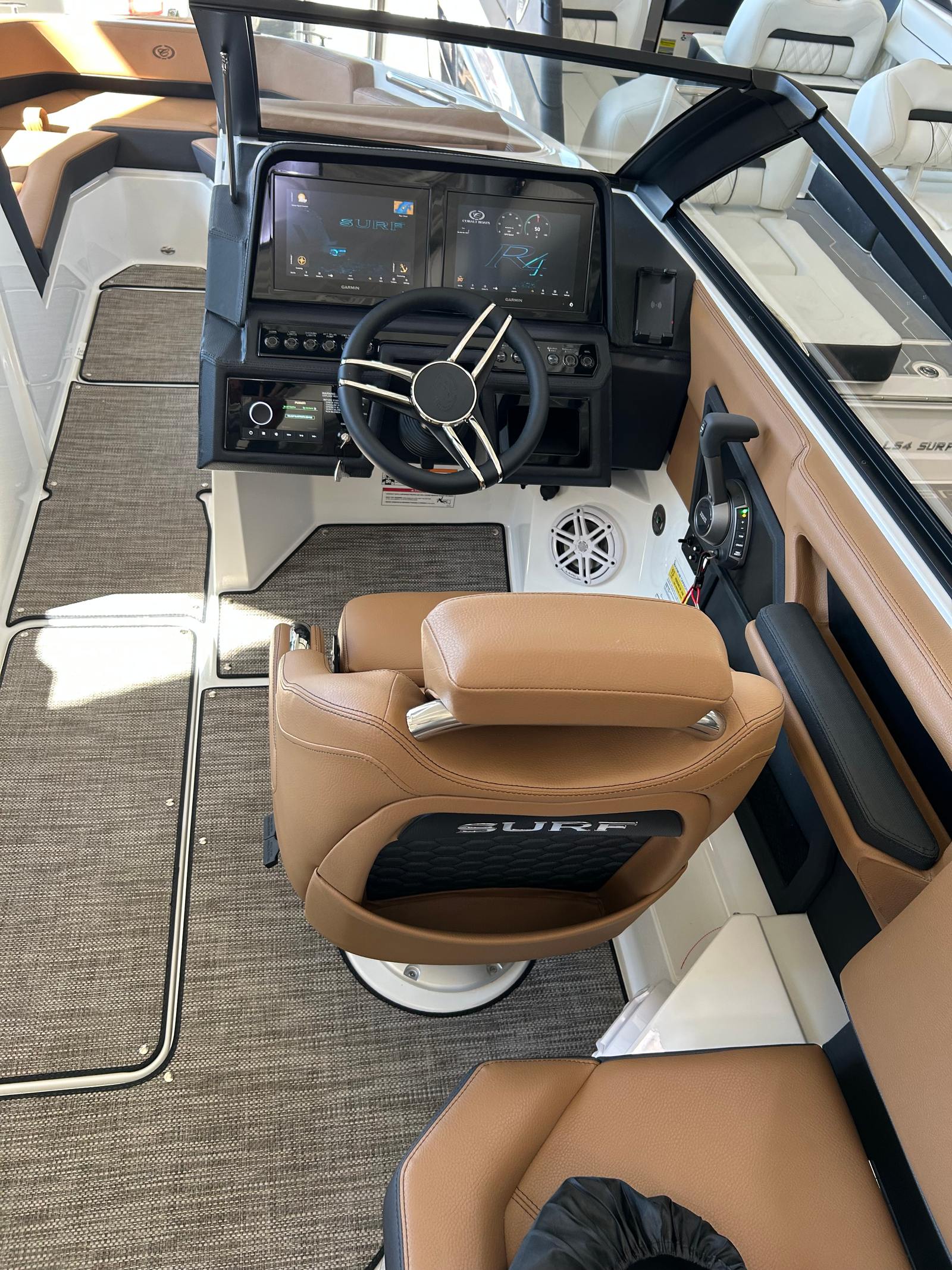 The Cobalt R4 Surf is as practical as it is luxurious. The battery maintainer/charger keeps your systems powered and ready, reducing maintenance hassles and maximizing your time on the water. Fender clips with line simplify the docking process, making it easy to secure your boat quickly and safely. The stainless steel docking lights improve visibility during low-light conditions, adding an extra layer of safety and convenience.The folding electric arch with bimini provides flexible shade options, allowing you to adapt to changing weather conditions with ease. The seagrass floor covering is not only stylish but also easy to clean and maintain, ensuring your boat stays looking its best season after season. The dual Volvo 8610 glass cockpit displays put all essential controls and navigation information at your fingertips, streamlining operation and enhancing your confidence as captain.