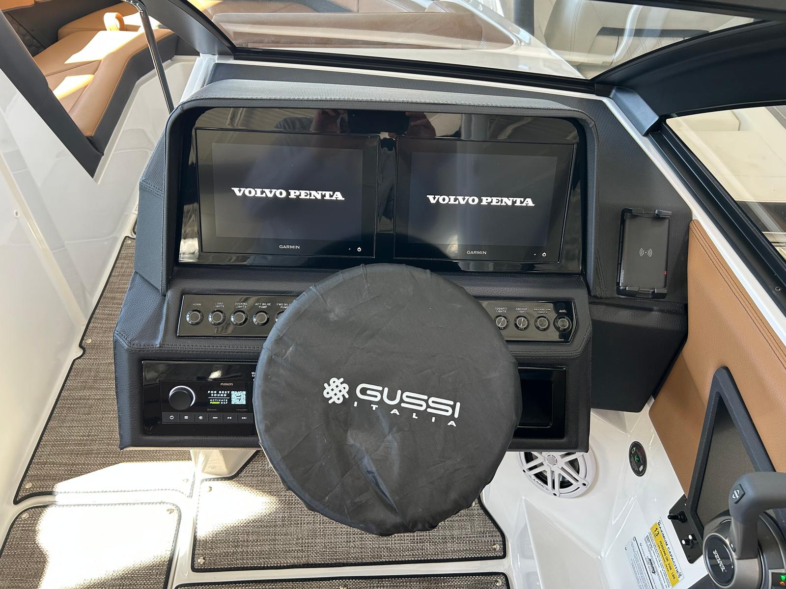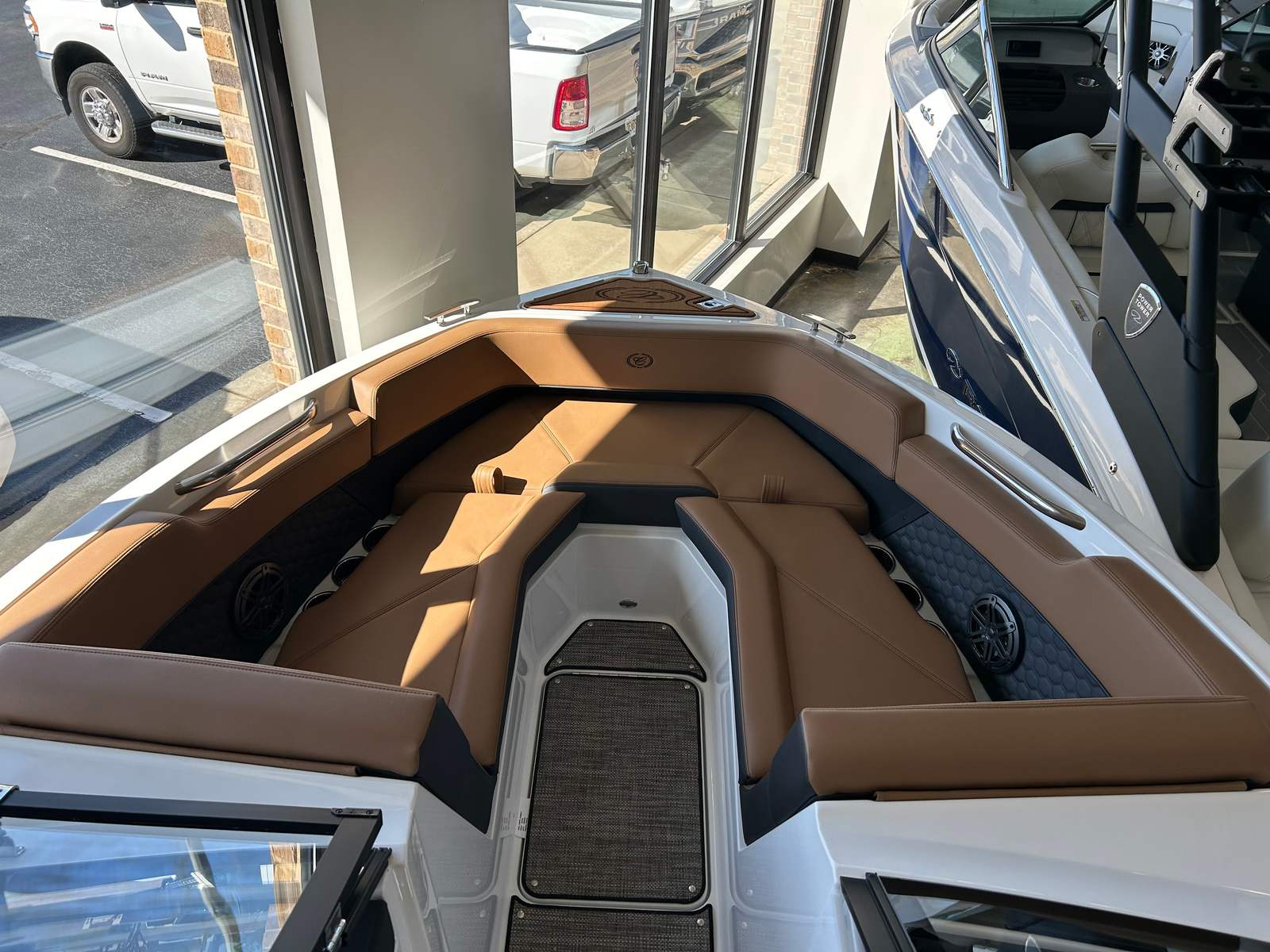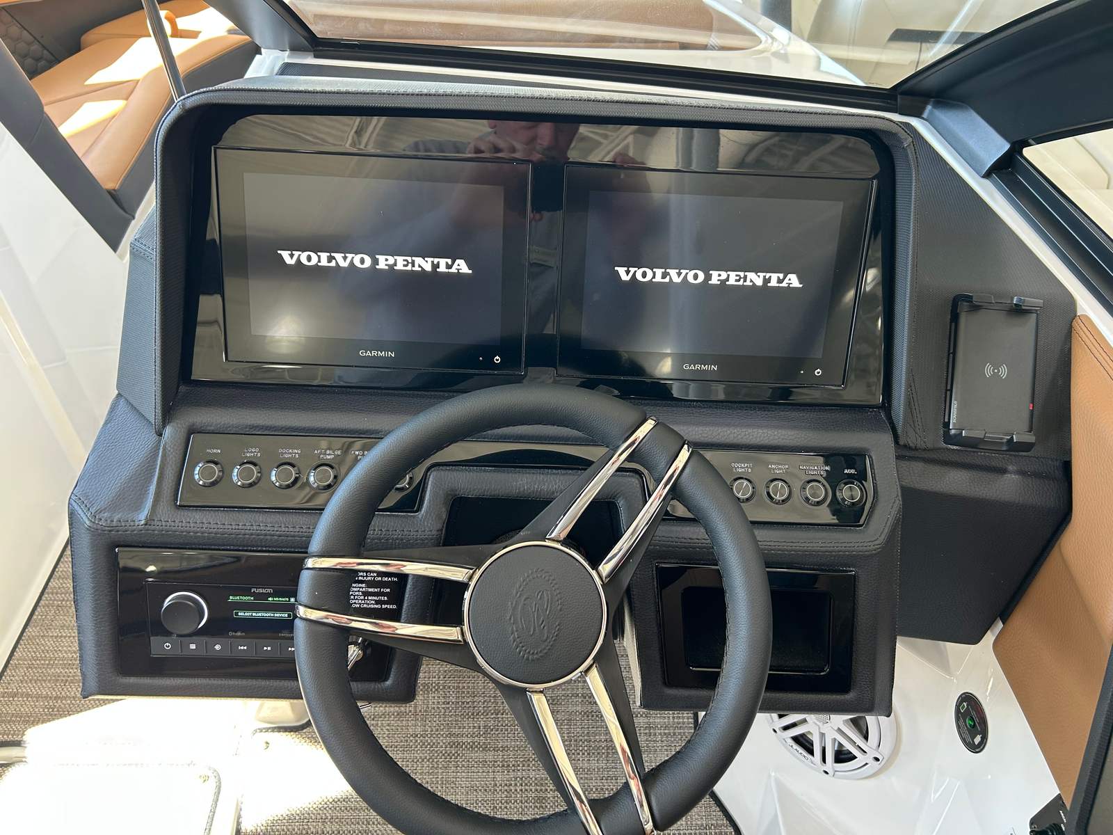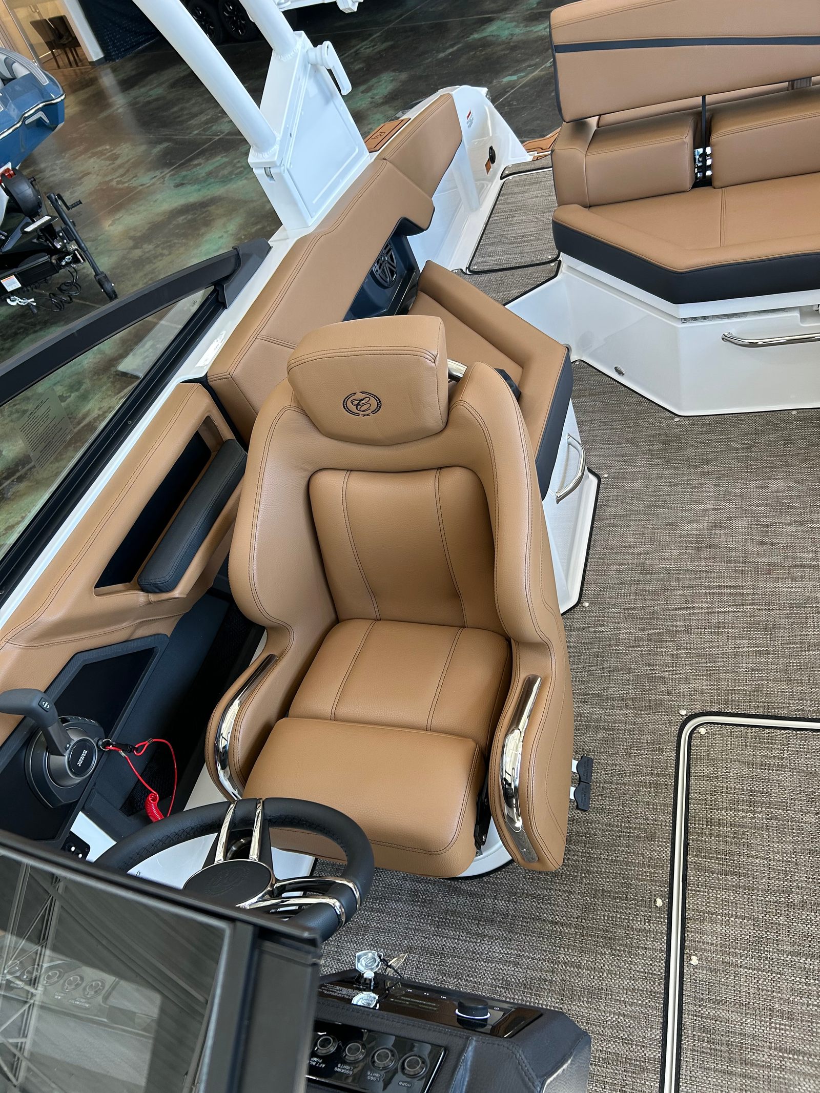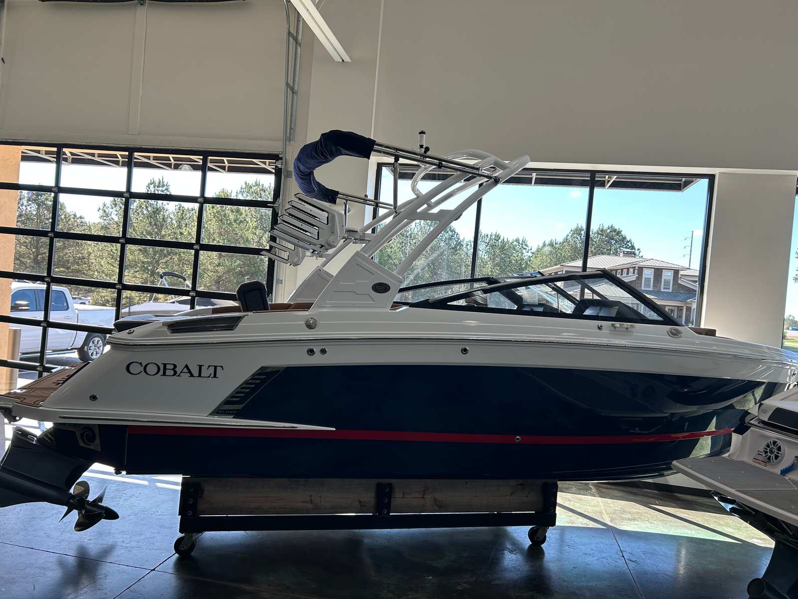 The Cobalt R4 Surf is as practical as it is luxurious. The battery maintainer/charger keeps your systems powered and ready, reducing maintenance hassles and maximizing your time on the water. Fender clips with line simplify the docking process, making it easy to secure your boat quickly and safely. The stainless steel docking lights improve visibility during low-light conditions, adding an extra layer of safety and convenience.The folding electric arch with bimini provides flexible shade options, allowing you to adapt to changing weather conditions with ease. The seagrass floor covering is not only stylish but also easy to clean and maintain, ensuring your boat stays looking its best season after season. The dual Volvo 8610 glass cockpit displays put all essential controls and navigation information at your fingertips, streamlining operation and enhancing your confidence as captain.