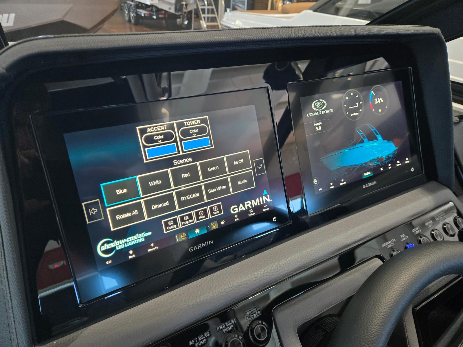 The 2026 Cobalt R4 is packed with special features that set it apart from other Bowrider boats for sale. The obsidian windshield not only enhances the boat’s aesthetic appeal but also provides excellent visibility and protection. The Sof-Trac Mat at the helm, finished in gray and ebony, ensures comfort and safety for the captain, while the black leather and stainless steel steering wheel adds a touch of luxury to your command center.LED interior accent lighting in red, green, and blue creates a vibrant atmosphere for evening cruises and social gatherings. The hull side in graphite gray is both stylish and durable, and the stainless steel docking lights make nighttime docking safer and easier. The fire extinguisher with an automatic system offers peace of mind, while the Cobalt letters in black satin showcase the brand’s commitment to quality and attention to detail.The glass cockpit is equipped with dual Garmin 8310 displays, providing advanced navigation and system monitoring capabilities. This state-of-the-art setup ensures you have all the information you need at your fingertips, making every journey more enjoyable and stress-free.