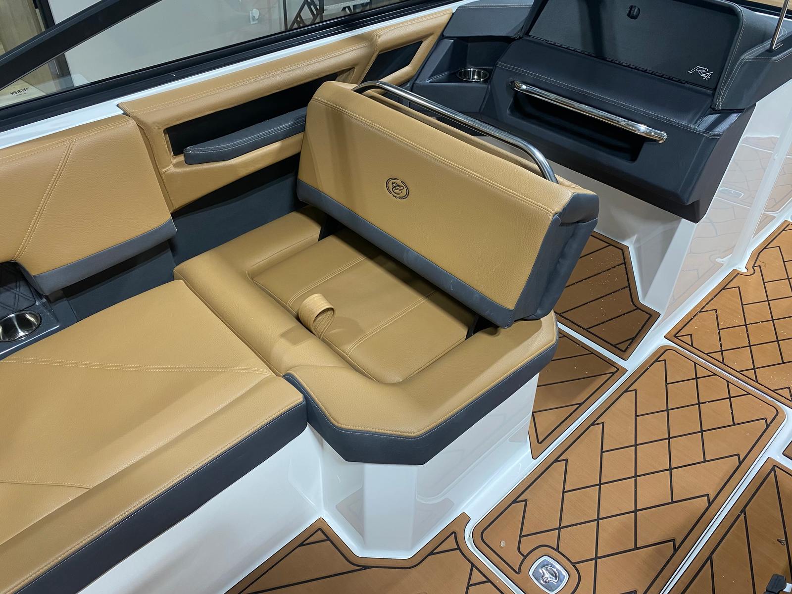 The Cobalt R4 is packed with features that set it apart from other bowrider boats for sale. The Aft Facing Rumble Seat offers a unique vantage point for soaking in the scenery or enjoying conversations at anchor. The Arch, E2 - White (Folding) with Bimini - Ebony, provides stylish shade and protection from the sun, while the Interior in Caramel and Carbon creates a warm, inviting atmosphere. Stainless Steel Docking Lights enhance visibility during evening outings, and Fender Clips with Line (4) make securing the boat at the dock a breeze. The Glass Cockpit, featuring Dual Garmin 8610 displays, puts advanced navigation and system controls at your fingertips, ensuring a seamless and intuitive boating experience. LED Interior Accent Lighting with customizable R/G/B settings adds a touch of elegance and ambiance, perfect for entertaining after sunset.