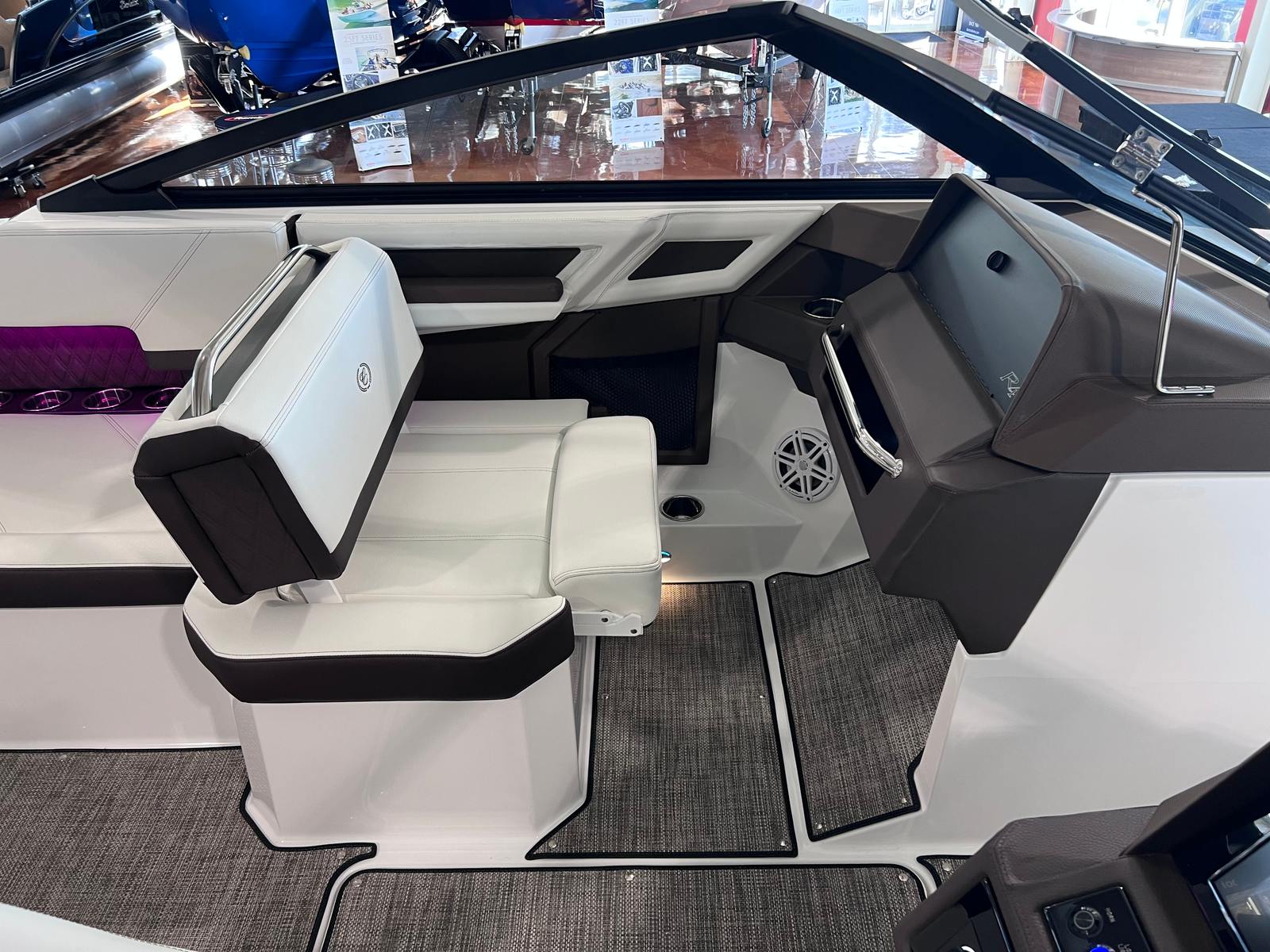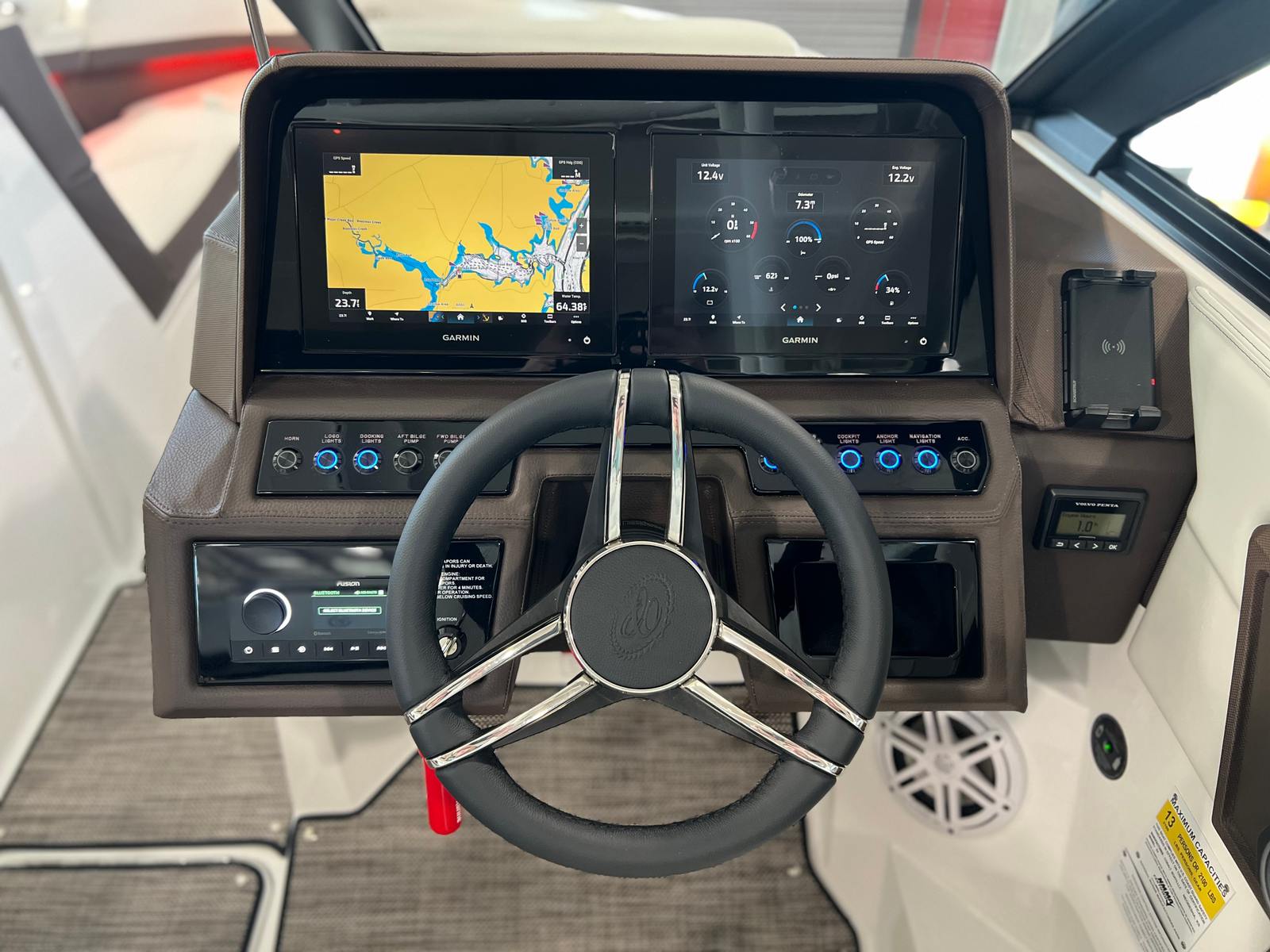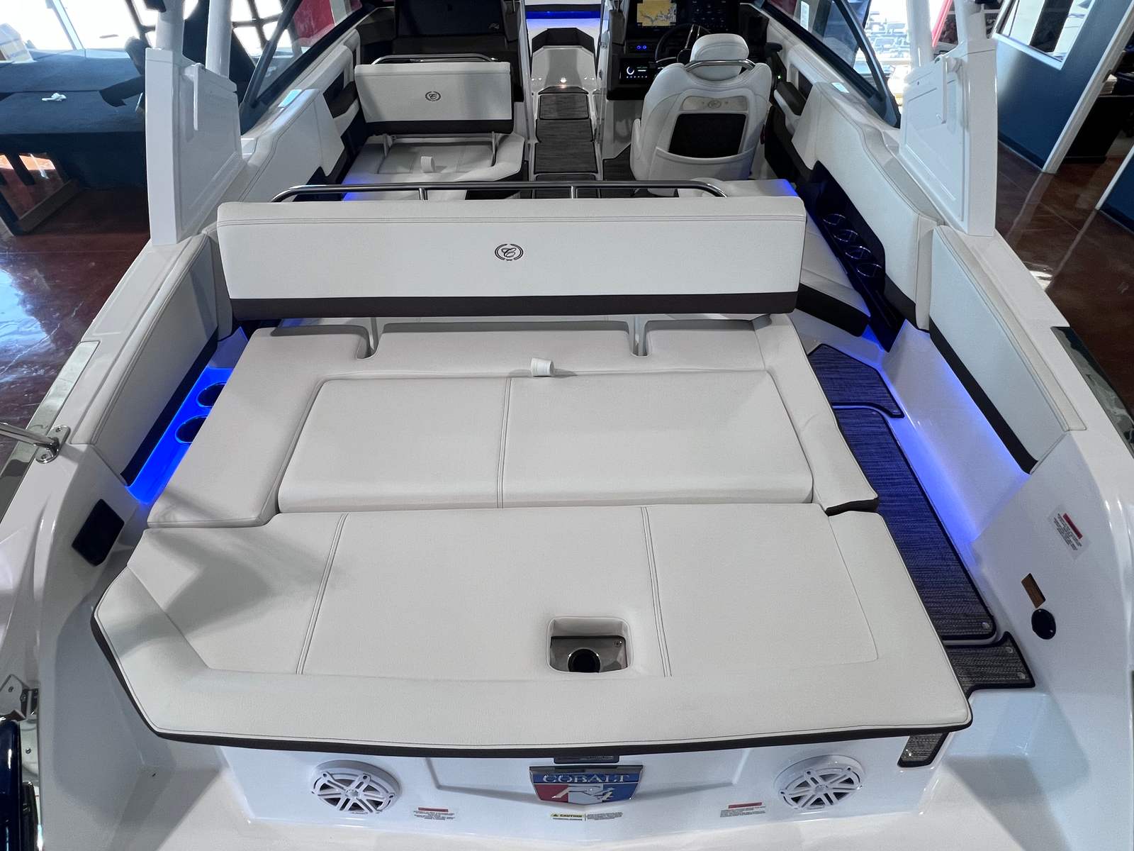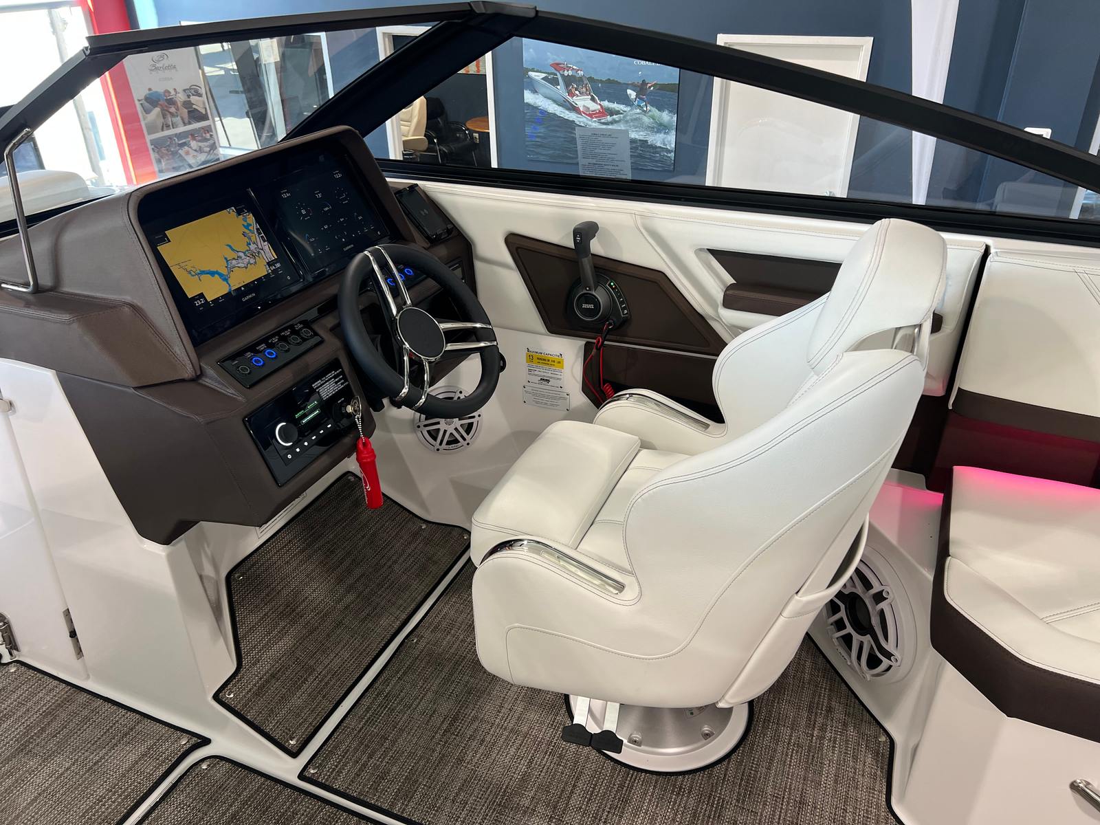 The Cobalt R4 Bowrider is packed with premium features designed to enhance your time on the water. The aft-facing rumble seat offers a unique vantage point for relaxing or socializing, while the arch, E2, white folding with bimini provides shade and protection from the sun, ensuring comfort during long days afloat. The captain’s navy accents add a touch of elegance to the helm, complementing the boat’s overall aesthetic.For added convenience, the battery maintainer/charger keeps your electrical systems in top condition, so you’re always ready to hit the water. Stainless steel docking lights illuminate your path during evening excursions, while fender clips with line make docking and undocking a breeze. The flagpole with flag adds a patriotic flair, and the floor covering in seagrass, raw umber, offers both durability and style underfoot.The glass cockpit is equipped with dual Garmin 8610 displays, providing state-of-the-art navigation and system monitoring. This advanced technology ensures you have all the information you need at your fingertips, making every journey safer and more enjoyable.