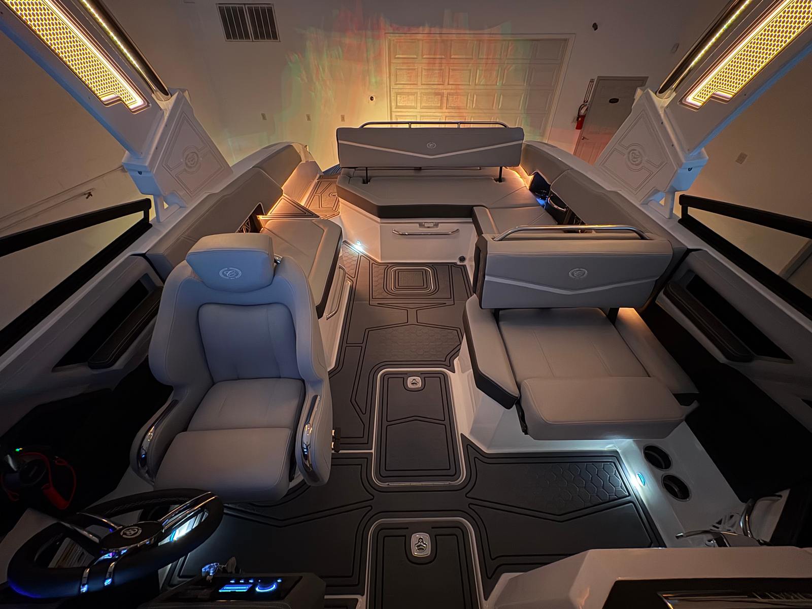 The Cobalt R6 Surf is loaded with premium features that elevate your boating experience. The stainless steel docking lights not only add a touch of elegance but also improve visibility during evening arrivals and departures. The electric arch, Prisma - White (folding) with Navy Bimini, provides shade and protection from the sun while maintaining a sleek profile. The glass cockpit, featuring dual Volvo 8610 displays, offers intuitive control and navigation, ensuring you stay informed and in command at all times.Inside, the Frost, Slate, and White interior creates a comfortable and stylish environment for passengers. LED interior accent lighting with R/G/B options allows you to set the mood for any occasion, while the mooring cover with Prisma folding arch protects your investment when the boat is not in use. The premium sound system, complete with transom speakers and remote, delivers crystal-clear audio throughout the vessel, perfect for entertaining guests or enjoying your favorite tunes while cruising. The Sof-Trac mat in the cockpit and bow, finished in Gray/Ebony, provides a soft, non-slip surface for added comfort and safety.