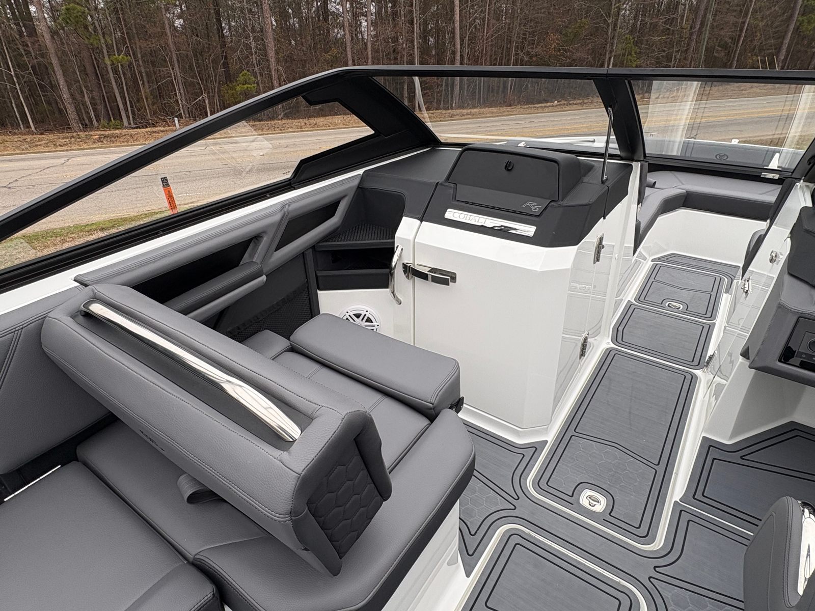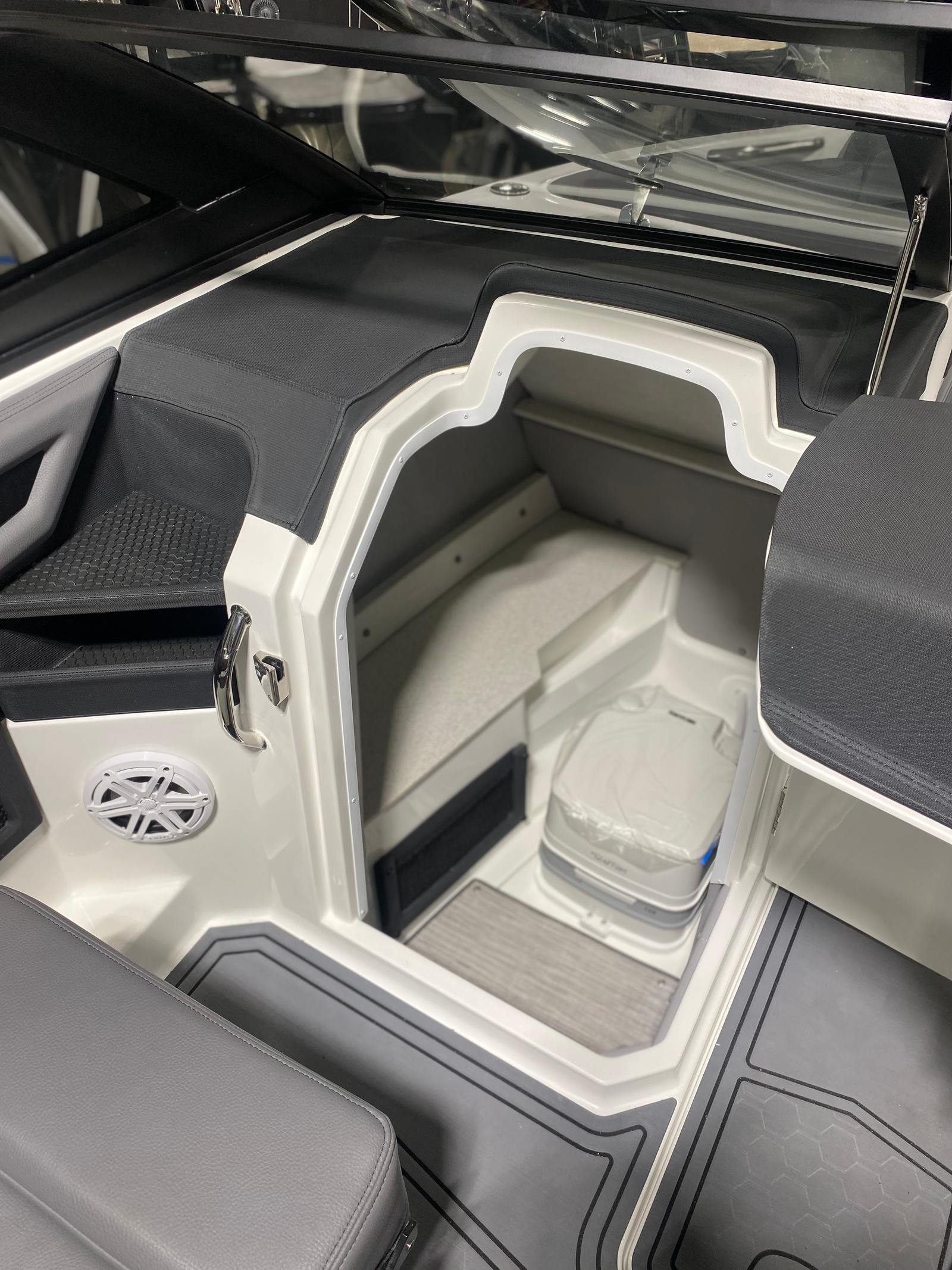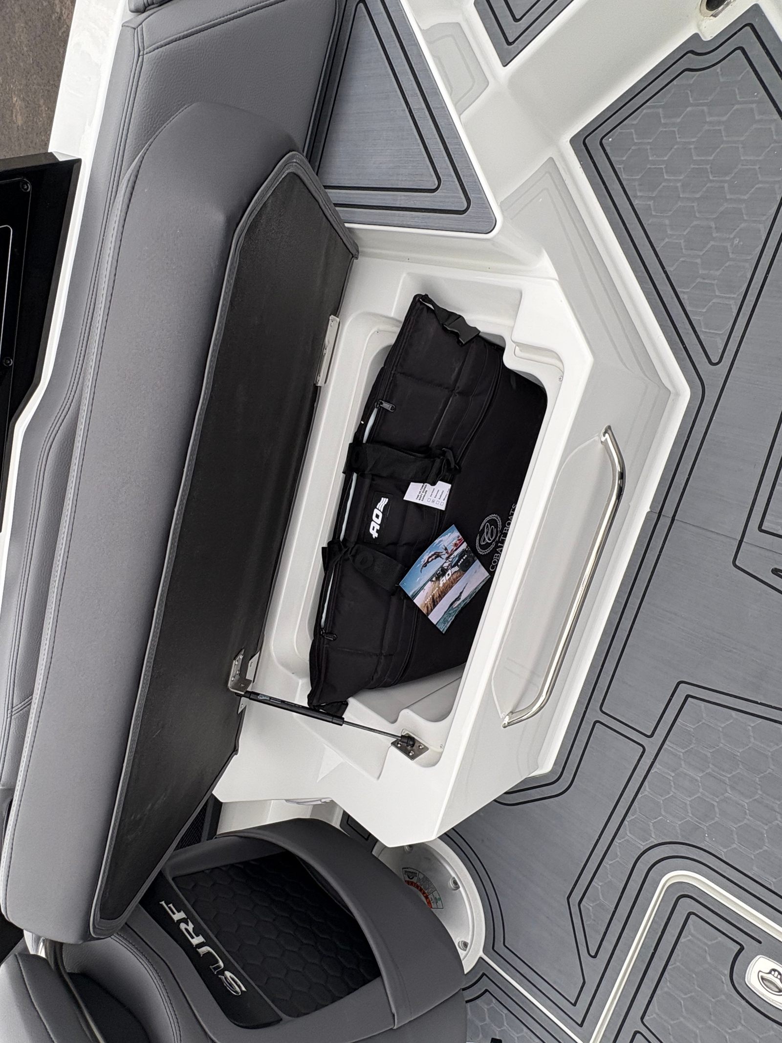 Practicality meets luxury in the Cobalt R6 Surf. The stainless steel docking lights and fender clips with line make docking and mooring straightforward, reducing stress and allowing you to focus on enjoying your time on the water. The folding electric arch simplifies storage and transport, making it easy to fit the boat into various slips or garages.The swim platform extension adds valuable space for water activities, while the ergonomic helm footrest ensures the captain’s comfort during long cruises. The rearview mirror with custom cover enhances safety during watersports, giving you clear visibility of everyone behind the boat. These thoughtful touches make the R6 Surf a pleasure to own and operate, whether you’re a seasoned boater or new to the lifestyle.
