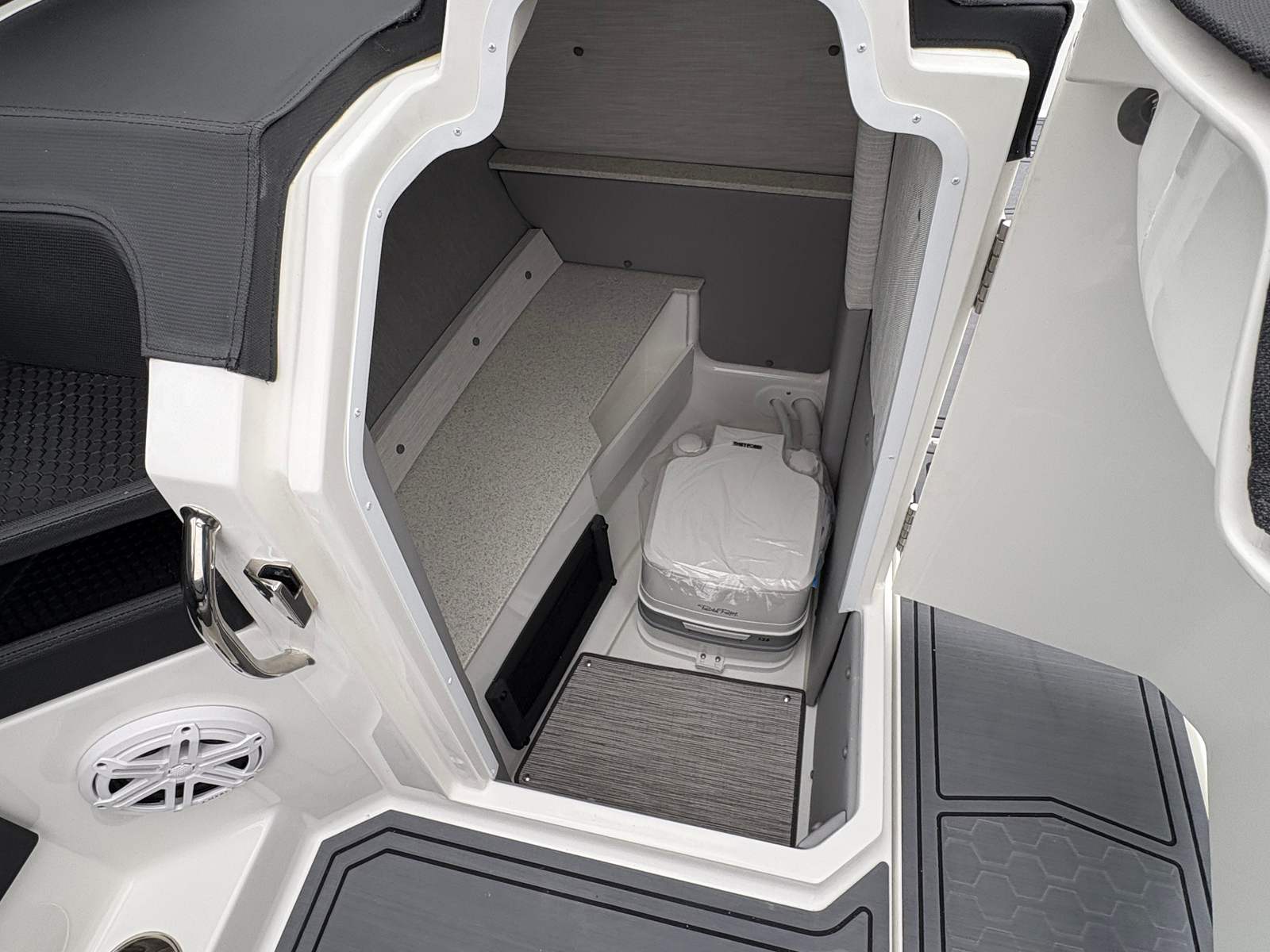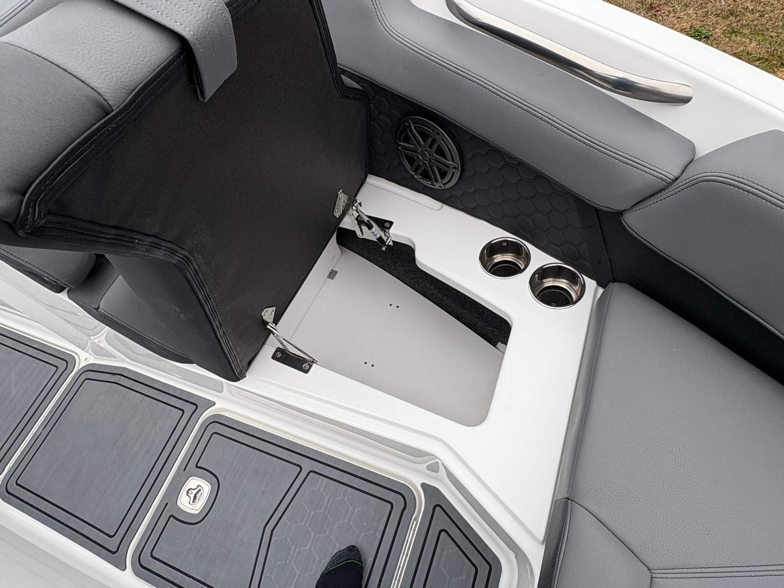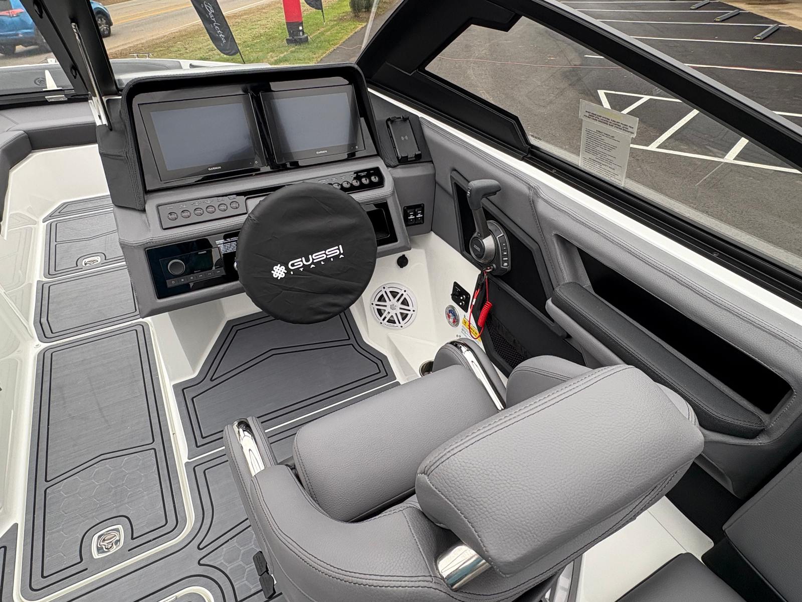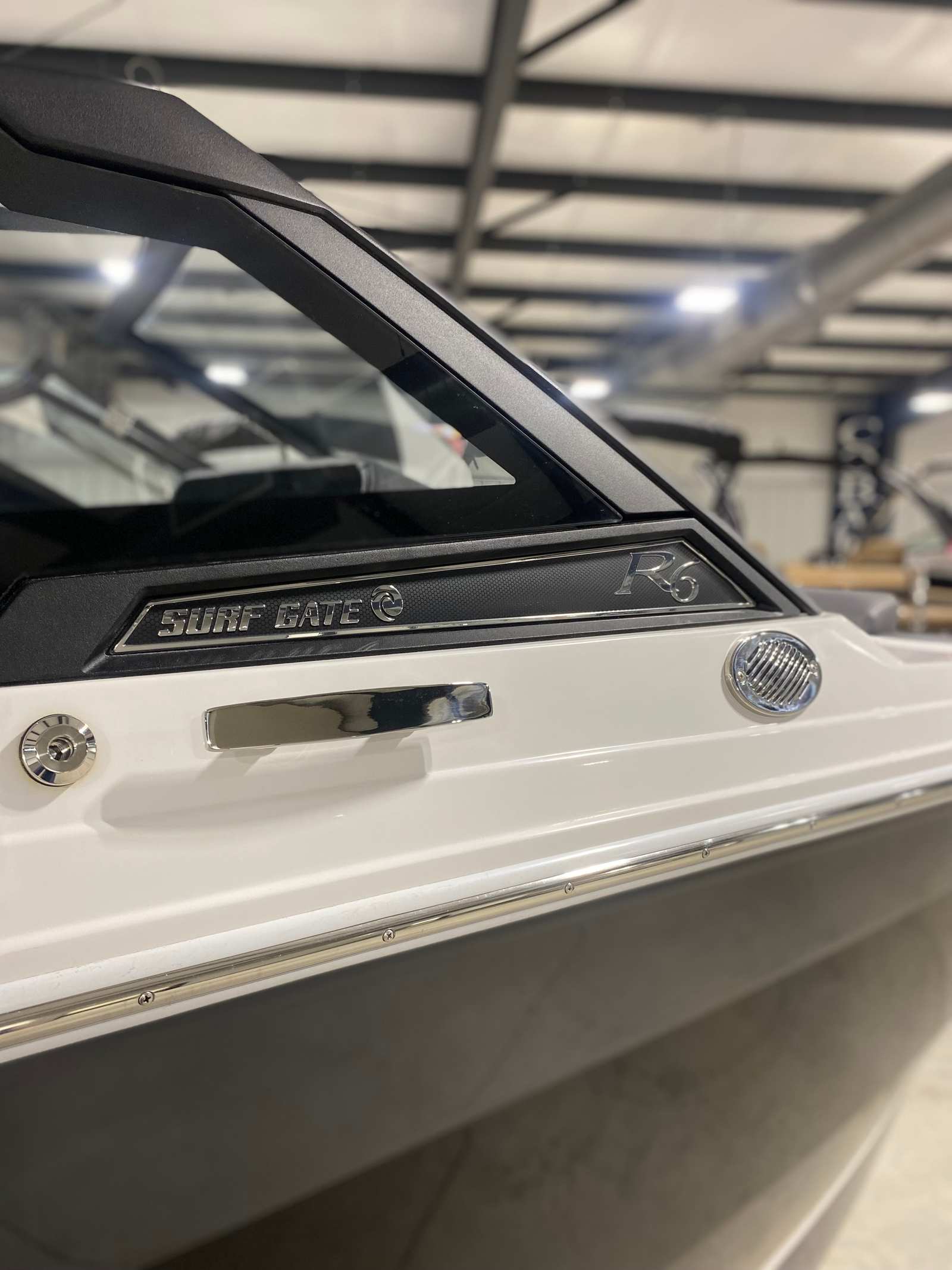 Practicality meets luxury in the Cobalt R6 Surf. The stainless steel docking lights and fender clips with line make docking and mooring straightforward, reducing stress and allowing you to focus on enjoying your time on the water. The folding electric arch simplifies storage and transport, making it easy to fit the boat into various slips or garages.The swim platform extension adds valuable space for water activities, while the ergonomic helm footrest ensures the captain’s comfort during long cruises. The rearview mirror with custom cover enhances safety during watersports, giving you clear visibility of everyone behind the boat. These thoughtful touches make the R6 Surf a pleasure to own and operate, whether you’re a seasoned boater or new to the lifestyle.