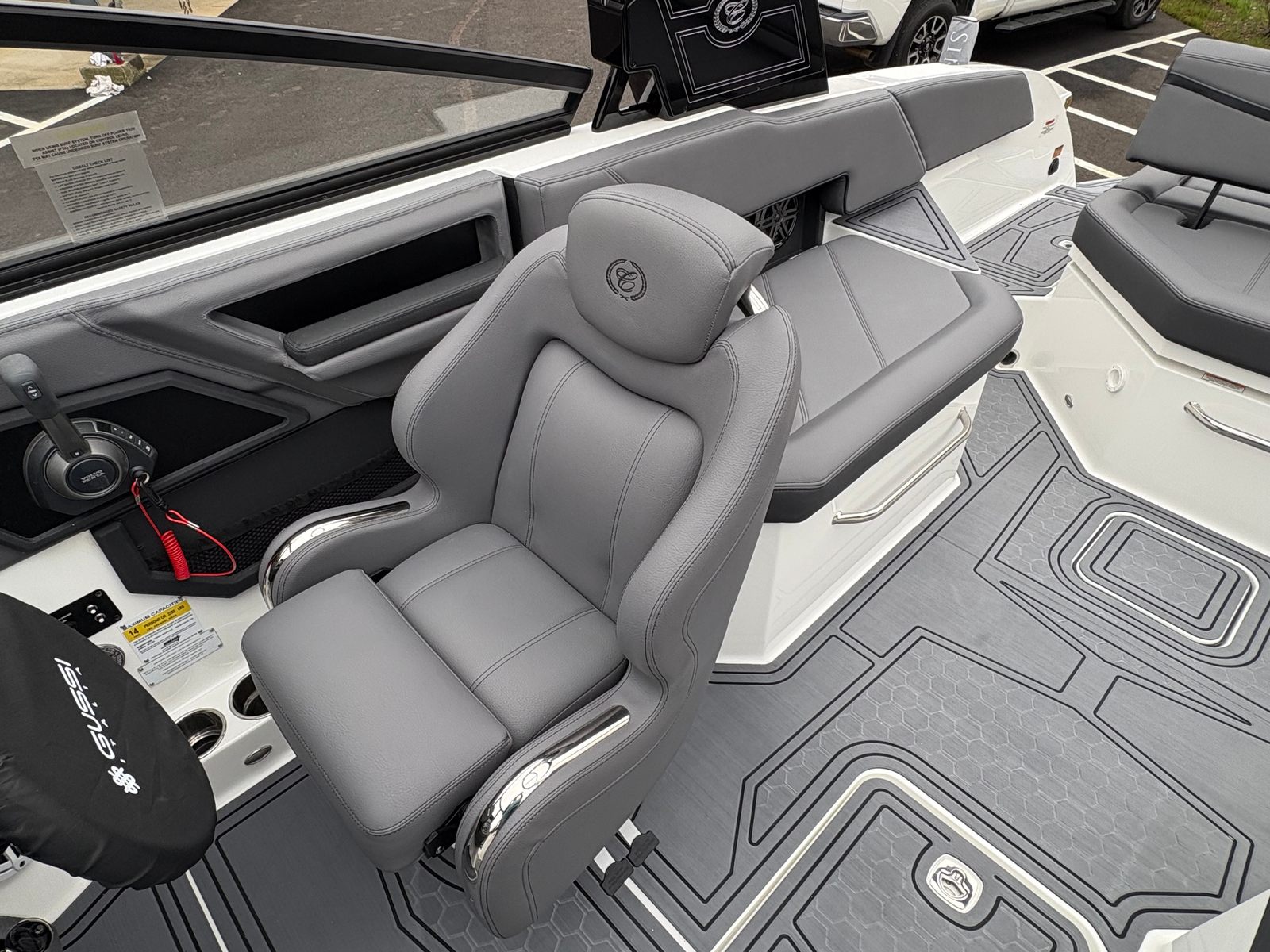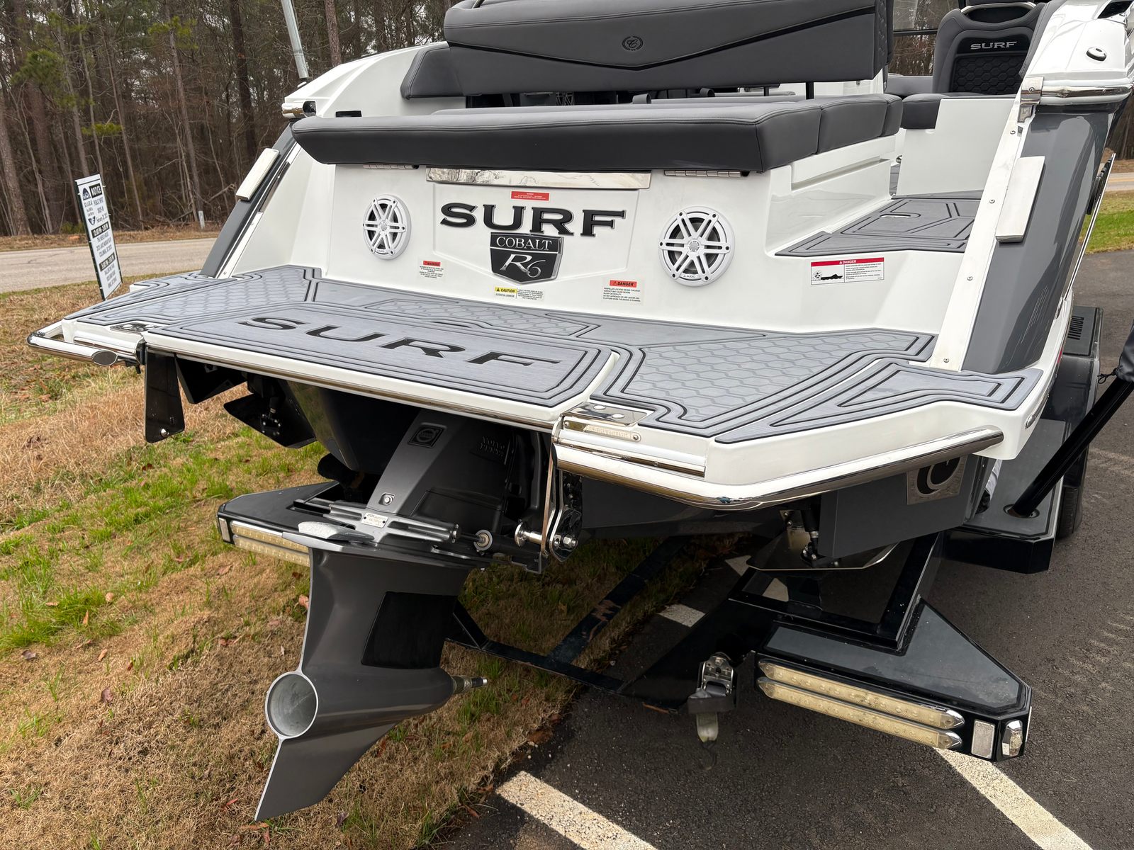 The 2025 Cobalt R6 Surf is packed with premium features that set it apart from other Bowrider boats for sale. The Sof-Trac Mat (Helm Footrest) in Gray/Ebony provides added comfort for the captain, ensuring long days on the water remain enjoyable. The Surf Mid Hull Side in Rich Ebony and the Hull Bottom in Graphite Gray give the boat a sophisticated, modern look that turns heads at every marina.Docking is made easier and safer with stainless steel docking lights, while the white swim platform extension offers extra space for lounging, swimming, or gearing up for watersports. Fender clips with line simplify the process of securing your boat, adding convenience and peace of mind. The LED interior accent lighting creates a vibrant atmosphere for evening cruises, enhancing the overall onboard experience.One of the standout features is the electric arch, Prisma, in black, which folds down for easy storage and transport. Paired with the Ebony Bimini, this arch provides shade and style, making every outing more comfortable. Wakeboard racks with PTM Clampforce 3.0 in black offer secure storage for your gear, while the Roswell rearview mirror with a custom cover ensures optimal visibility for watersports enthusiasts.