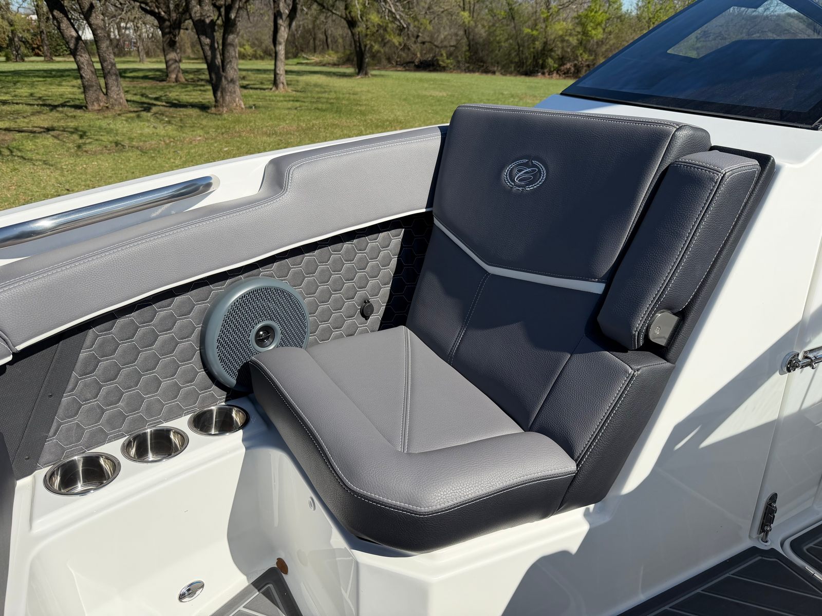 The 2026 Cobalt R6 Surf is loaded with premium features that elevate your time on the water. Enjoy the comfort and convenience of an electric adjustable seat, allowing you to find the perfect position for piloting or relaxing. The aft shade sail in crisp white provides essential sun protection, creating a cool retreat on warm days. Bow filler cushions enhance the bow seating area, transforming it into a plush lounge for sunbathing or socializing.For added functionality, the air compressor with holder is a practical addition for inflating water toys or adjusting tire pressure on the go. The battery maintainer/charger (110V) ensures your boat’s electrical systems remain powered and ready for every adventure. Stainless steel docking lights offer enhanced visibility and safety during evening arrivals or departures, while the rear-facing camera provides an extra layer of awareness when maneuvering in tight spaces.The R6 Surf’s aesthetic appeal is further highlighted by the black satin Cobalt letters and the elegant El Arch, Prisma, in white with a foldable, rotatable gray shade. The solid teak dinette table with cockpit receptacle adds a touch of luxury, perfect for onboard dining or entertaining guests.