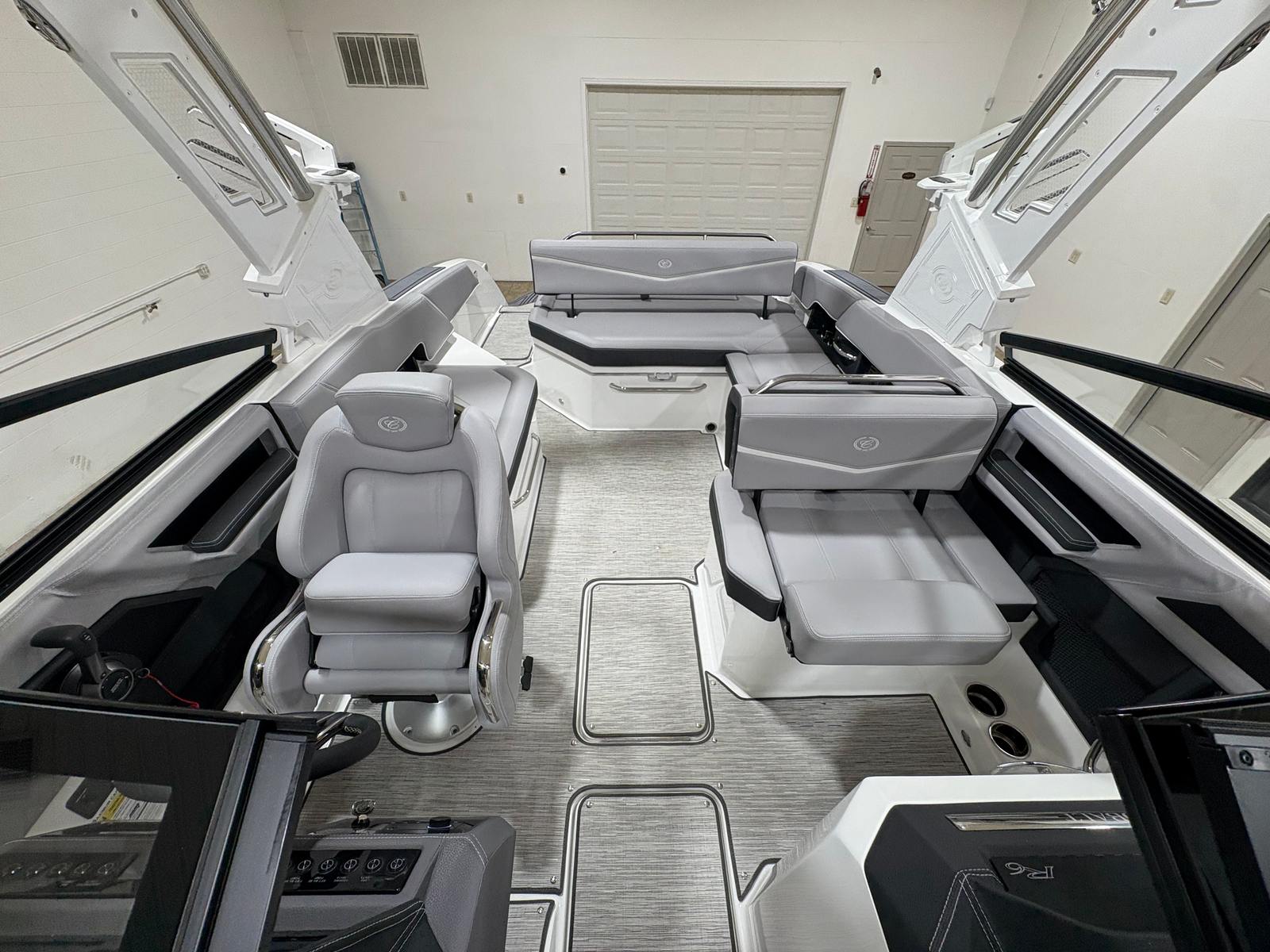Practicality meets luxury in the Cobalt R6 Surf. The folding electric arch and mooring cover make storage and docking straightforward, protecting your boat and simplifying maintenance. The stainless steel docking lights enhance visibility during low-light conditions, making it easier to navigate marinas and docks safely. The Seagrass floor covering is not only stylish but also durable and easy to clean, ensuring your boat stays looking its best season after season.The dual Volvo 8610 displays in the glass cockpit provide comprehensive information at a glance, streamlining navigation and engine monitoring. The premium sound system, with transom speakers and remote, allows you to control your music from anywhere on the boat, adding convenience and enjoyment to every outing. These practical features make the R6 Surf a pleasure to own and operate, whether you are a seasoned captain or new to boating.