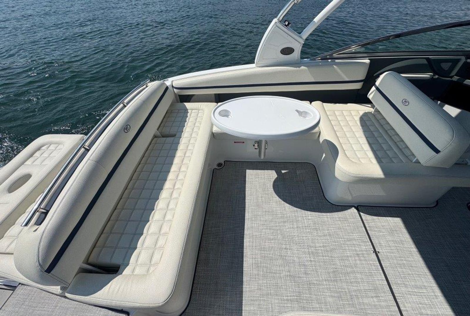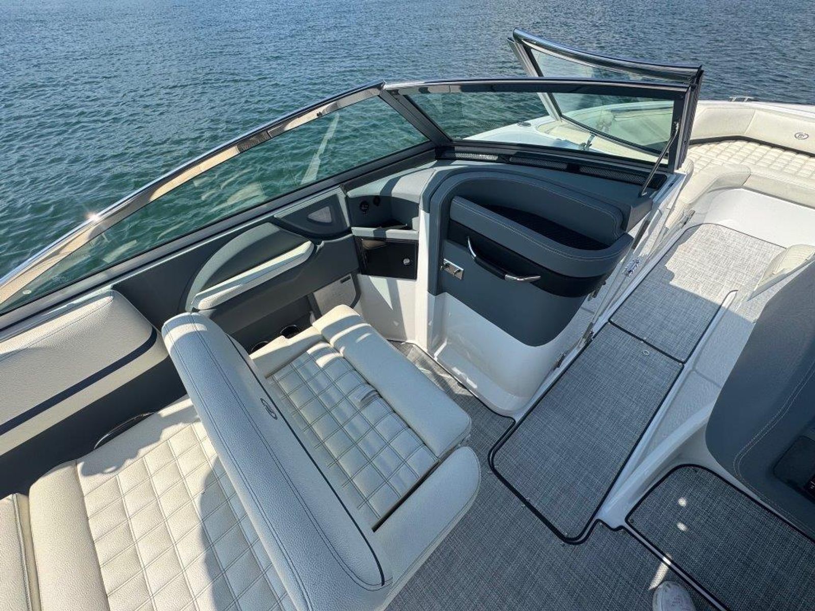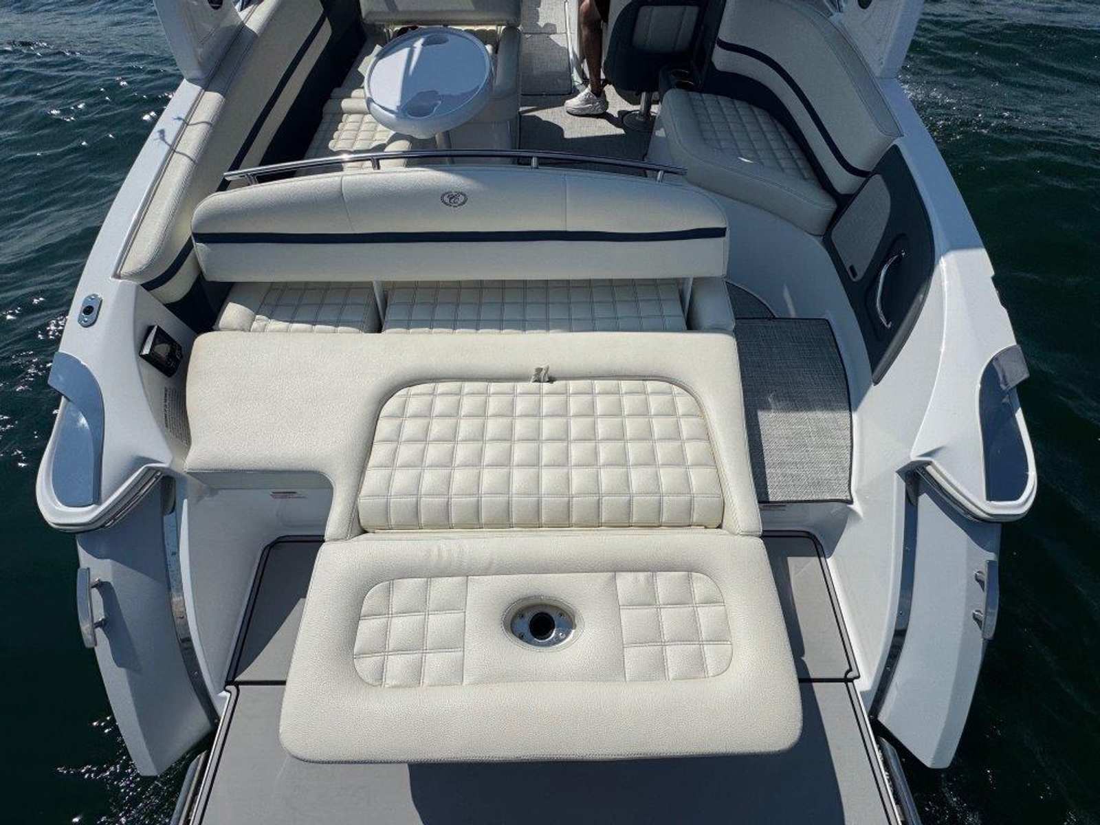 This stunning boat has a Navy hull side, Frost Grey bottom, and White boot stripe, complemented by a stylish Tahoe Grey interior with Navy piping for a sleek, refined look. A white forward-folding arch with a Navy bimini adds style and shade, while brushed aluminum wakeboard racks and tow balls on both port and starboard sides ensure you're ready for any watersports adventure.