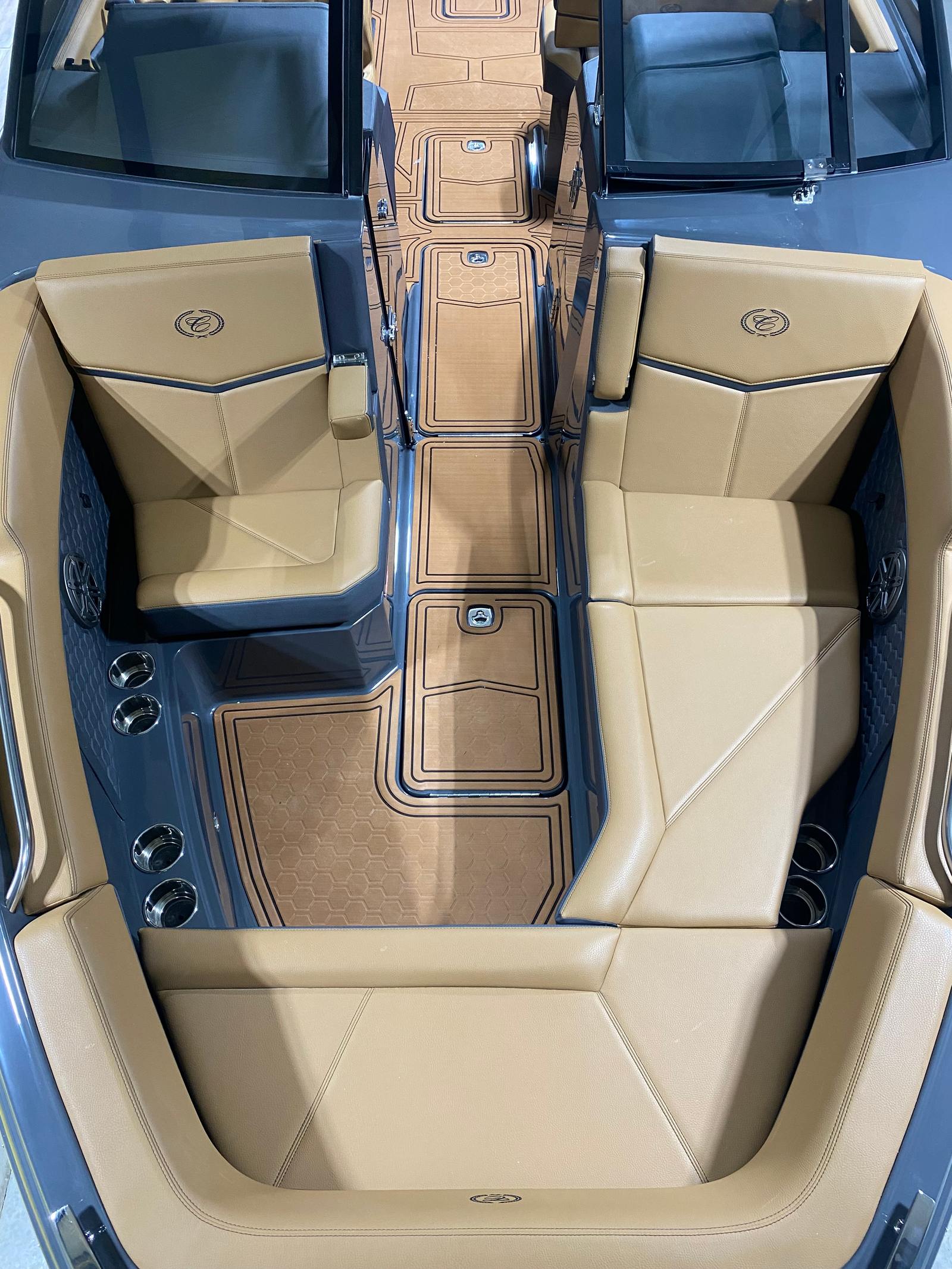 The Cobalt R8 Surf is loaded with premium features that enhance both its aesthetic appeal and functionality. The interior is finished in a sophisticated combination of Caramel, Carbon, and Ebony, creating a warm and inviting atmosphere. Black Satin Cobalt letters add a touch of elegance to the exterior, while the full-colored deck in Graphite Gray and a rich Ebony hull bottom showcase the boat’s modern style.For those who appreciate advanced technology, the R8 Surf features a Glass Cockpit with dual Volvo 8610 displays, providing intuitive control and comprehensive information at your fingertips. Stainless steel docking lights ensure safe and stylish arrivals, while the EL Arch in Prisma Black (folding) with an Ebony Bimini offers both shade and a striking visual statement. LED interior accent lighting with customizable R/G/B colors allows you to set the perfect mood for any occasion. To protect your investment, a mooring cover is included, designed specifically for use with the Prisma folding arch.