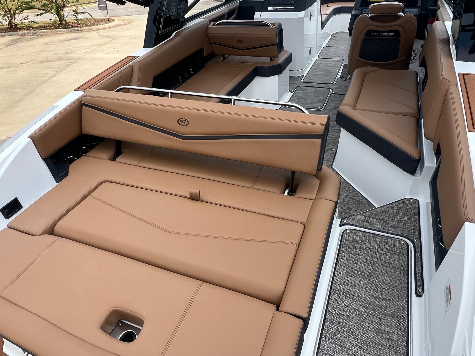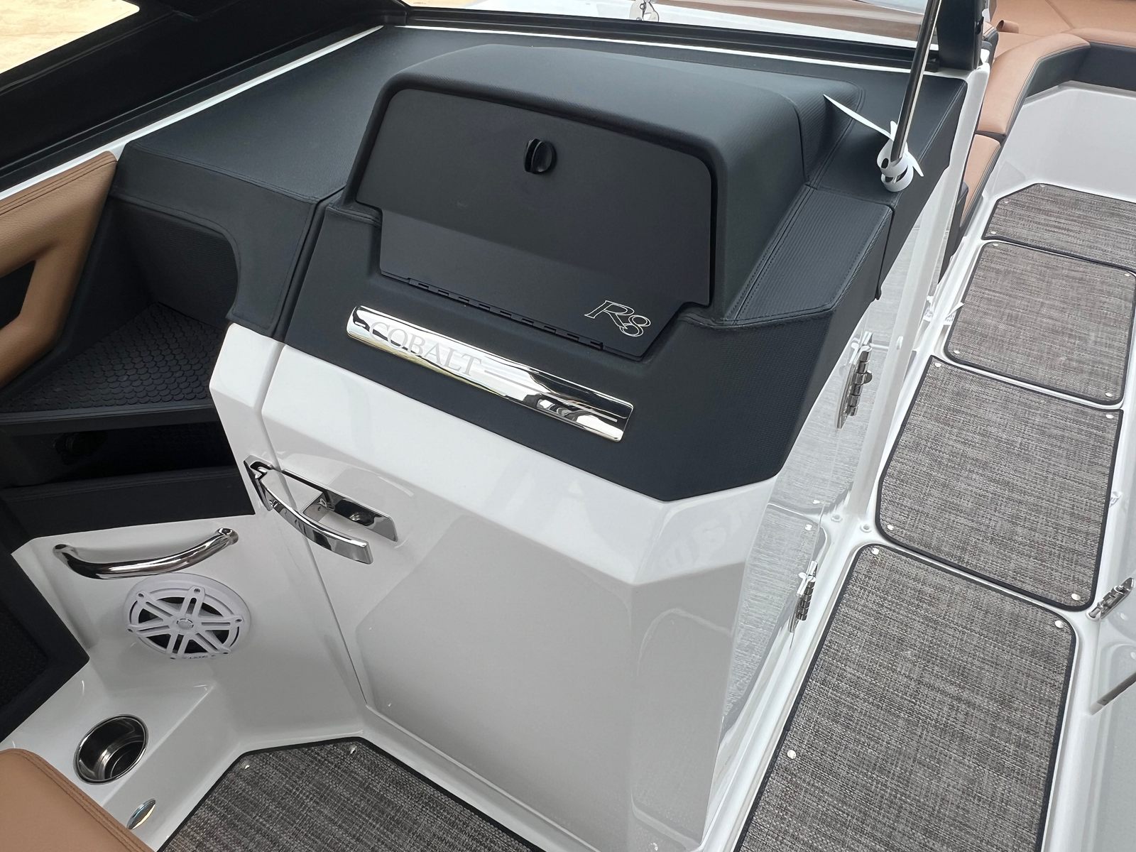 The Cobalt R8 Surf is engineered for convenience and ease of ownership. The folding EL Arch and Ebony Bimini provide flexible shade options and simplify storage, while the stainless steel docking lights make docking and nighttime navigation hassle-free. The battery maintainer/charger ensures your boat is always ready to go, reducing downtime and maintenance worries. The pump out porta potti adds comfort for extended trips, making it easy to spend the whole day on the water. The durable Seagrass and Raw Umber flooring is easy to clean and maintain, so you can focus on enjoying your time rather than worrying about upkeep. With its generous length and smart layout, the R8 Surf offers plenty of storage for gear, refreshments, and personal items, keeping your deck organized and clutter-free.