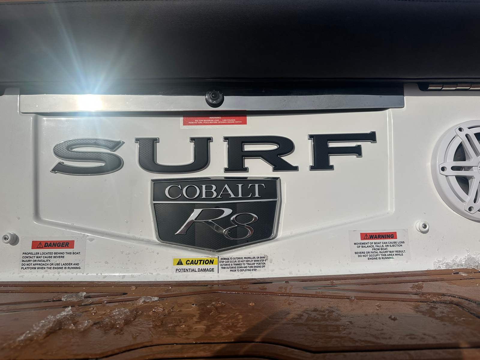 The Cobalt R8 Surf is packed with special features that elevate your time on the water. The included battery maintainer/charger (110V) keeps your boat ready for action, ensuring that your adventures are never cut short by a drained battery. The bow tonneau cover and cockpit tonneau cover, both in a stylish Capt/Navy color, provide protection from the elements and keep your boat looking pristine. For added safety and convenience, the rear-facing camera offers enhanced visibility when maneuvering in tight spaces or docking.Step inside the R8 Surf and you’ll be greeted by a luxurious interior finished in Caramel, Carbon, and Ebony, creating a warm and inviting atmosphere. The docking lights, crafted from stainless steel, not only enhance the boat’s appearance but also improve visibility during evening outings. The White EL Arch, Prisma (Folding) with Navy Bimini, adds a touch of elegance and provides shade on sunny days, while the electric adjustable seat ensures personalized comfort for the captain. A flagpole with flag adds a classic nautical touch, making the R8 Surf as stylish as it is functional.