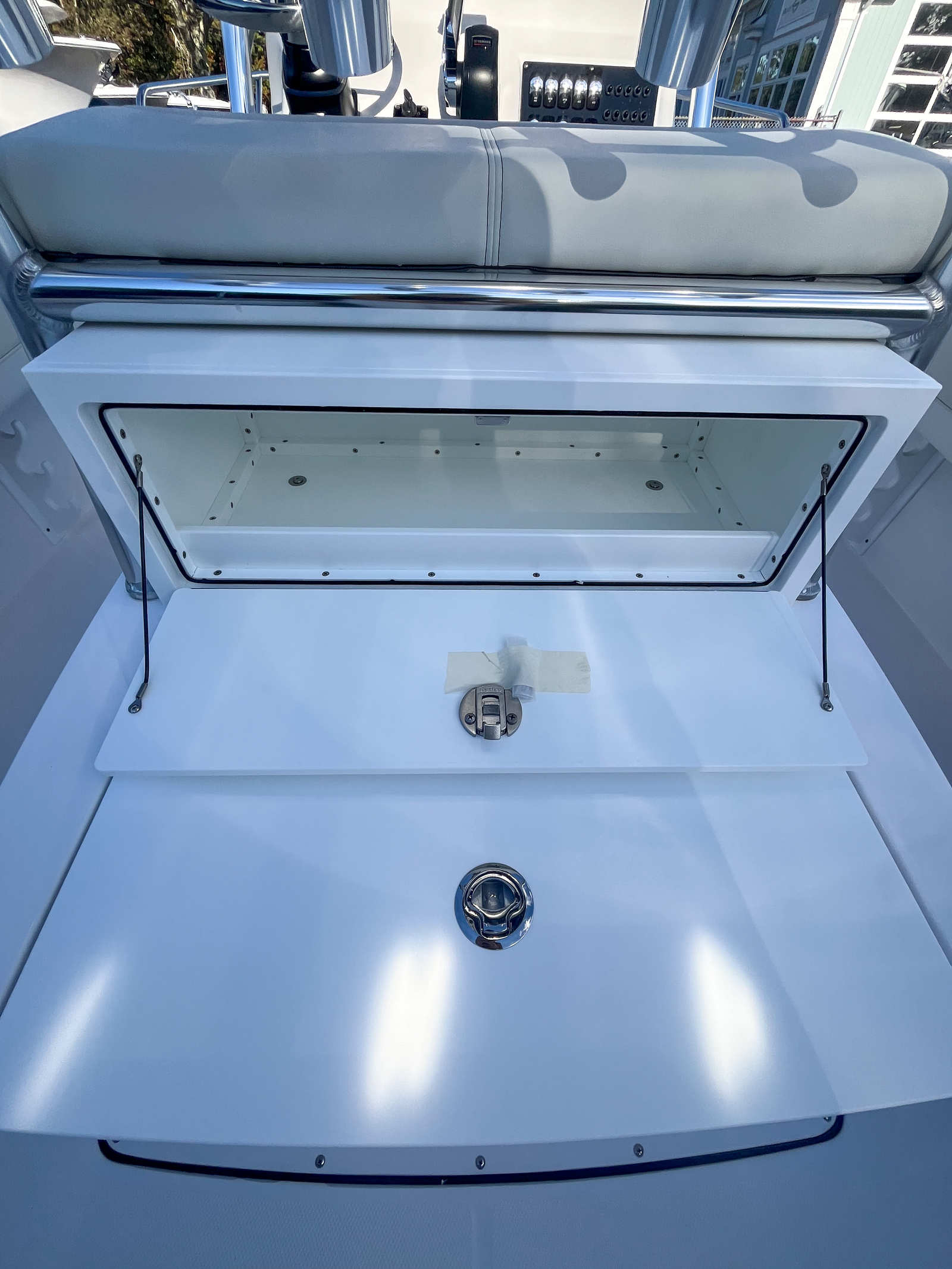 Practicality is at the core of the Edgewater 188 CC’s design. Its manageable length makes docking and trailering straightforward, even for those new to boating. The efficient Yamaha F150XD engine helps keep fuel costs in check, allowing you to spend more time on the water and less time at the pump. Storage solutions, including the built-in tackle box and multiple rod holders, keep your gear organized and your deck clutter-free. The raw water washdown system makes cleaning up after a day of fishing or swimming quick and easy, so you can maintain your boat’s pristine condition with minimal effort. The T-Top with E-Box not only provides shade but also offers additional storage for electronics and personal items, keeping them safe and dry.