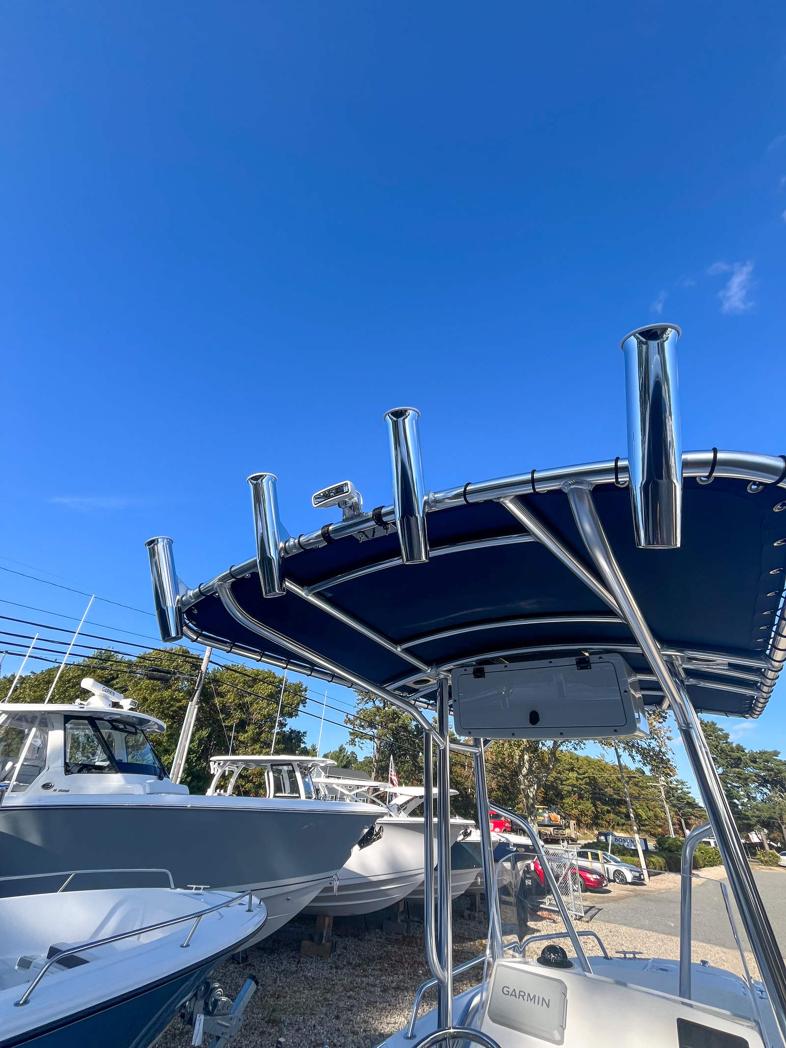 - T-Top Anodized Aluminum w/E-Box, Rod Holders (4), LED Spreader Lights (2), Radar Plate, Out Rigger Plates