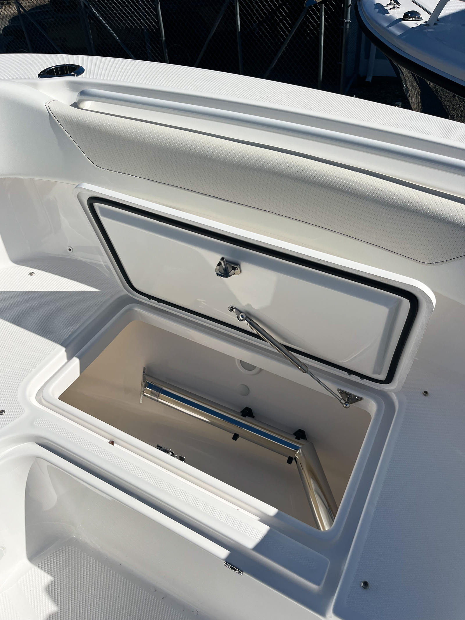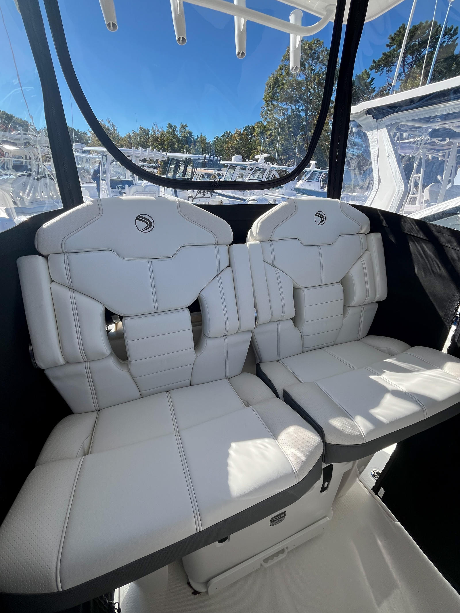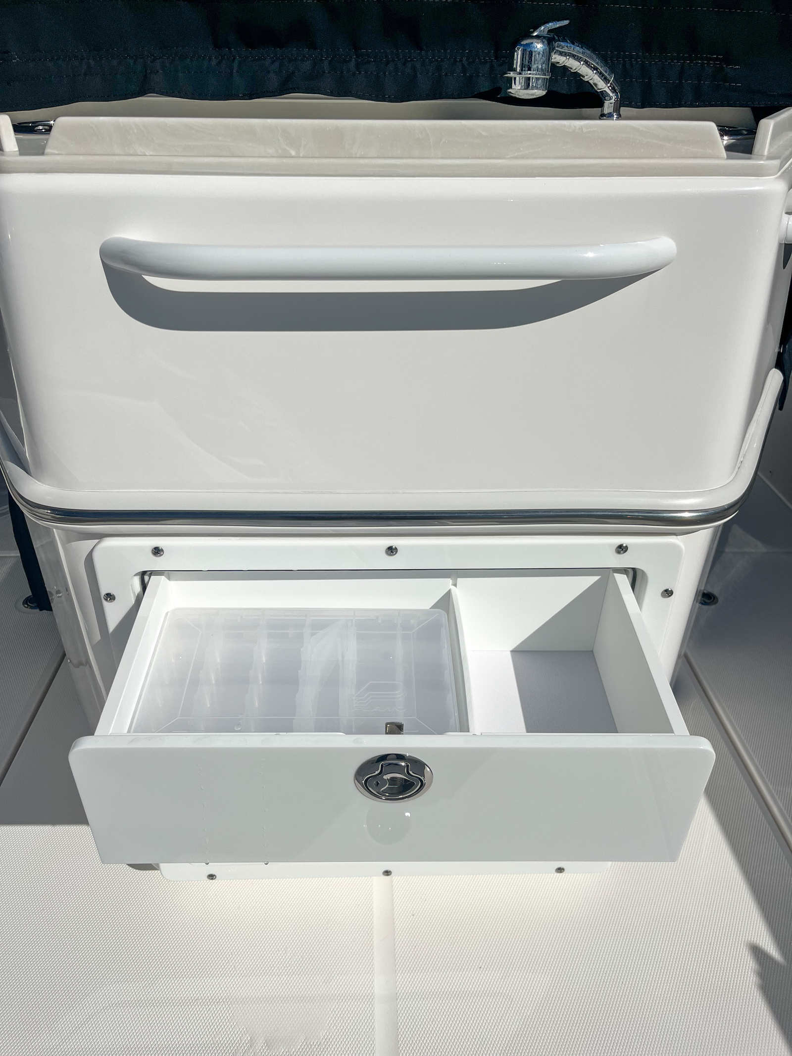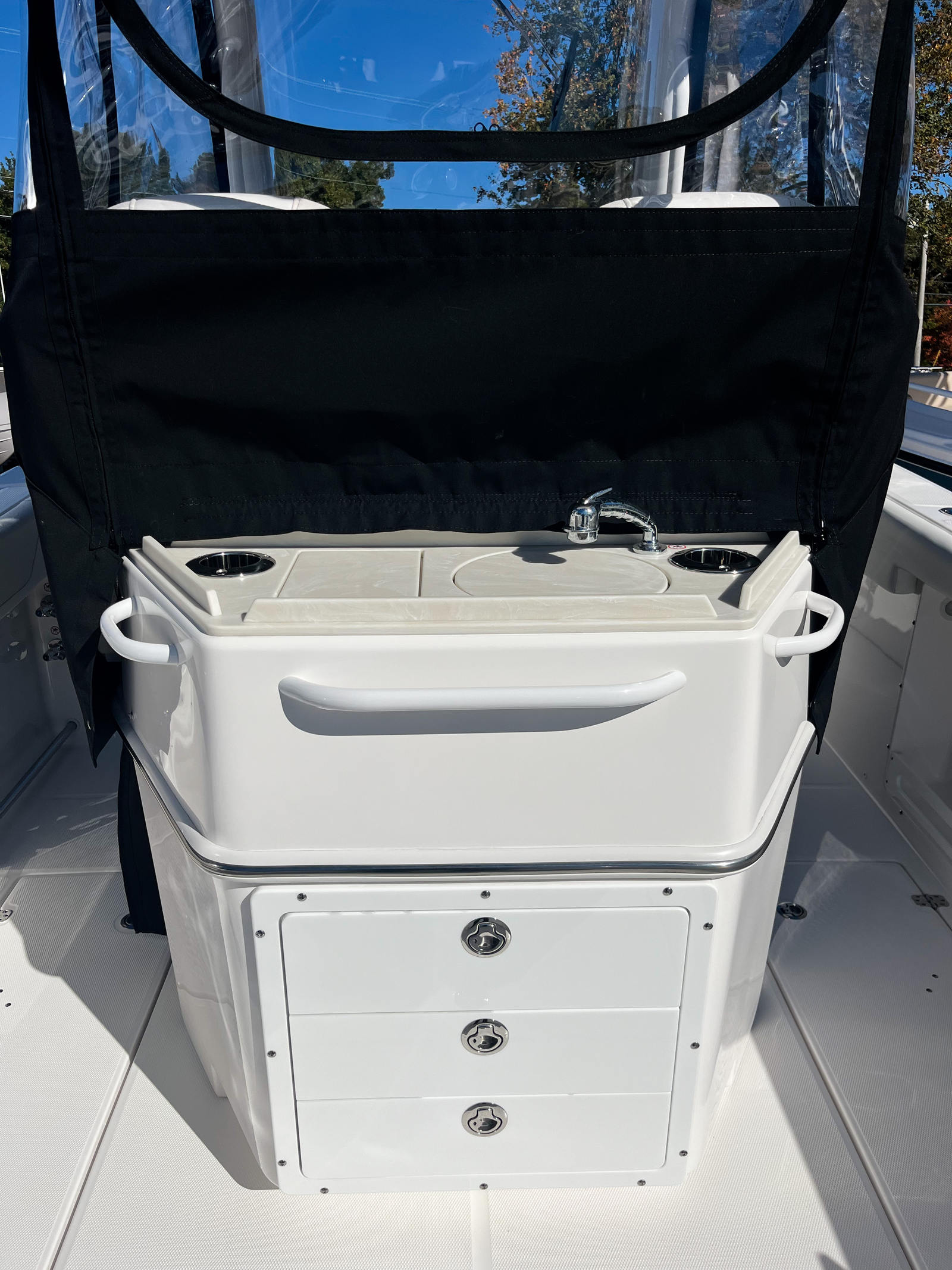 This Edgewater boat for sale is packed with premium features designed to enhance your boating experience. The stainless-steel rub rail provides added protection and durability, while the all-white hull and matching hardtop create a cohesive, stylish look. White accent cushions offer comfort and elegance, making every seat inviting for passengers. The prep station is equipped with a stainless-steel sink, storage with a cutting board, cupholder, rod holders combo, and pull-out storage drawers, ensuring you have everything you need for fishing, entertaining, or preparing snacks on the go. Navigation and safety are elevated with dual Garmin 8616 units, featuring a B75M 0° transducer for precise sonar readings. Communication is seamless thanks to the VHF 215 with antenna and remote mic 2, while the Garmin Radar Fantom 24 Dome provides advanced radar capabilities for enhanced situational awareness. The black helm face cove and black curtain enclosure add a touch of sophistication and privacy, making the helm area both functional and stylish.