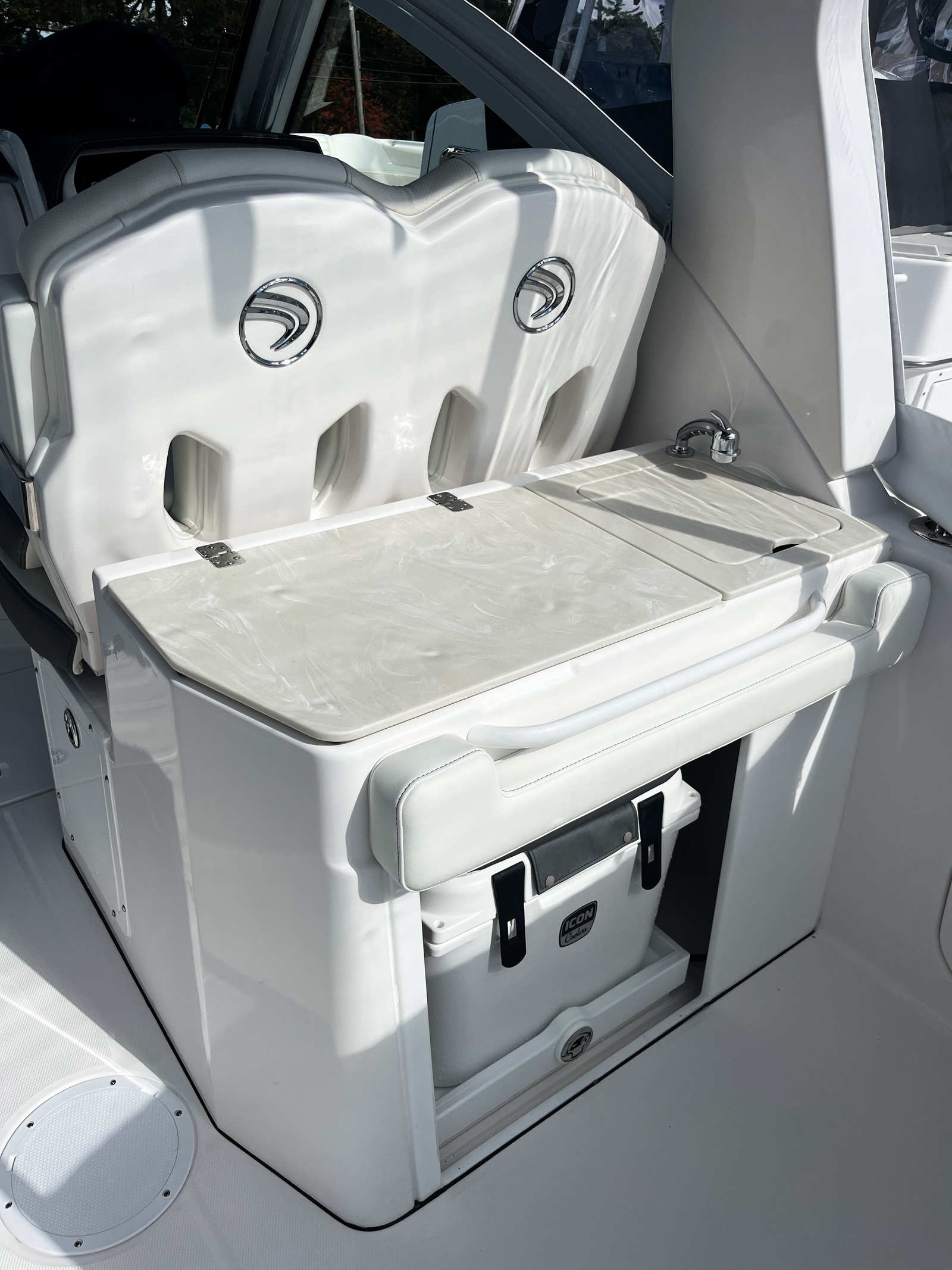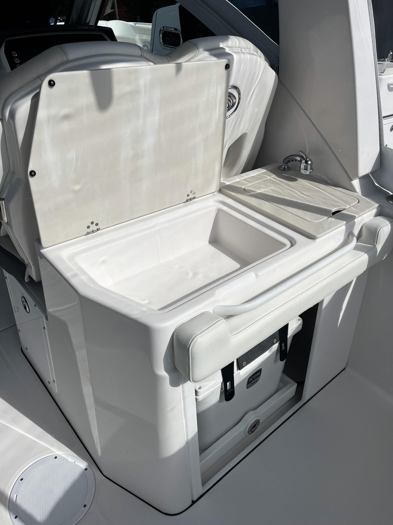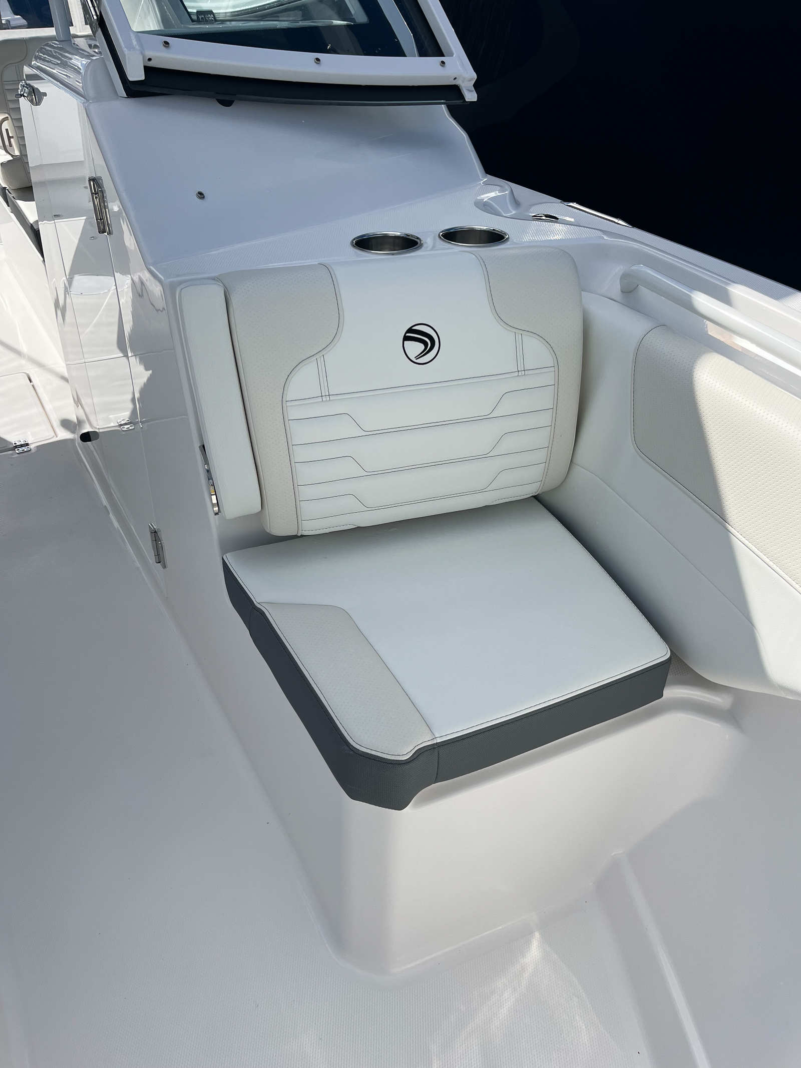 This Dual Console boat for sale is packed with premium features designed to enhance comfort, convenience, and safety on the water. The Seakeeper Ride 450MM system provides superior stability, reducing pitch and roll for a smoother ride even in choppy conditions. The white accent cushions offer a fresh, inviting look, while the prep station with Corian countertop, storage area, sink, and cooler with tan accent cushion ensures you’re well-equipped for entertaining guests or preparing snacks during your adventures. The white rub rail with stainless steel insert not only adds durability but also complements the boat’s elegant design. Navigation and communication are made easy with the Garmin 8616 featuring a B75M 0-degree transducer, VHF 215 with antenna, and remote mic, ensuring you stay connected and informed wherever your journey takes you. The navy-blue curtain enclosure provides protection from the elements, allowing you to enjoy your time on the water regardless of weather conditions.