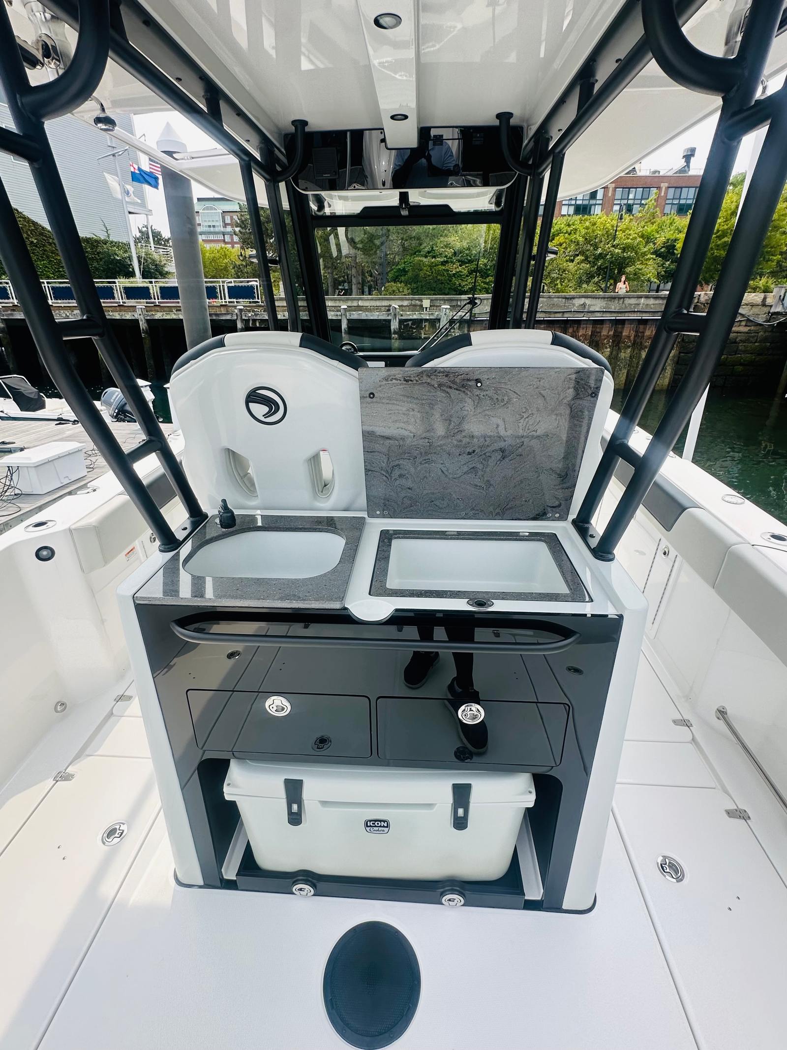 The Edgewater 340 CC is packed with special features that elevate your boating experience. The Black Dual Station Canvas Covers offer protection and style, while the Air Compressor Station Scanstrut Atmos 12V IP adds convenience for inflating water toys or gear. The Comfort Package, featuring a Black Accent-Bow Filler/Table with storage, removable backrest, and bow filler cushion, transforms the bow into a versatile lounge area perfect for relaxing or socializing.The Make Ready 340CC package includes six batteries and oil installed as standard, ensuring the boat is ready for action from day one. The helm face is gel coated in Pewter, providing a sophisticated look and added durability. The Black Stern Seat Cover and Prep Station Premium Black countertop, complete with a sink and pull-out faucet, three storage drawers, and a slide-out premium cooler, make entertaining and meal prep a breeze.Dual Station Accessories with Black Accent Cushions enhance comfort at both helm stations, while the Lumitec Black Razor Bar Flood Light front mount on the hardtop ensures excellent visibility during nighttime excursions. The Black Rubrail, measuring 2 inches wide with a stainless steel insert, adds a touch of elegance and extra protection to the hull.