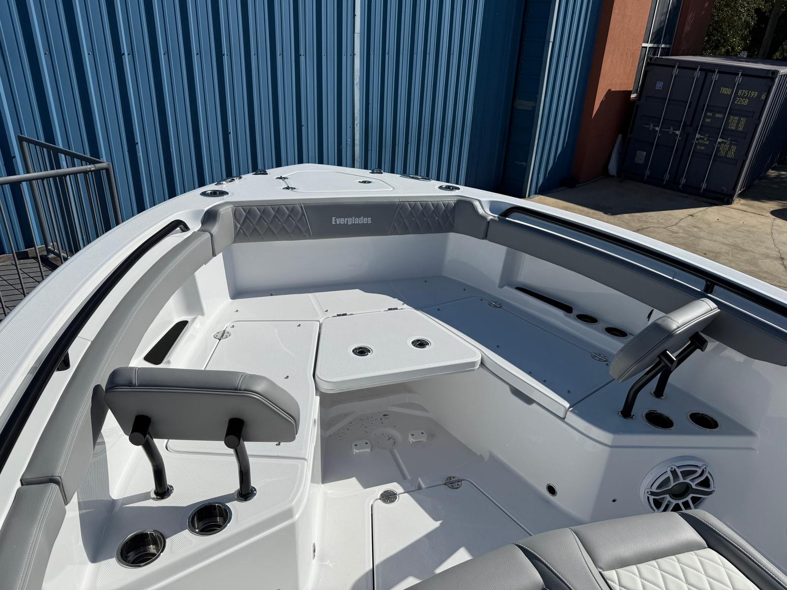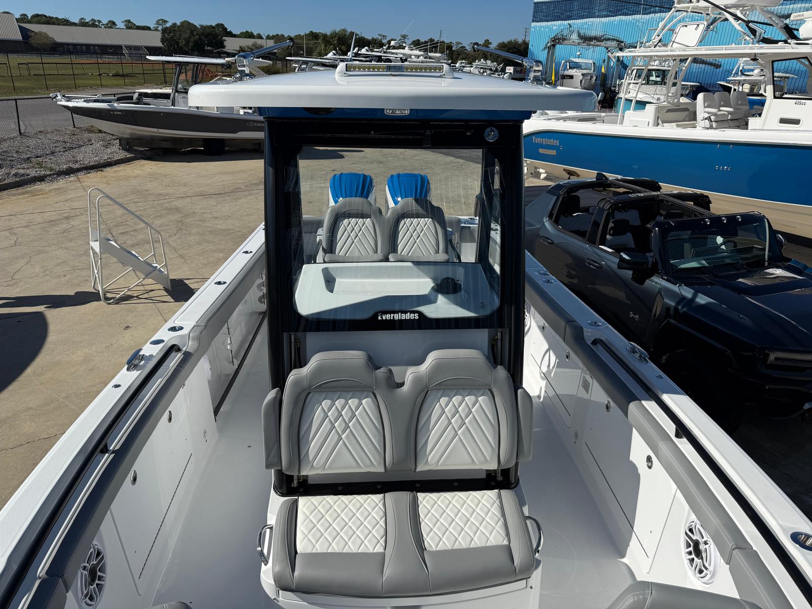 This Everglades boat for sale is packed with premium features designed for comfort, convenience, and versatility. The hull sides, finished in Major Blue gel, make a bold statement, while the black hull bottom adds a touch of elegance and durability. The underside of the hardtop, also in Major Blue, ties the design together for a cohesive and eye-catching look. The Flint Gray upholstery offers a modern, upscale feel, providing plush seating for all passengers.The comprehensive canvas package includes a console cover, forward console seat cover, and helm seat cover, ensuring your boat remains protected and looking pristine. The Mediterranean Bow Shade in white creates a cool, shaded retreat at the bow, perfect for relaxing on sunny days. Every detail, from the color choices to the protective covers, is crafted to enhance your boating lifestyle and keep your investment looking its best.