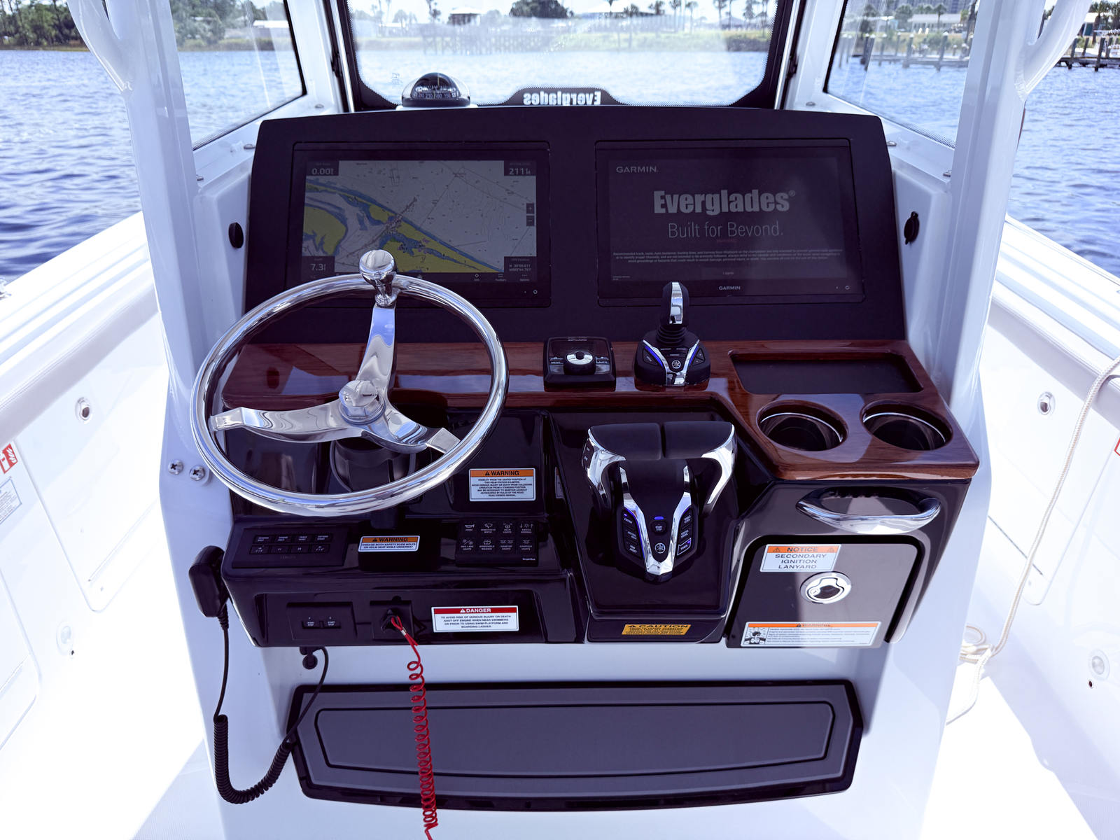 Practicality is at the heart of the Everglades 285 CC. The dedicated storage for the reboarding ladder keeps the deck tidy and organized, while the Zipwake Trim Tabs ensure efficient fuel consumption and smooth handling. Docking is a breeze thanks to the responsive twin Yamaha engines and advanced trim controls. The spacious layout offers plenty of storage for gear, tackle, and personal items, making it easy to keep everything you need close at hand.The dual GPSMAP 8616 chart plotters and B175HW transducer provide reliable navigation and fish finding capabilities, giving you confidence whether you’re exploring new waters or returning to your favorite spots. The Premium Audio Package adds another layer of enjoyment, allowing you to set the perfect mood for any occasion.