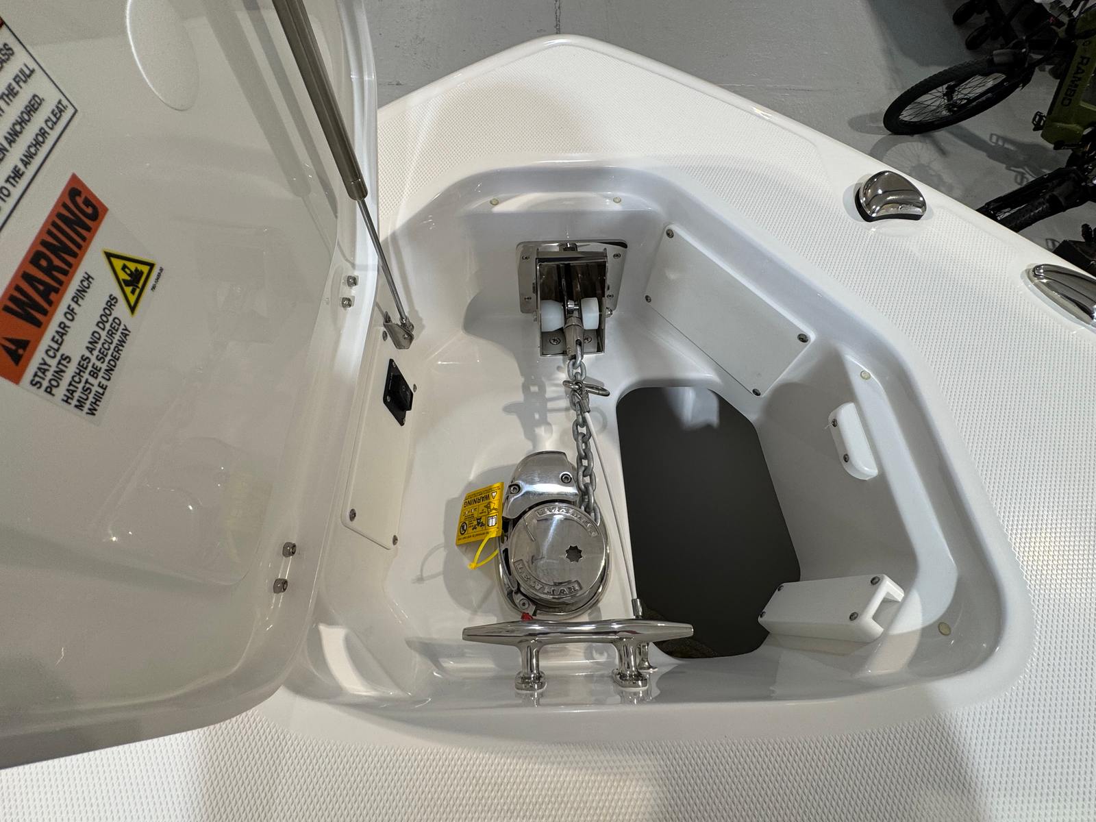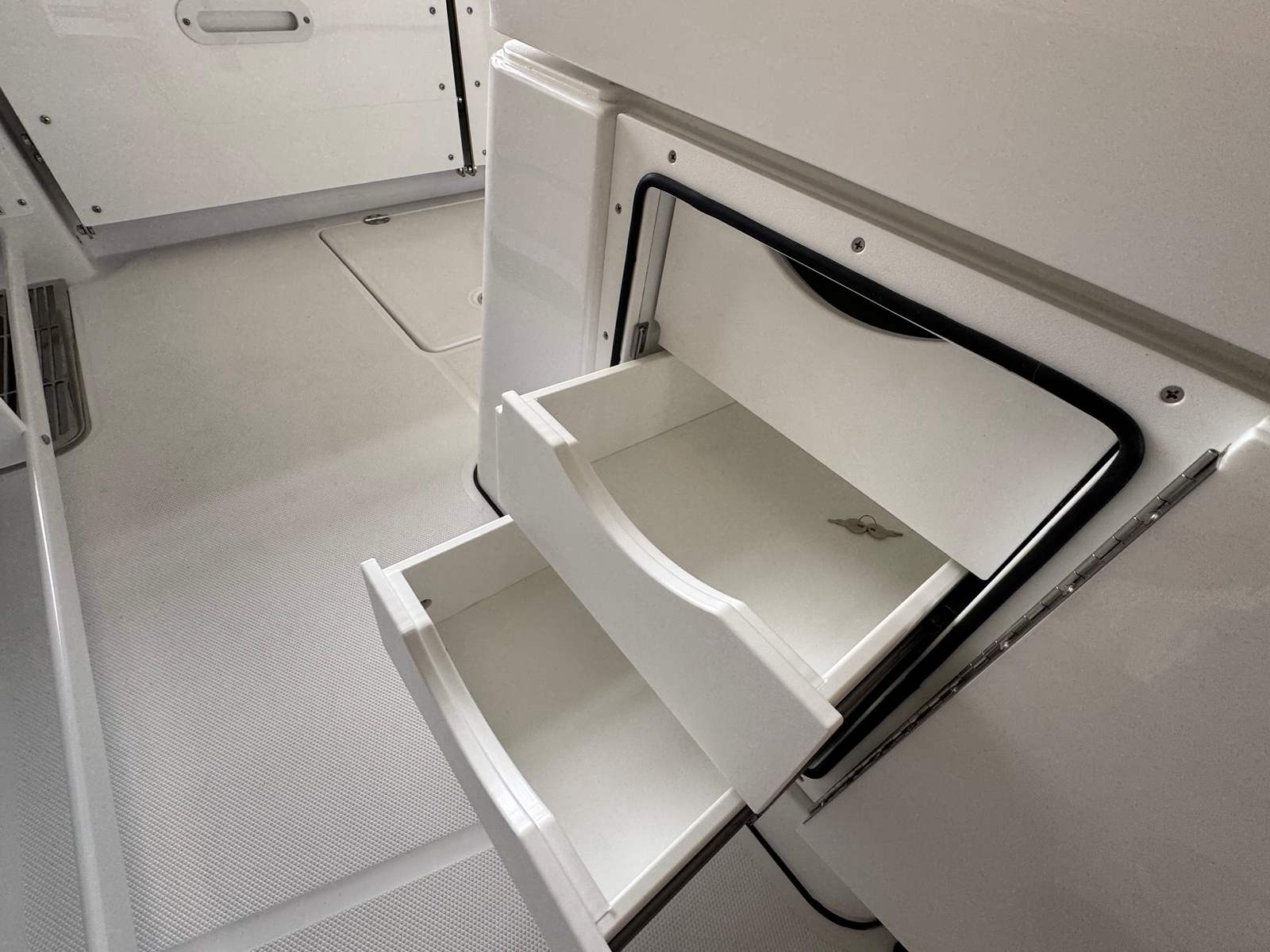 - Fishing Package - storage unit located under the helm seat on the port side, (storage excluded with SK1 option), second live well with pump (replaces aft port cooler box), rod/cup holders at helm seat (2)