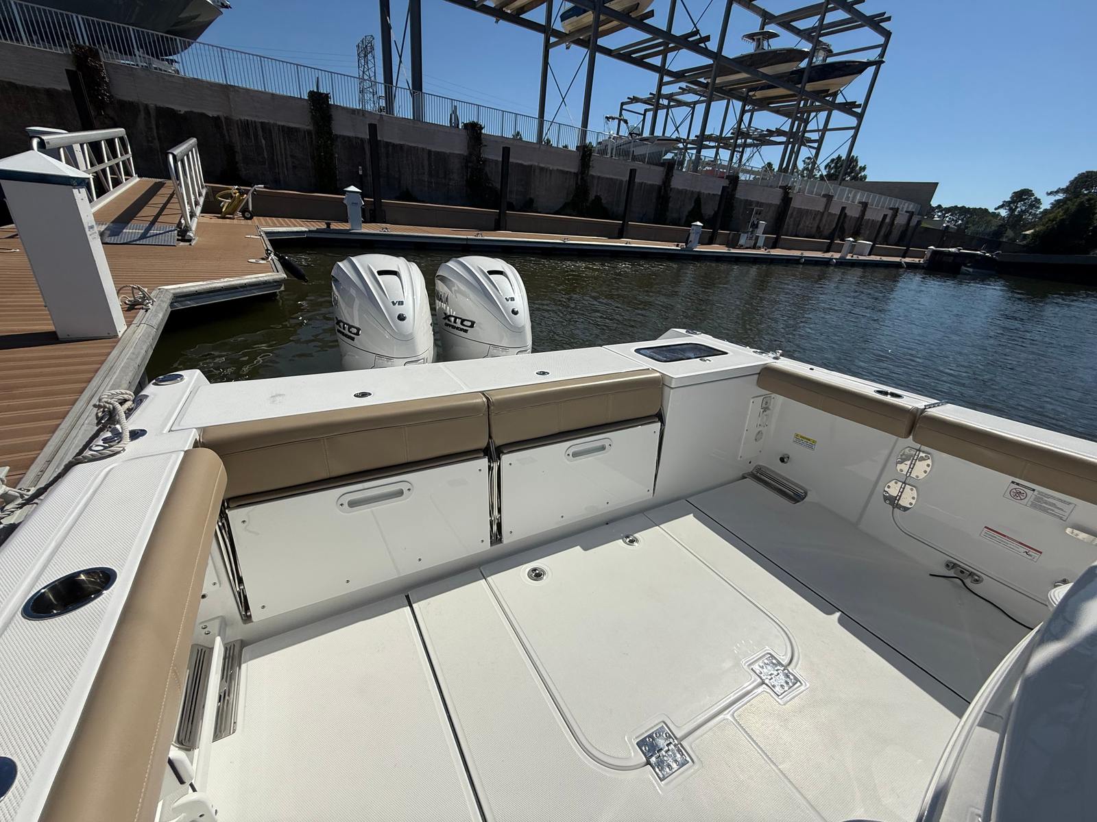 Power and precision are at the heart of the Everglades 335 CC. Equipped with twin Yamaha F450 engines in a striking white finish, this boat delivers a combined 900 horsepower, ensuring exhilarating speed and responsive handling. Whether you are cruising to your favorite sandbar or heading offshore for a day of fishing, the 335 CC’s robust powertrain provides the confidence and performance you need. The advanced autopilot and joystick controls for Yamaha EX at both the main and upper stations make navigation effortless, allowing for smooth docking and precise maneuvering in any conditions.