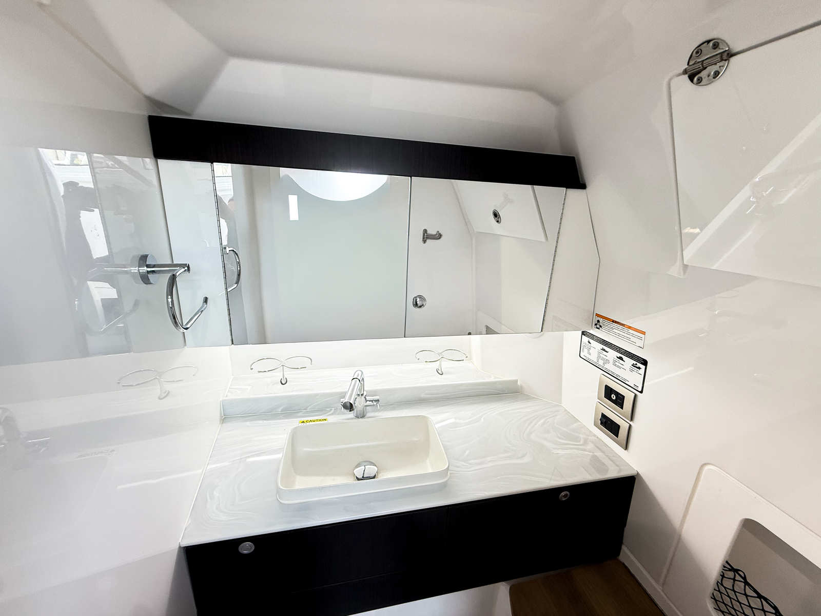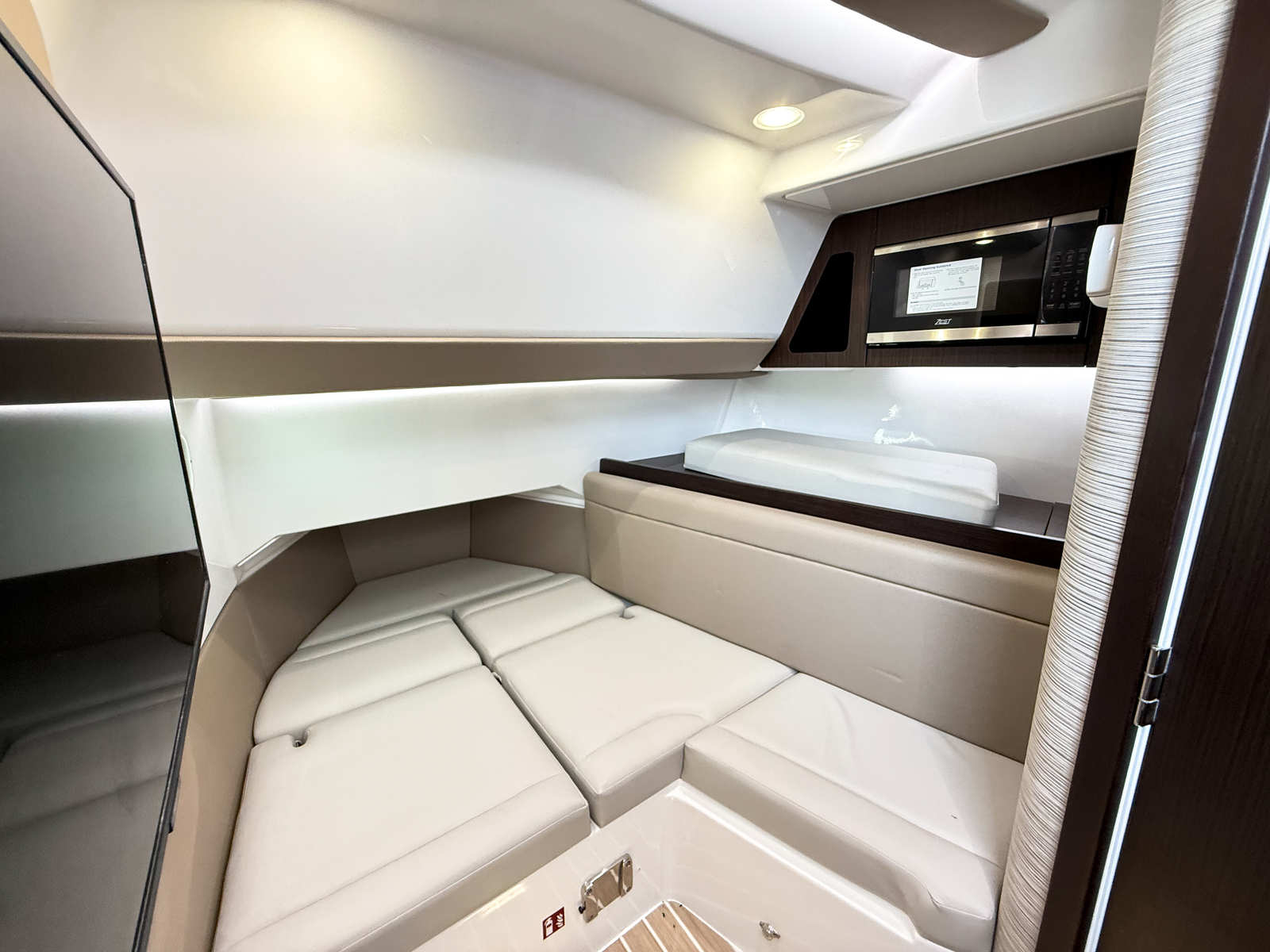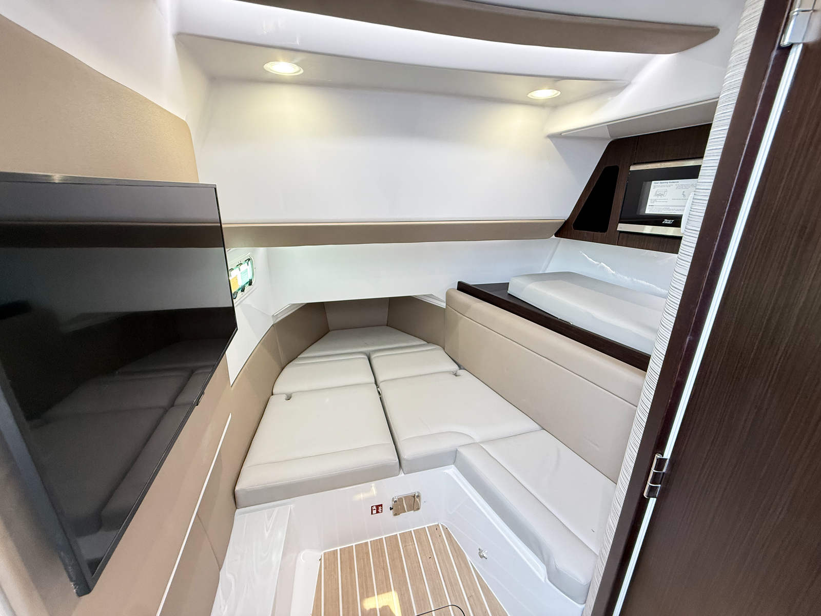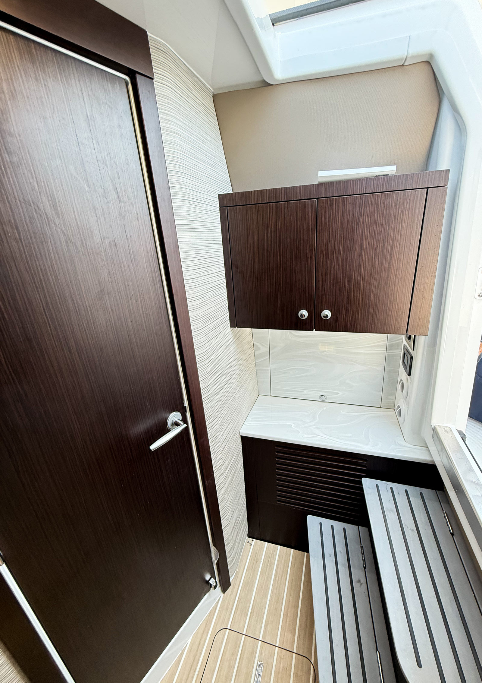 - Interior - Décor Upgrade – Adds additional interior accent panels, wood grained interior steps with storage, additional cabinet storage with doors, LED lighting with multiple color selections, Italian leather upholstered black steering wheel w/ white stitching, teak toilet seat cover, teak shower grate