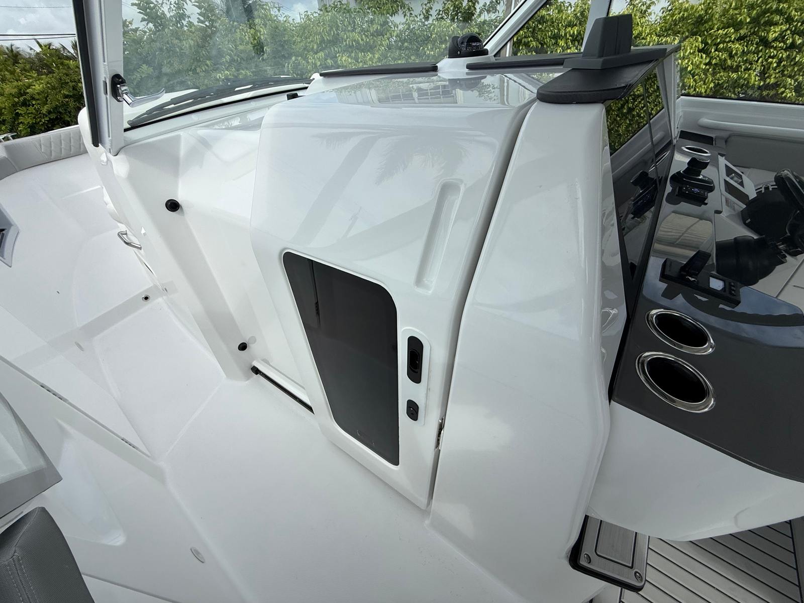 - **Carbon Fiber Steering Wheel Upgrade**: Enjoy a lightweight and durable steering experience with the premium carbon fiber steering wheel. - **Electrically Actuated Skylight and Retractable Cockpit Shade**: These features provide optimal lighting and shade control, allowing you to customize your comfort effortlessly. - **Hardtop Mounted and Electrically Actuated**: The hardtop is equipped with a Mediterranean bow shade and a triple low-profile light bar, ensuring both functionality and style. - **Fishing Package**: Tailored for fishing enthusiasts, this package includes essential gear and storage solutions to make your fishing trips more enjoyable. - **Electrically Actuated Valves on Thru Hulls**: Seamlessly manage your waste system and generator with the integrated valves, enhancing convenience and efficiency. - **Tow Package with Heavy-Duty Tow Eye**: Perfect for towing water sports equipment, ensuring you can bring along your favorite gear with ease. - **Upholstery Color Material Package - Sanibel**: The Sanibel upholstery package adds a touch of elegance and comfort to the interior, making every voyage a pleasure.