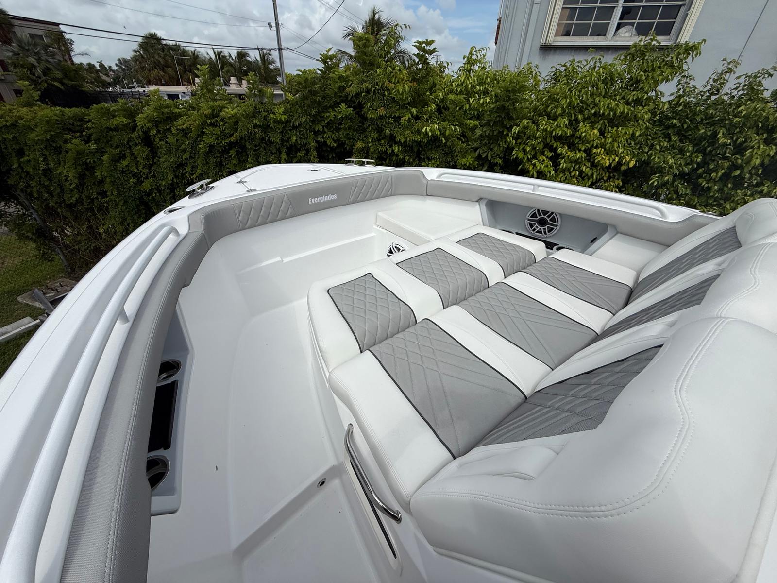 Under the hood, the Everglades 367 CX is powered by Yamaha Twin 450HP engines, delivering an impressive total of 900 horsepower. This powerhouse duo ensures exceptional speed, smooth handling, and robust performance, making every journey on the water exhilarating. The digital electric steering system enhances maneuverability, providing precise control whether you're cruising along the coast or navigating tight harbors. The white Yamaha engines not only offer powerful performance but also add a sleek, modern aesthetic to the boats overall appearance.