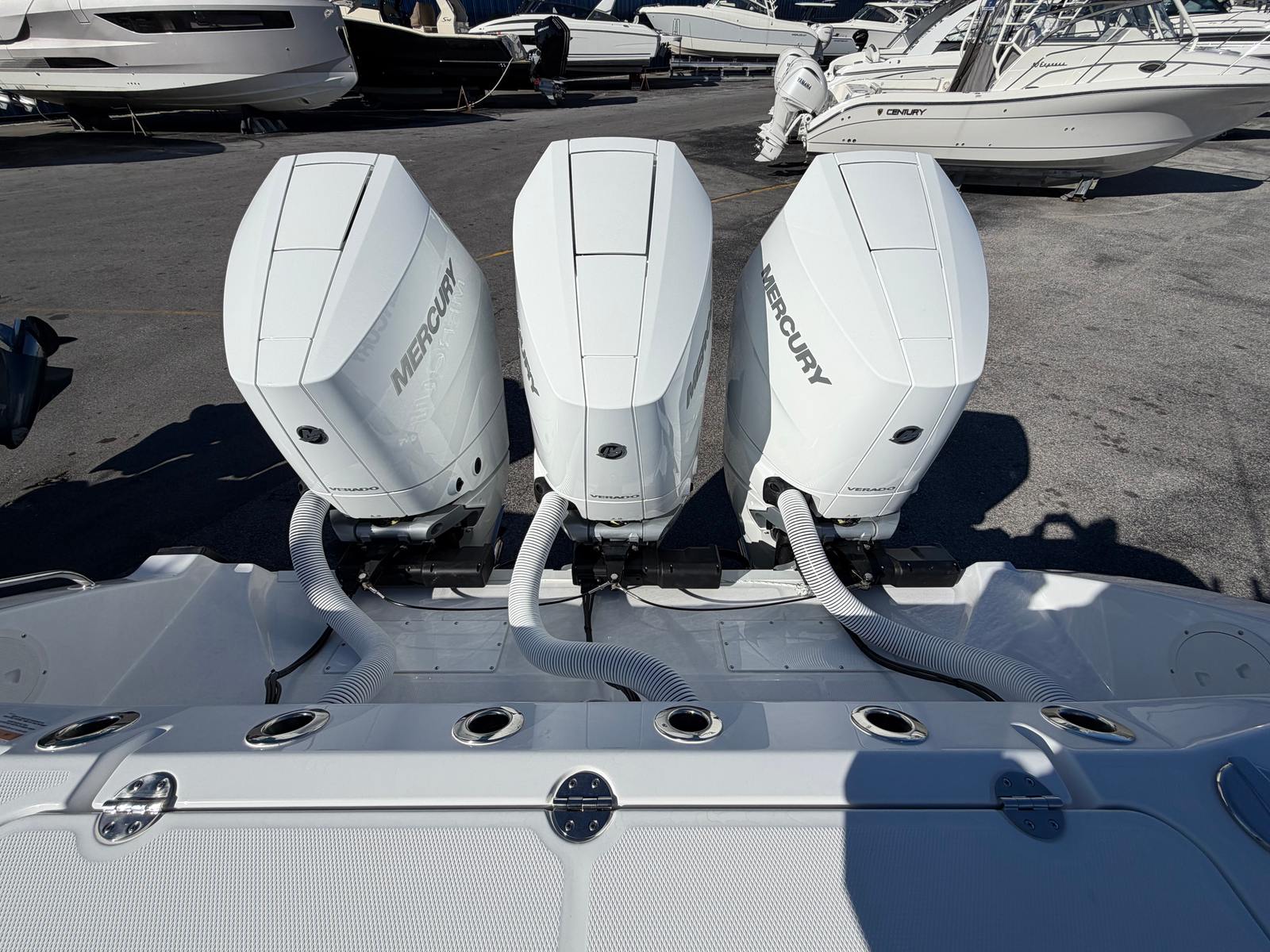 Power and precision are at the heart of the Everglades 375 CC. Equipped with triple Mercury 425 V10 engines, this Center Console boat boasts a combined 1275 horsepower, ensuring exhilarating speed and smooth handling in a variety of conditions. The advanced engine setup provides rapid acceleration and impressive top-end performance, making it ideal for offshore runs, water sports, or simply cruising along the coastline. Whether you’re navigating choppy waters or gliding across a calm bay, the Everglades 375 CC offers a responsive and stable ride that inspires confidence. The triple-engine configuration also enhances maneuverability, allowing for easy docking and tight turns when needed.