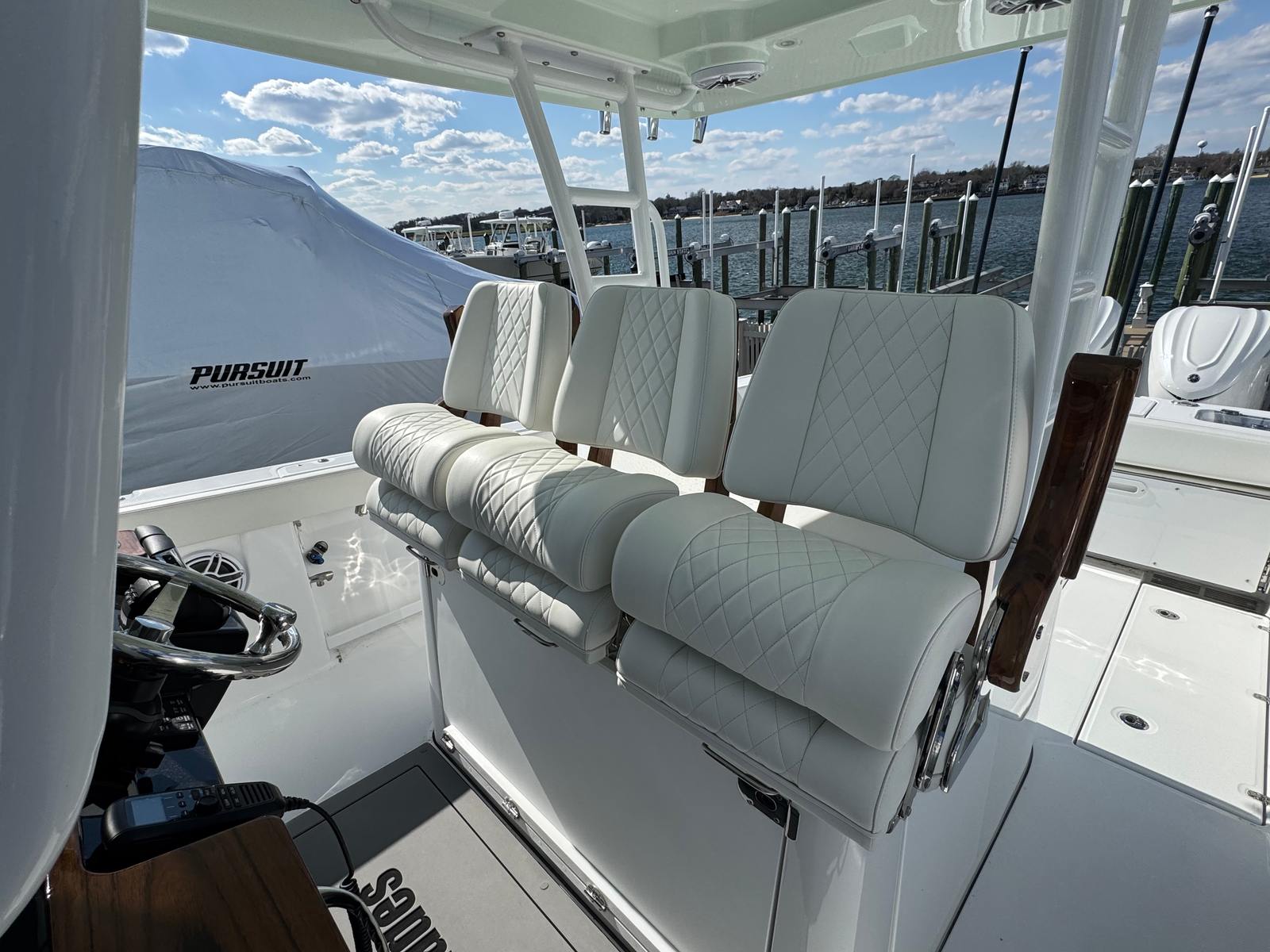 - Helm Seat Upgrade - Release teak ladder back helm seat pkg (3) with sliders. Replaces triple Pompanette helm seats