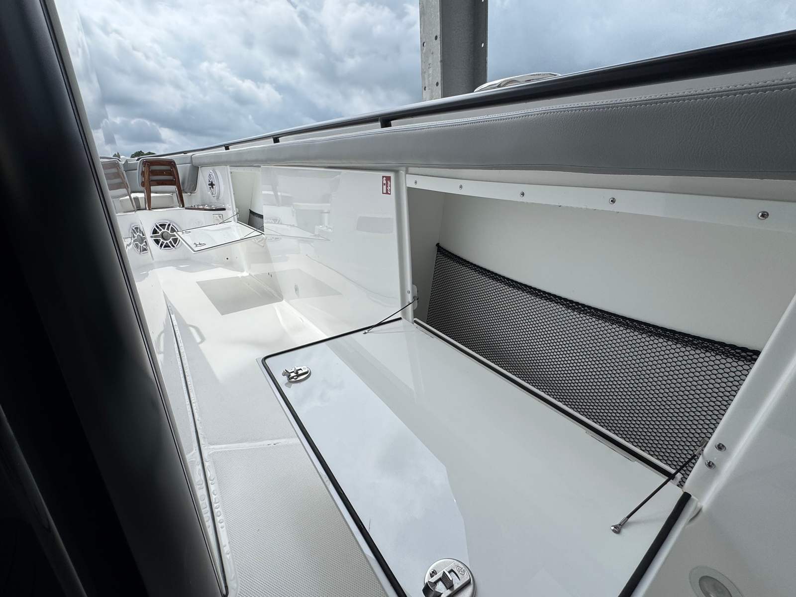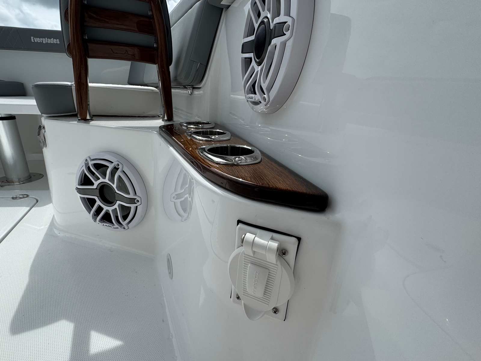 The Everglades 395 CC is loaded with premium features that enhance both functionality and luxury. The Lumitec Lightbar and a set of three spotlights provide superior visibility for early morning departures or nighttime returns, ensuring safety and convenience. The Canvas Package, including an upper station, seat, and console, is finished in a striking black color, offering both protection from the elements and a sophisticated aesthetic.For those who demand comfort at the helm, the shock-mitigating helm seat pedestals (three in total) replace traditional storage drawers, delivering a smoother ride and reducing fatigue during long journeys. The black powder coating extends to the radar and satellite (if chosen), adding a sleek, unified look to the vessel’s profile. The carbon fiber steering wheel upgrade offers a tactile, high-performance feel, while the engine flushing system simplifies maintenance and extends engine life.Teak accents, featured on the dash, cup holders, and armrests, add a touch of classic elegance, especially when paired with the bright finish and Flint Gray upholstery. The Makefast powered awning provides instant shade and comfort, allowing you to create the perfect environment for relaxation or entertaining guests.