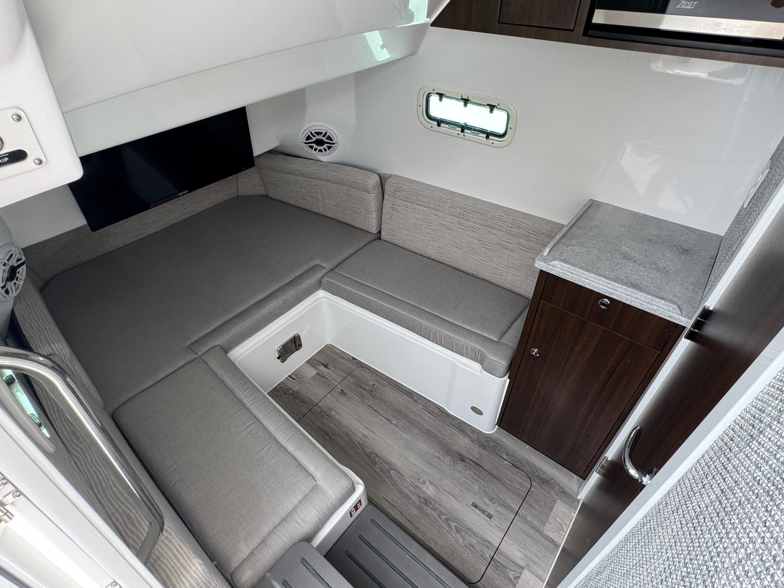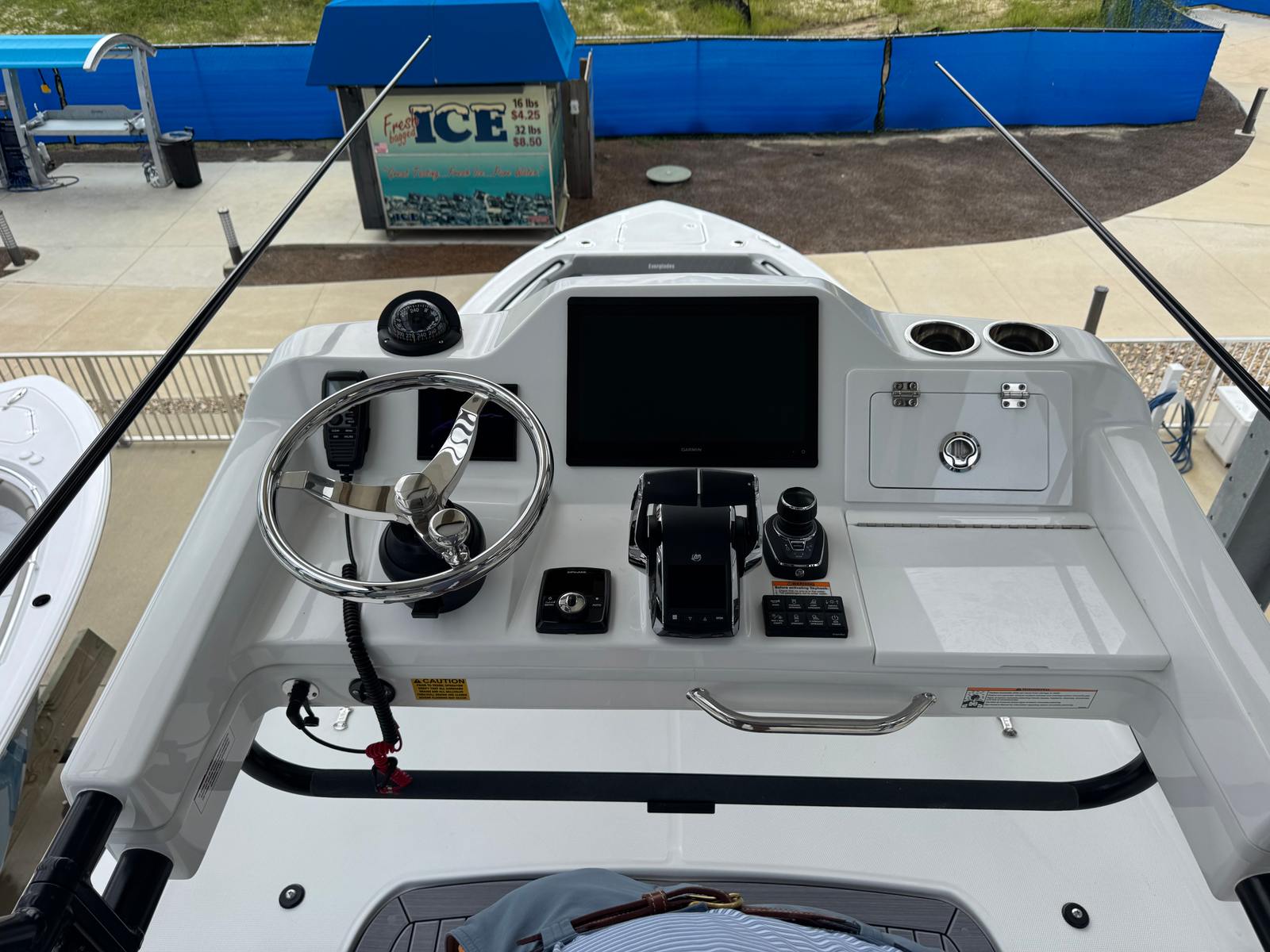 - Full Upper Station - w/ auto pilot and joystick, sun top, 2 drink holders, folding helm seat bolsters, stainless steel grab rail, glove box, Garmin GHS 11 handset, Garmin 8616 additional screen