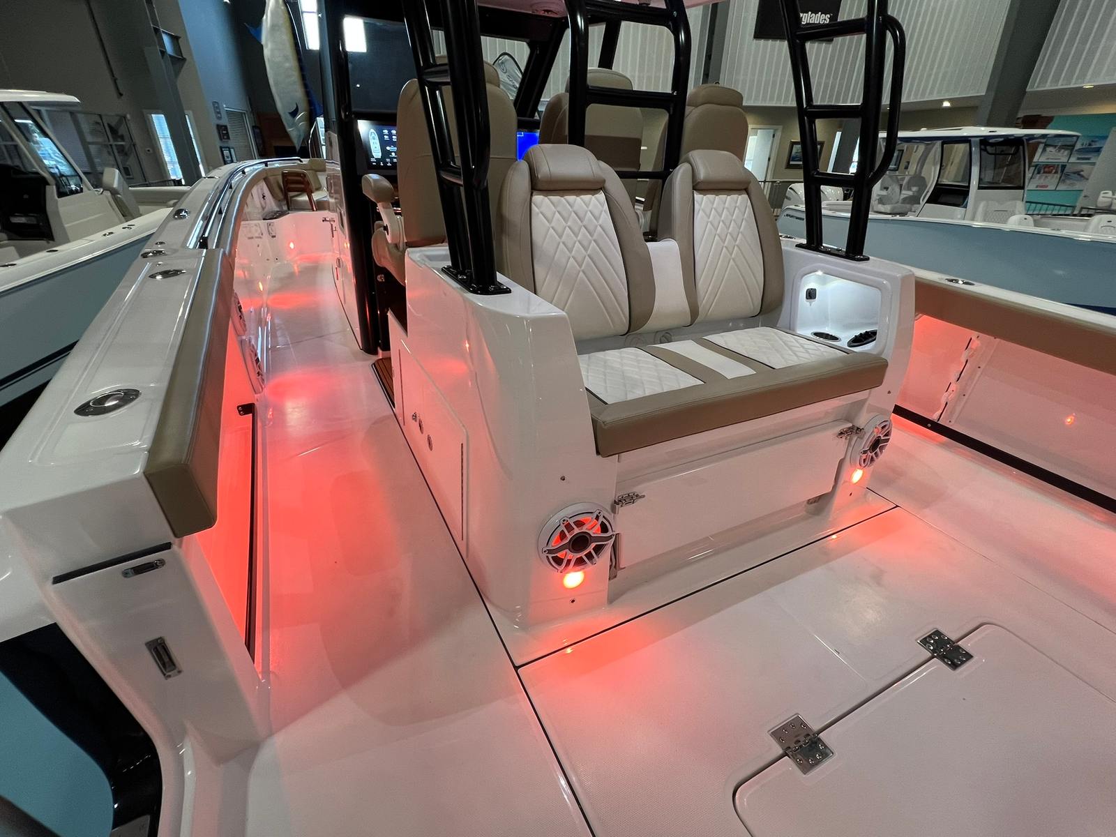 This Everglades boat for sale is the ultimate choice for a wide range of boating activities. Imagine setting out early for a deep-sea fishing expedition, with the upper station giving you a clear view of the action and the powerful engines ensuring you reach your favorite spots quickly. Or picture a relaxing day with family, lounging under the Mediterranean bow shade as you cruise along the coast. The spacious decks and luxurious seating make it easy to host gatherings, celebrate special occasions, or simply unwind in style. Whether you are an avid angler, a social butterfly, or someone who appreciates the finer things in life, the Everglades 395 CC adapts to your needs and exceeds your expectations.