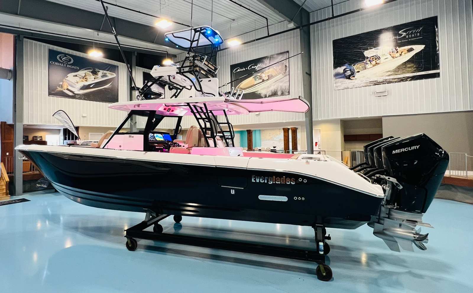 Power and precision define the Everglades 395 CC. Equipped with four robust Mercury 400XL V10 engines, this center console boat boasts a combined 1600 horsepower, ensuring exhilarating speed and responsive handling. The custom paint on the triple 450 engines in Black Panther Metallic adds a bold, distinctive touch that complements the boat’s modern profile. Whether you are chasing the horizon or navigating tight channels, the 395 CC delivers a smooth, stable ride and impressive agility. The advanced hull design enhances performance, providing optimal efficiency and control in a variety of sea conditions.