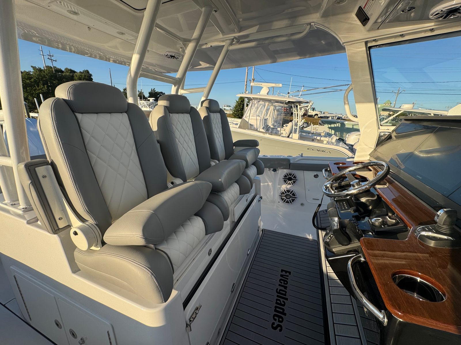 Powering the Everglades 395 CC are three Yamaha Helm Master EX Triple Engine XF450NSA2 outboards, delivering a combined 1350 horsepower. This formidable setup ensures exhilarating acceleration, smooth cruising, and impressive top speeds, making it ideal for both offshore adventures and leisurely coastal excursions. The advanced Yamaha Helm Master EX system features autopilot and joystick controls, offering precise handling and effortless maneuverability, even in challenging conditions. Whether you’re docking in tight spaces or navigating open waters, you’ll appreciate the confidence and control these engines provide.